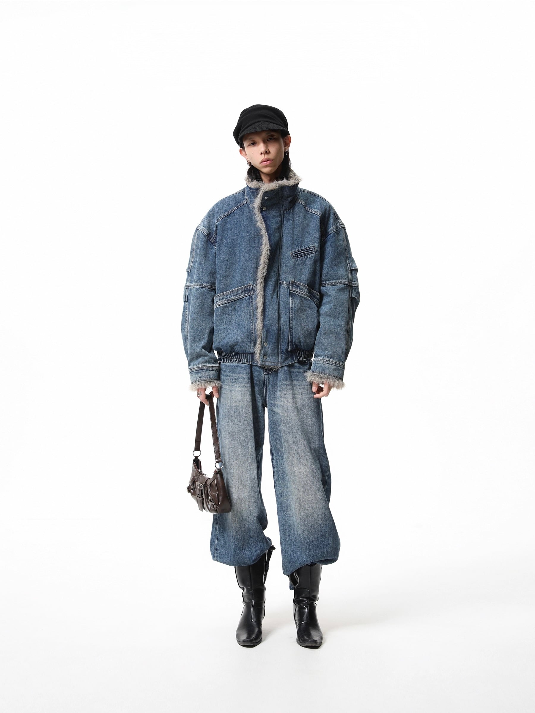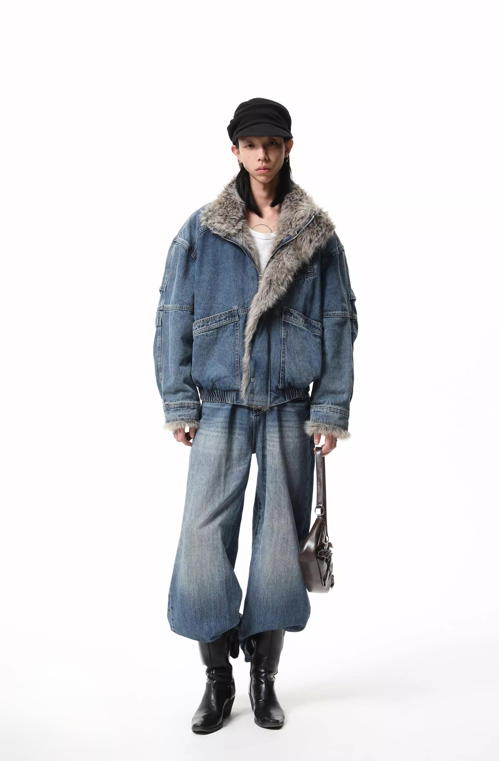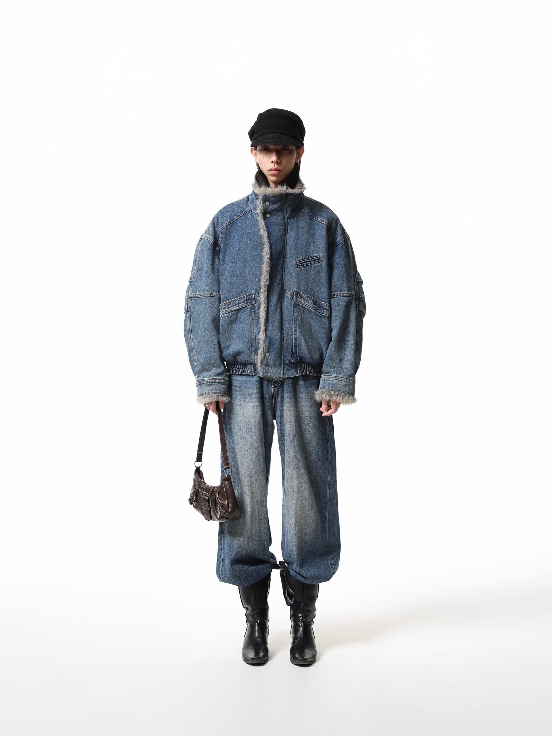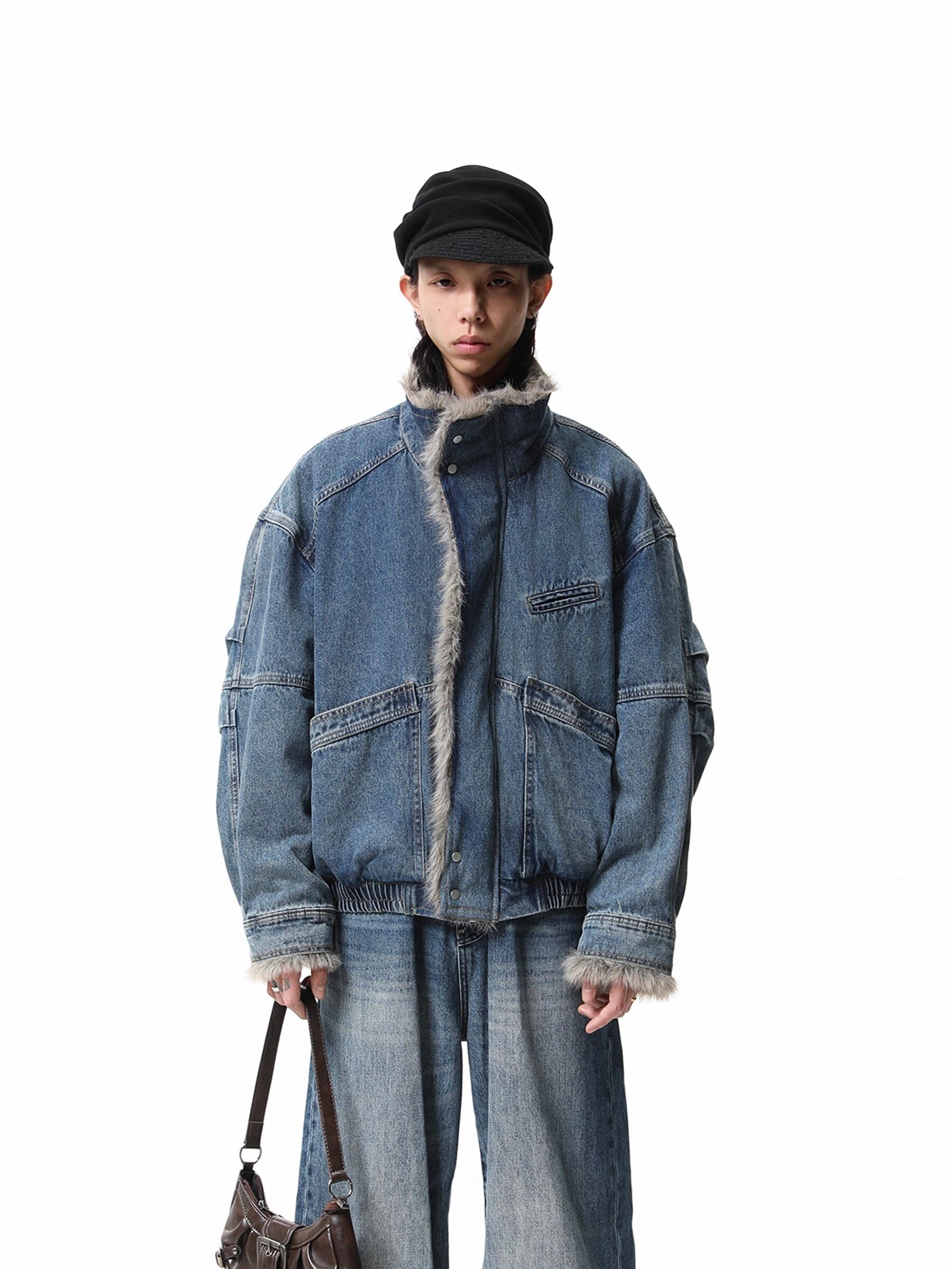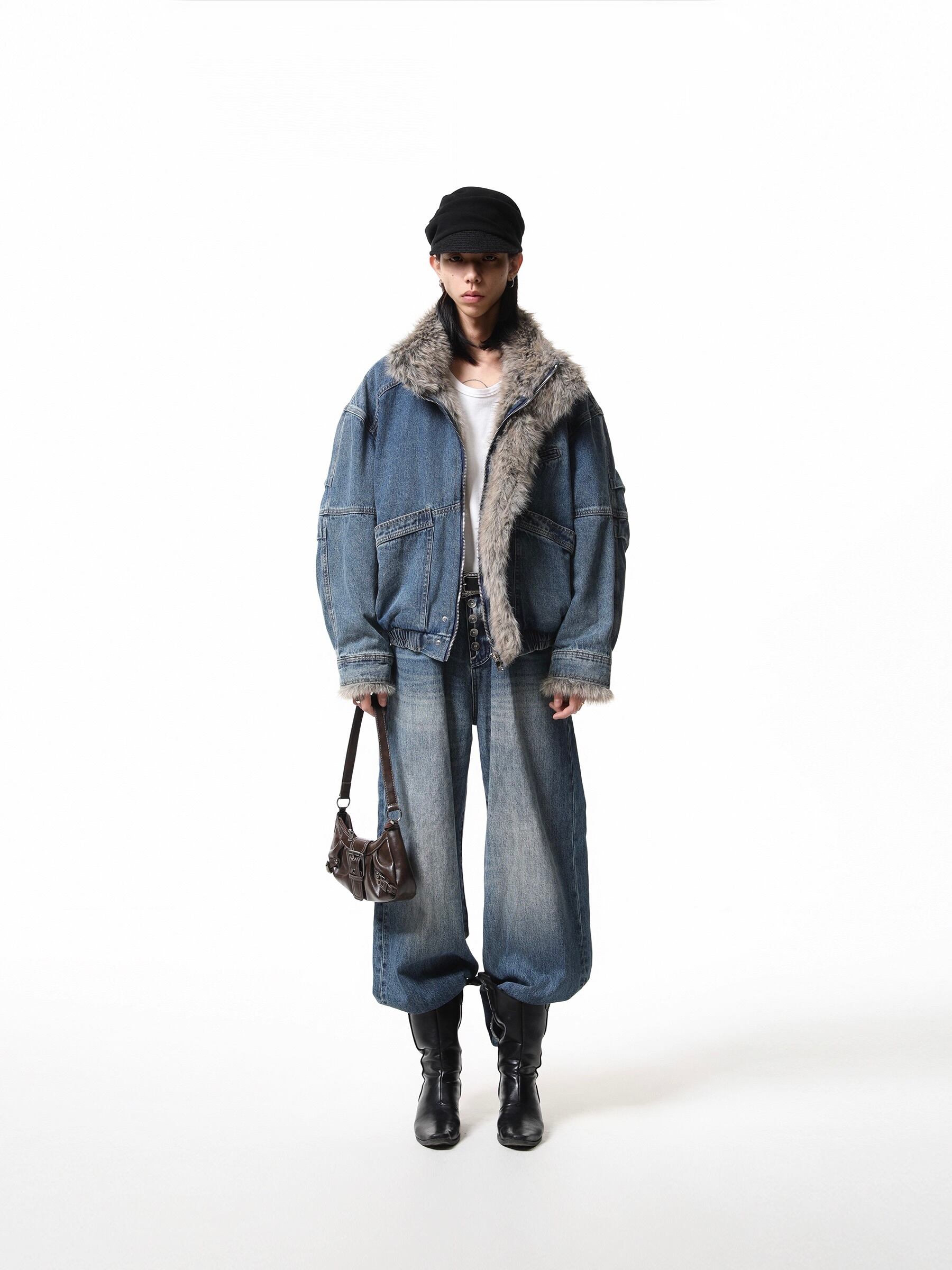重厚感のあるヘビーウェイトなデニム素材に、ボリュームたっぷりのラグジュアリーなファー襟を組み合わせることで、圧倒的な存在感と高級感を演出しています。