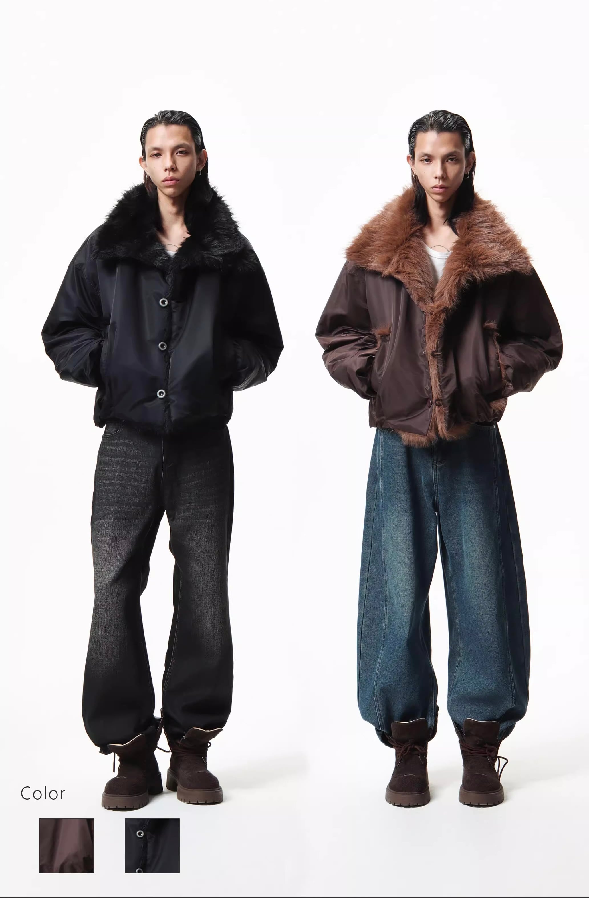 最大の特徴は、首元を包み込むように設計された毛足の長いボリューミーなファー襟。