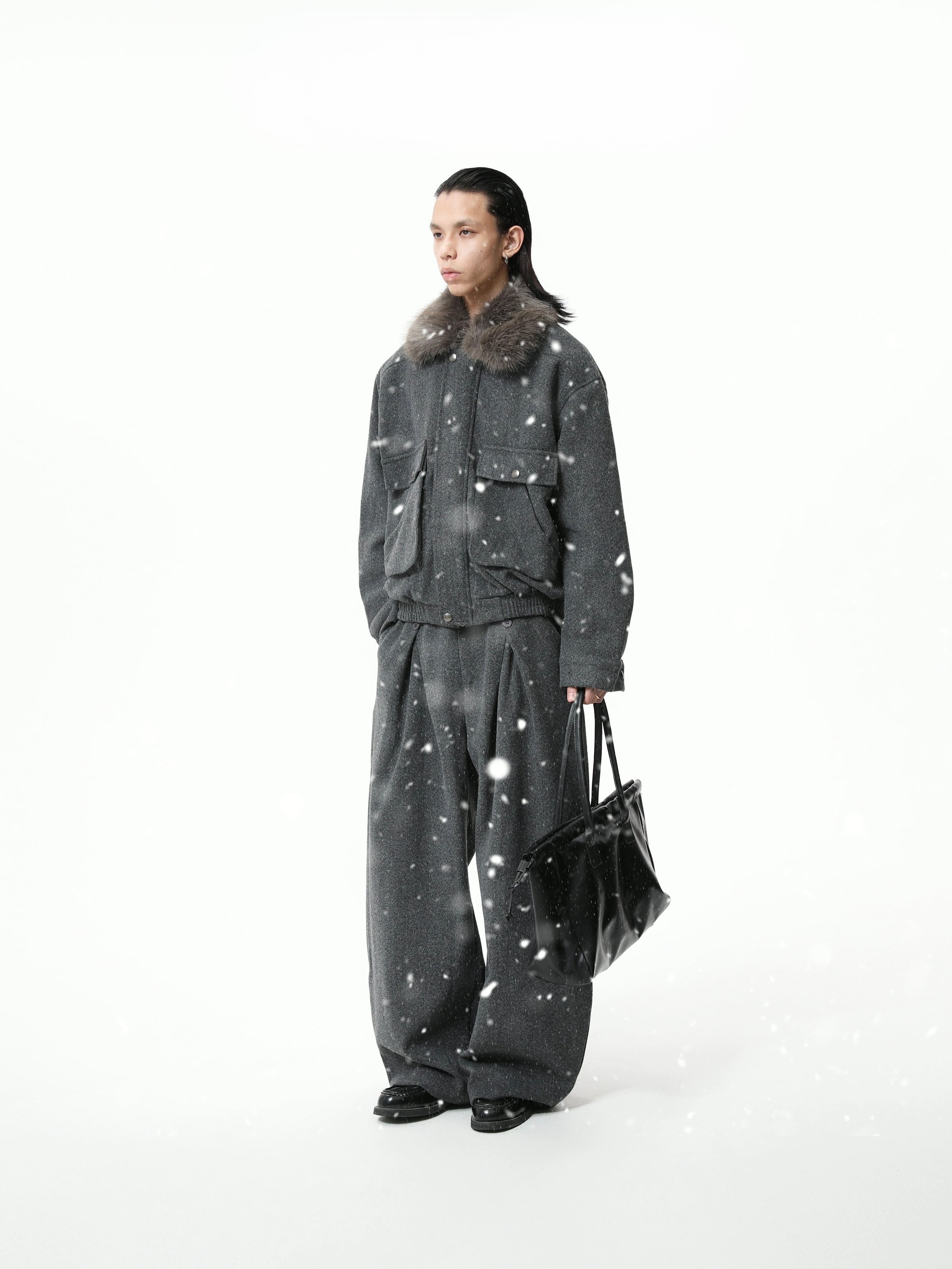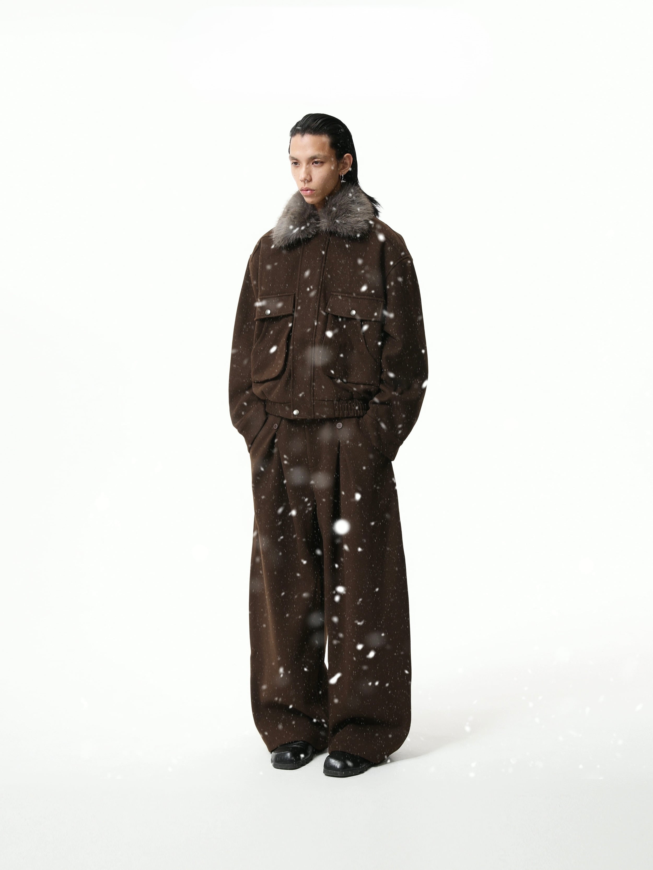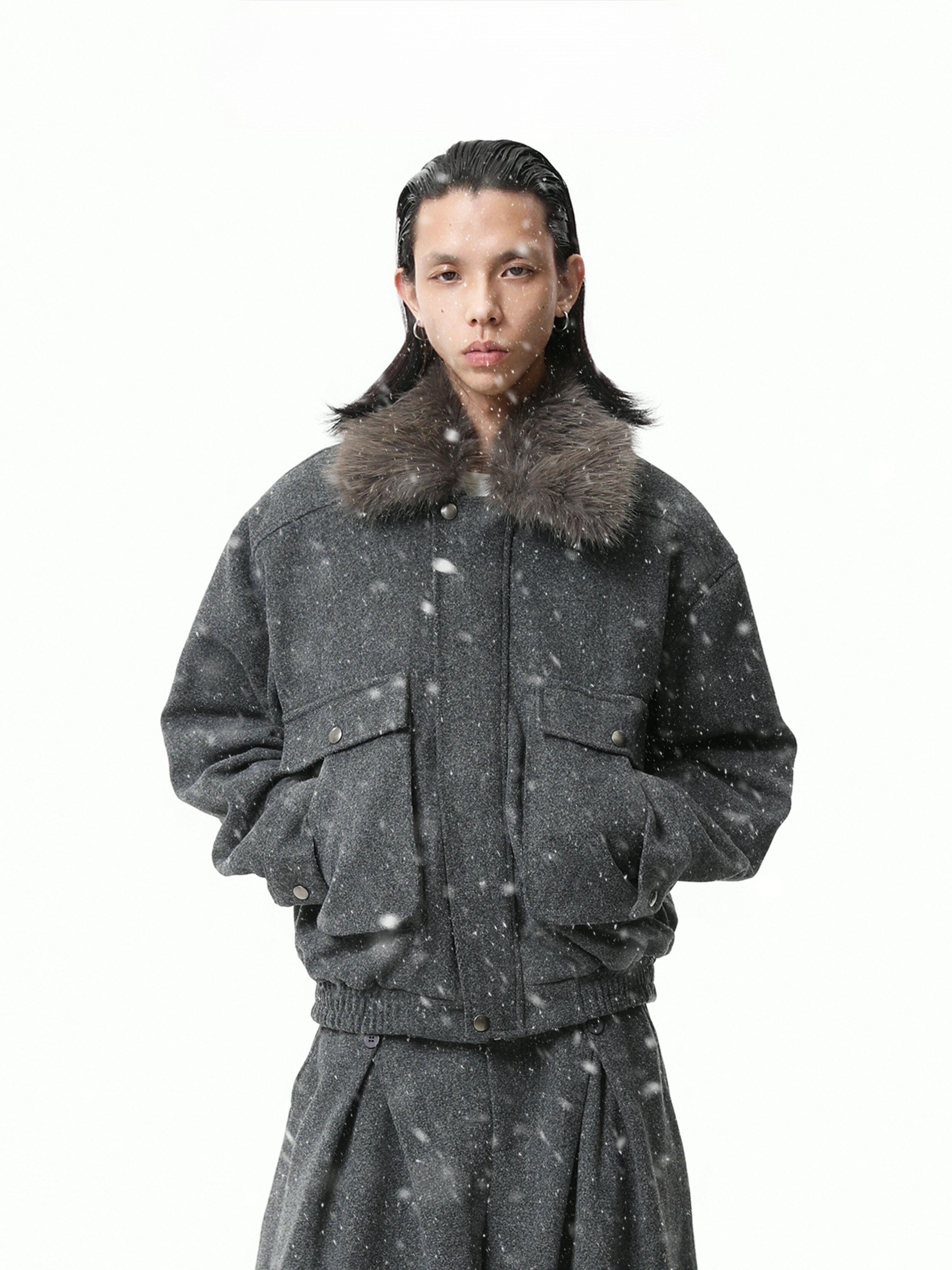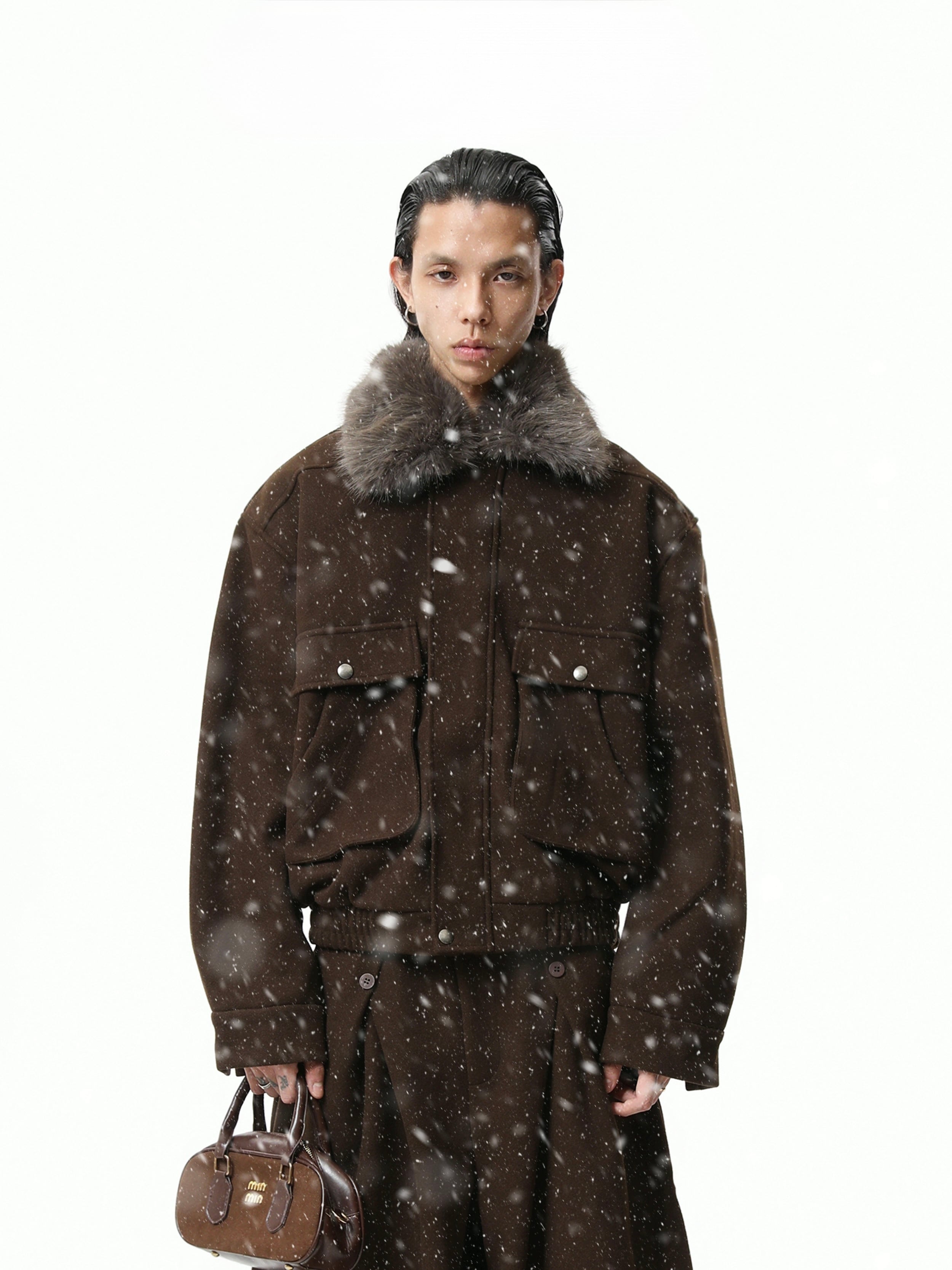 ウール調(毛呢)の重厚な素材感が、冬のスタイリングに深みと高級感を与えます。セットアップはもちろん、単体でも主役級の活躍を見せるアイテムです。