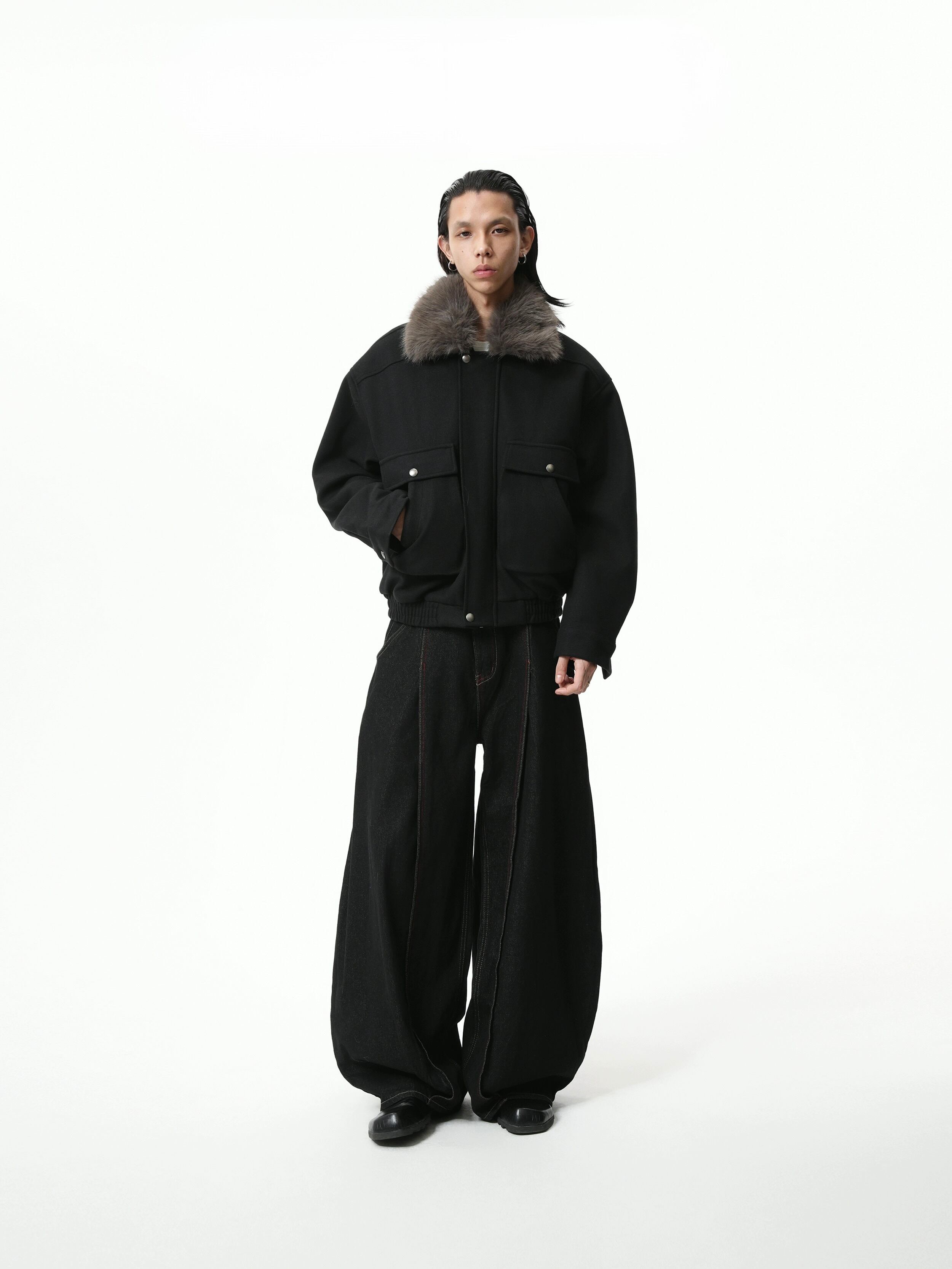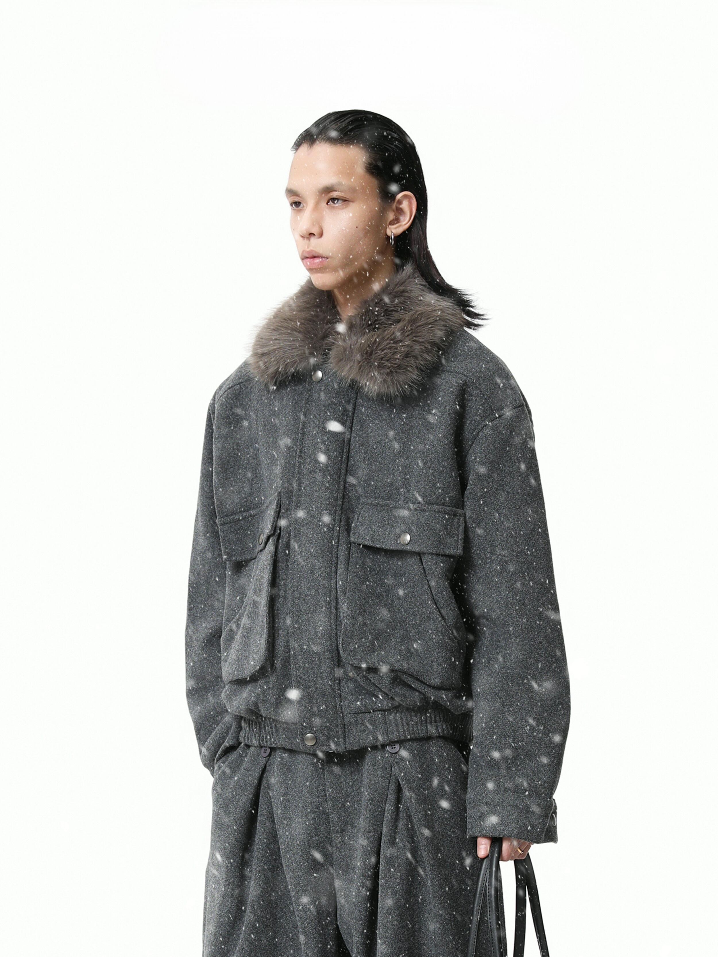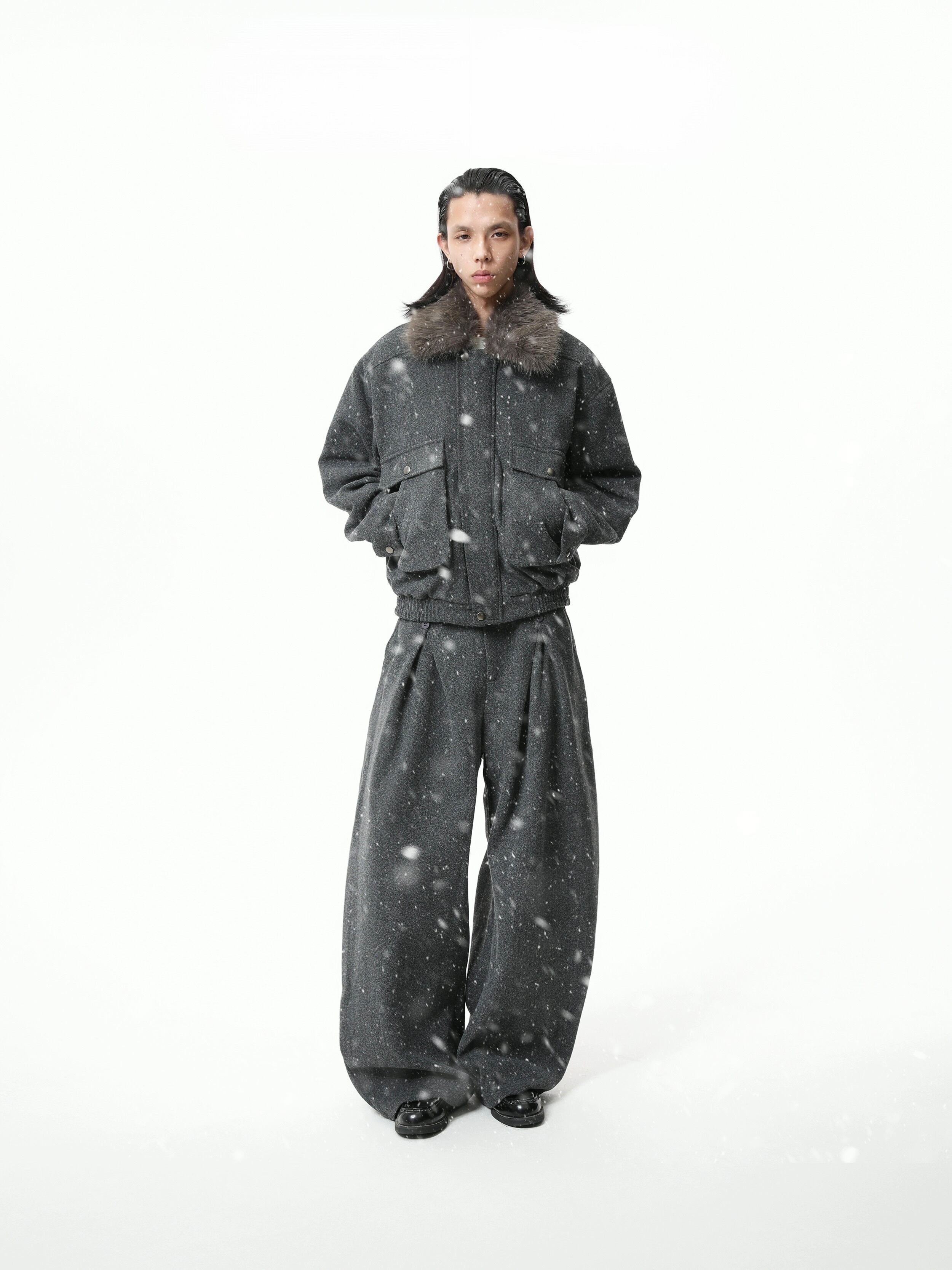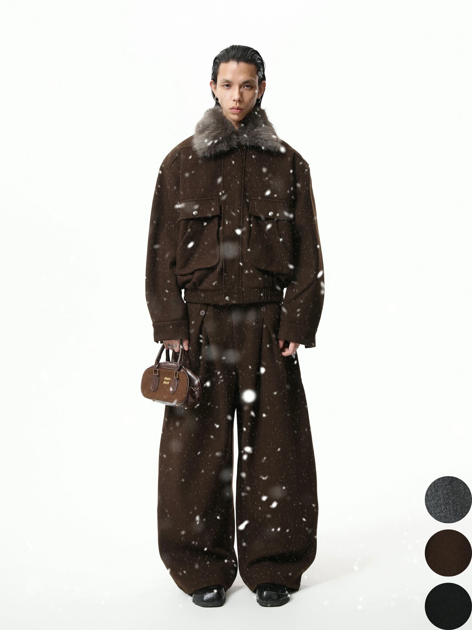 ウール調(毛呢)の重厚な素材感が、冬のスタイリングに深みと高級感を与えます。セットアップはもちろん、単体でも主役級の活躍を見せるアイテムです。