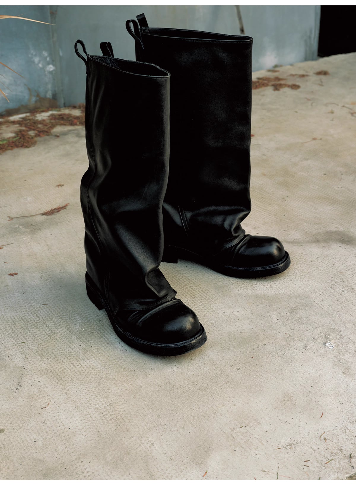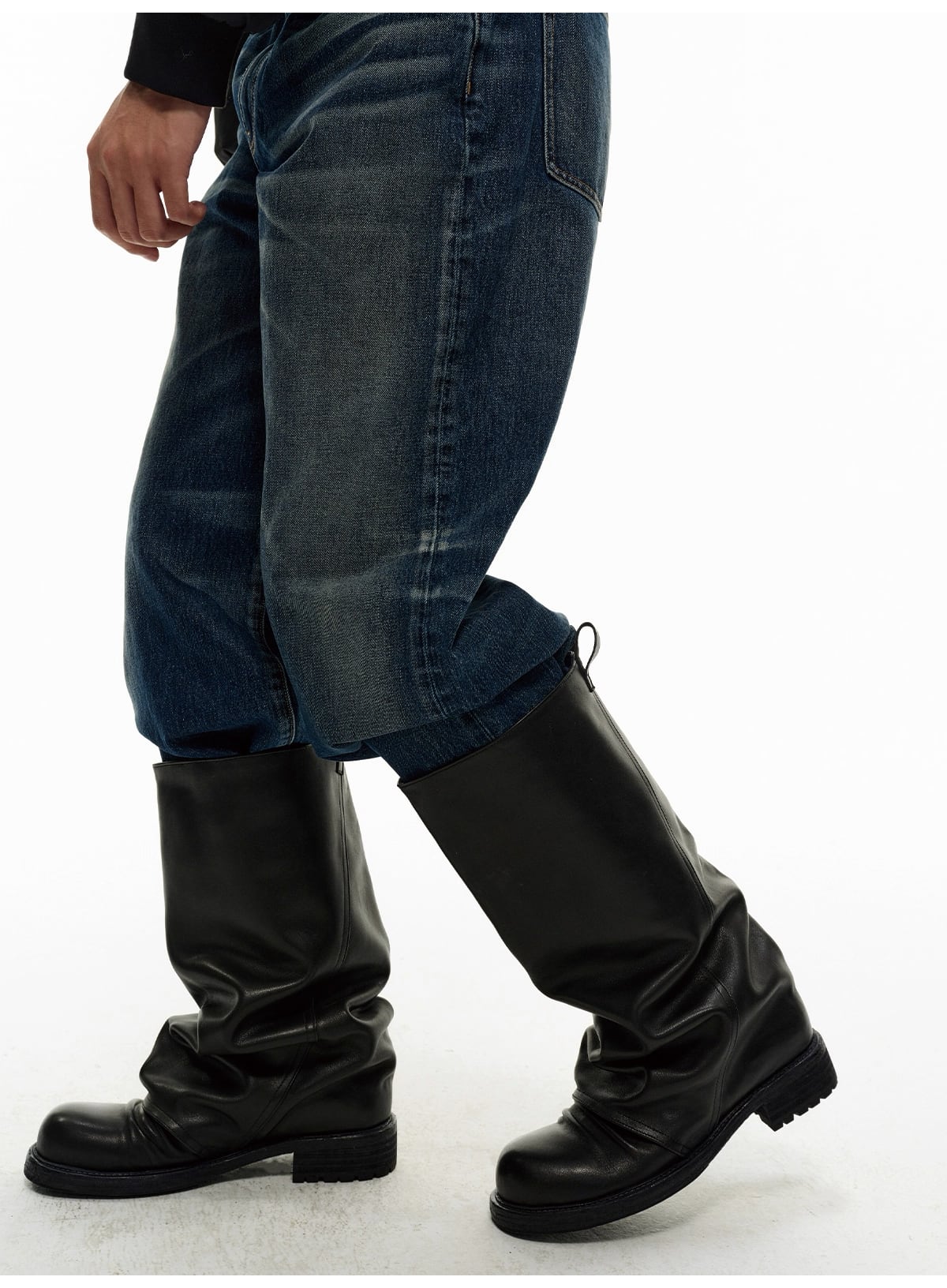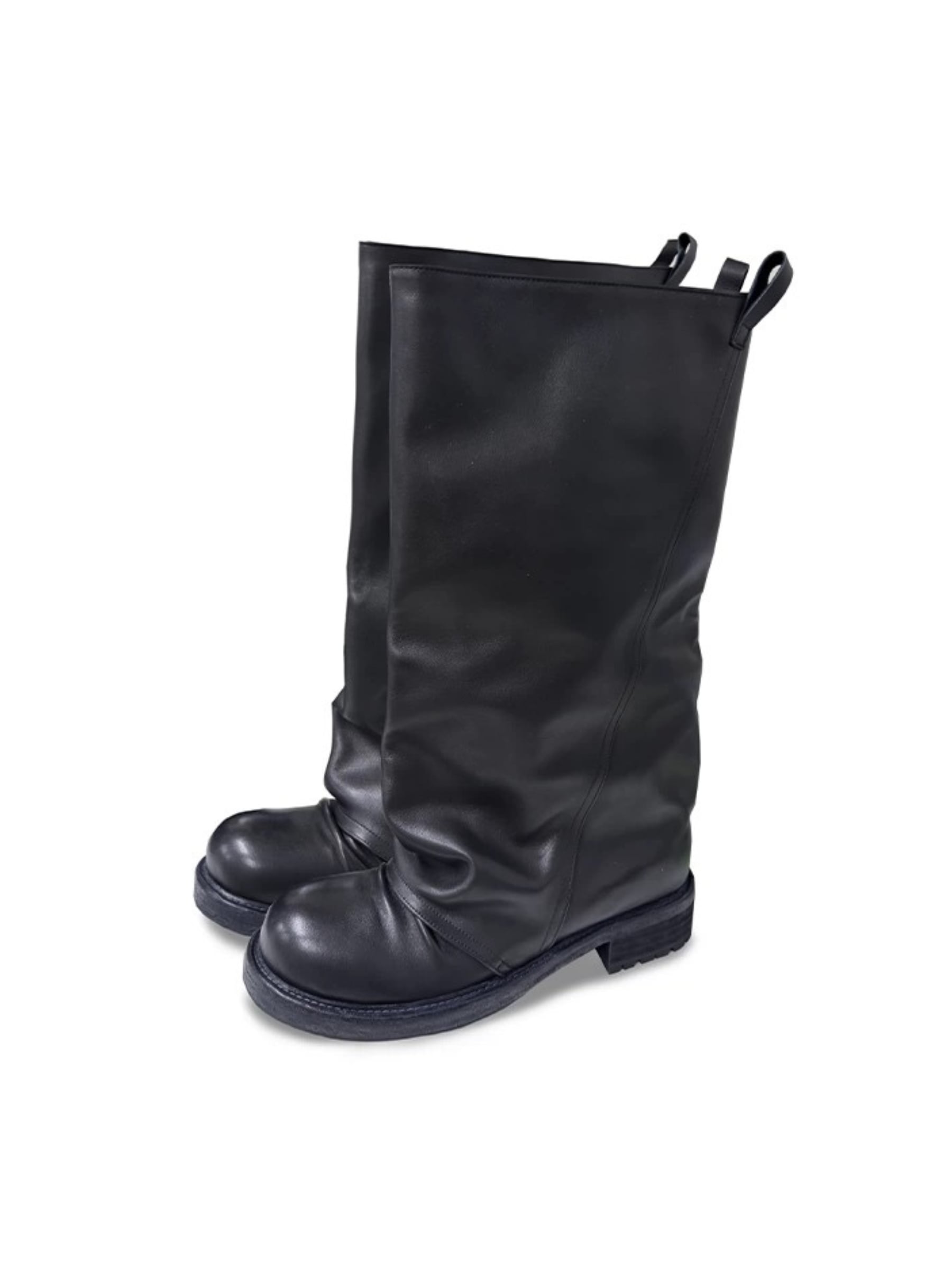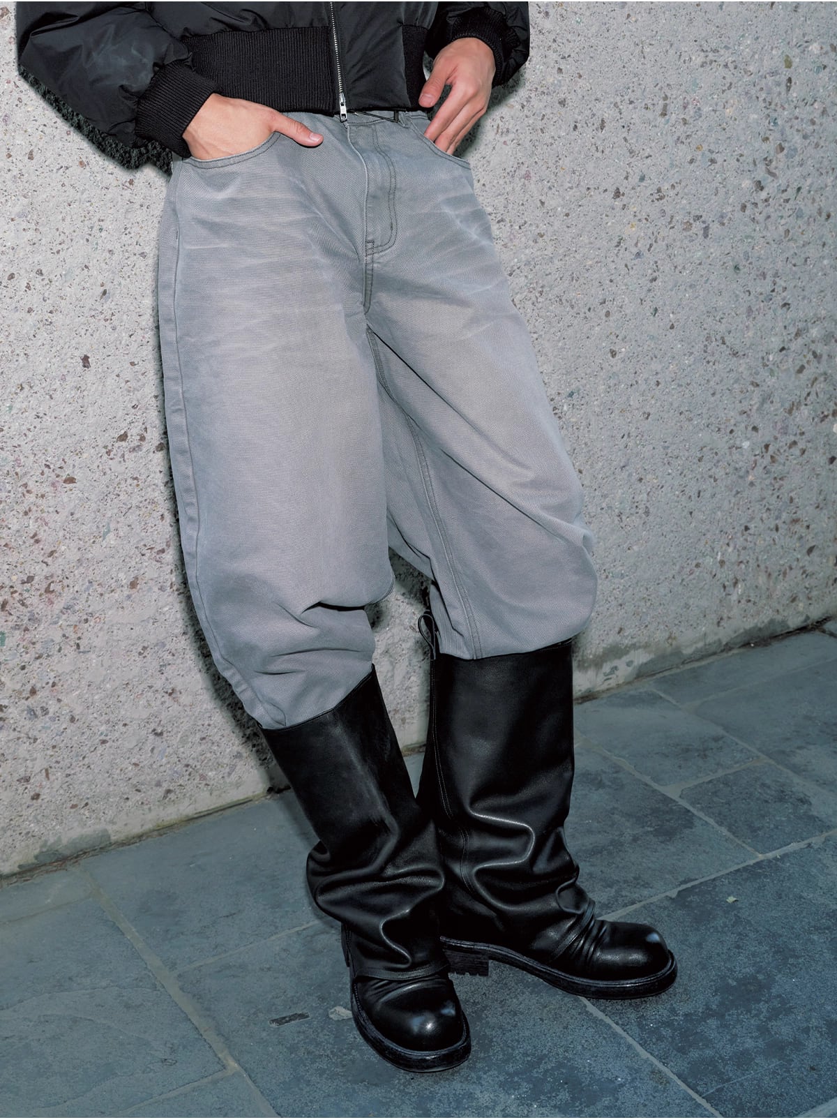 構築的なディテール: ワイドな筒部分は、パンツの裾をインして独特のボリューム感を楽しむスタイリングに最適。