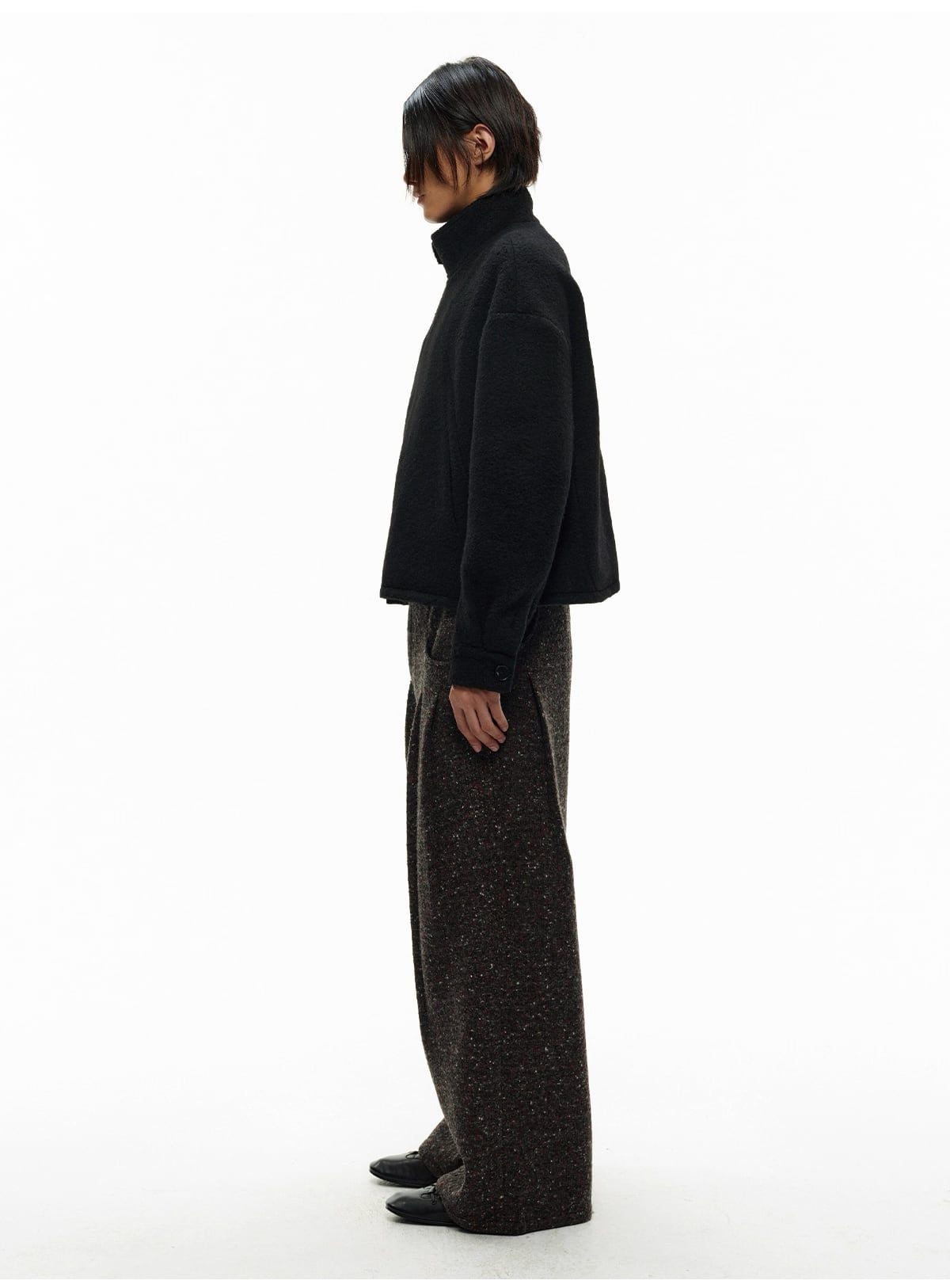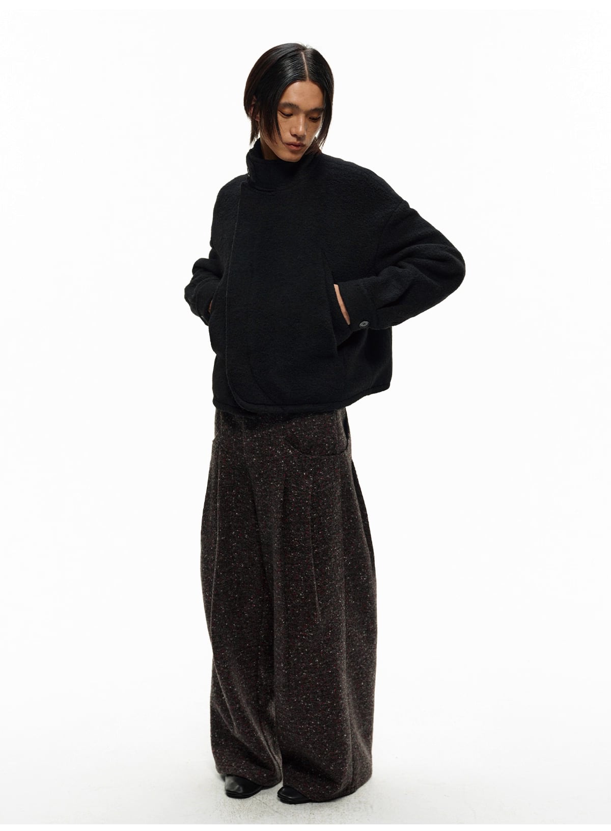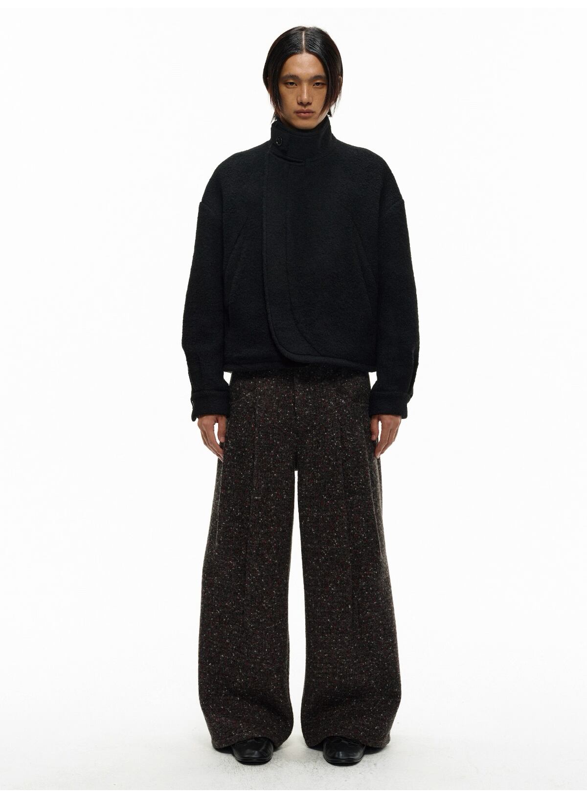 香港発デザイナーズブランド「JCAESAR STUDIO」が提案する、重厚でハリのあるツイードジャカード生地を使用した、存在感抜群のワイドスラックス。