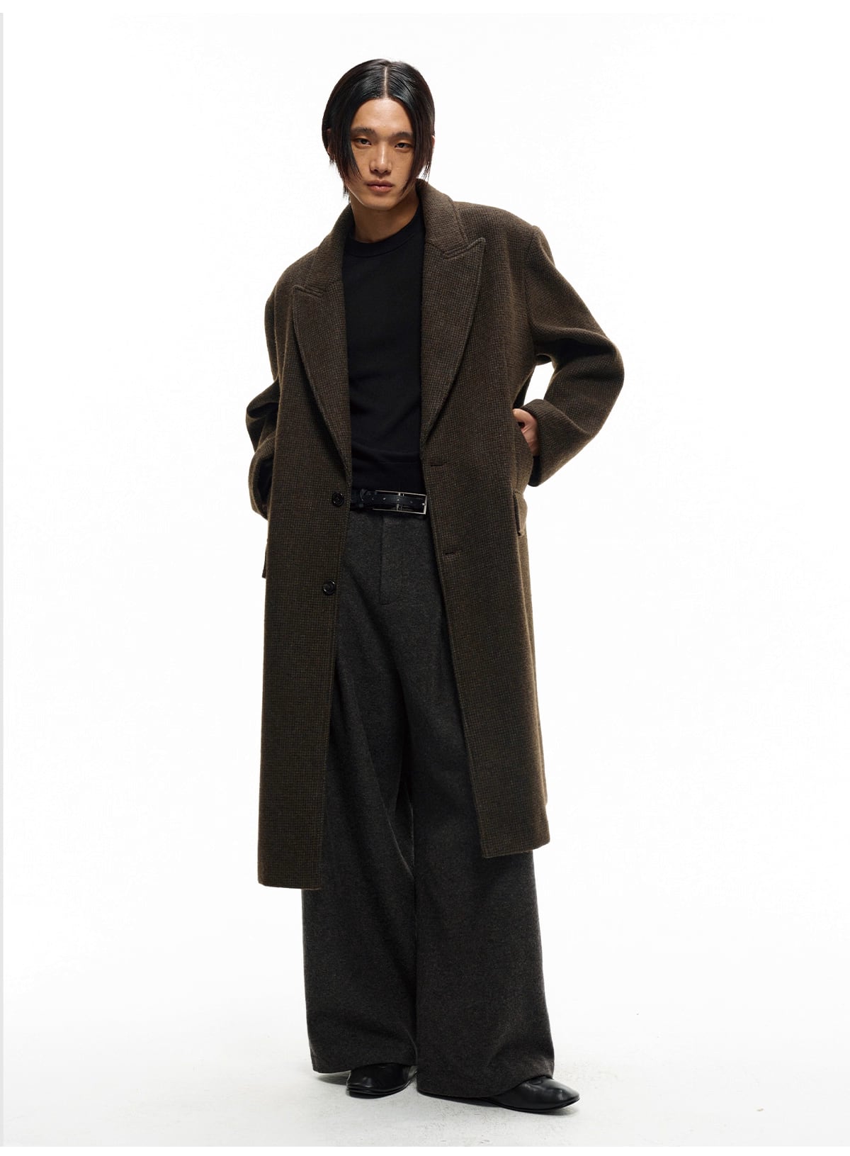 生地の重みと相まって、歩くたびに重厚でモードな雰囲気を演出します。
