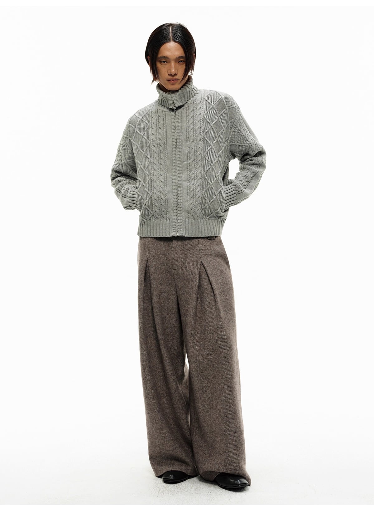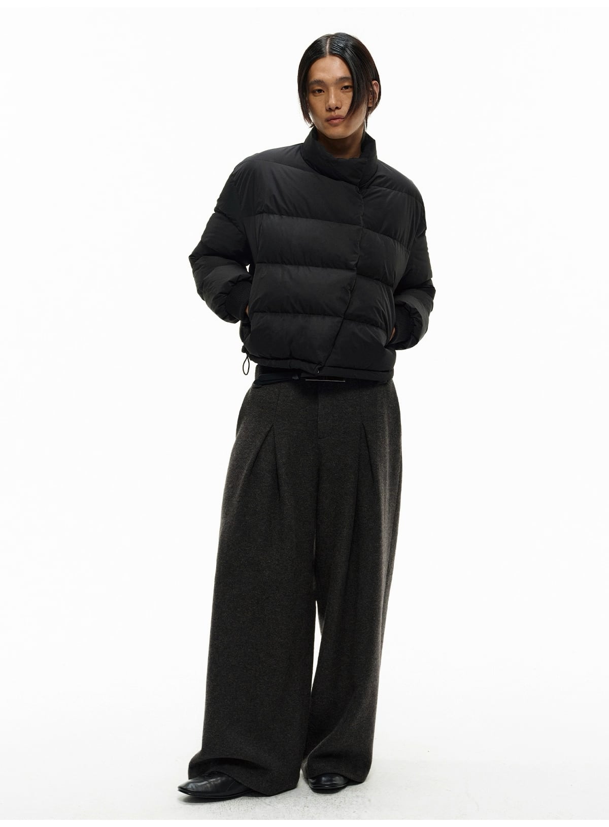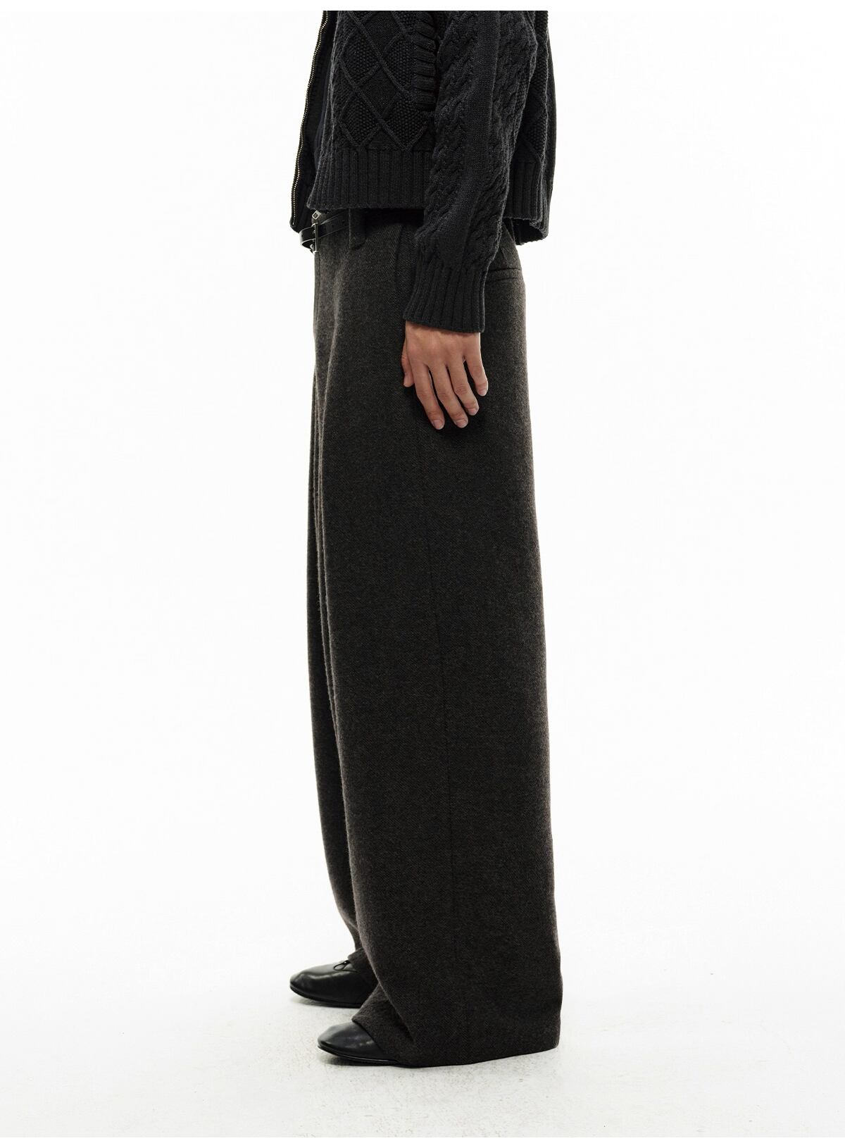 ウエストの深めの「ダブルプリーツ」が腰回りに立体的なゆとりを生み出し、裾に向かってストンと落ちるワイドストレートシルエットを形成。