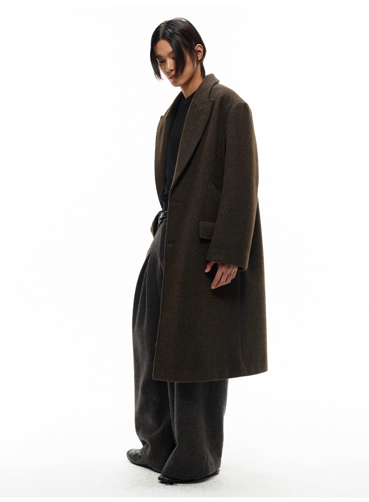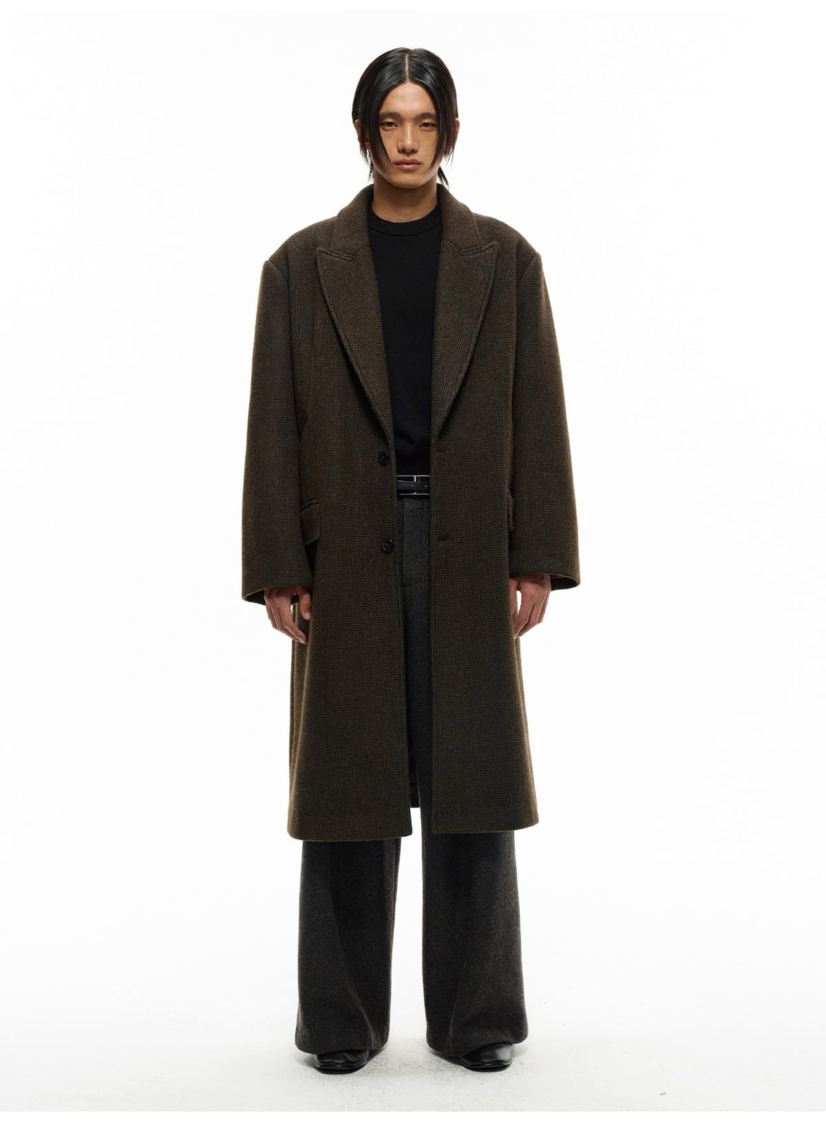 重厚な暖かさと機能美を融合させた、ピークドラペルの千鳥格子ロングコート。