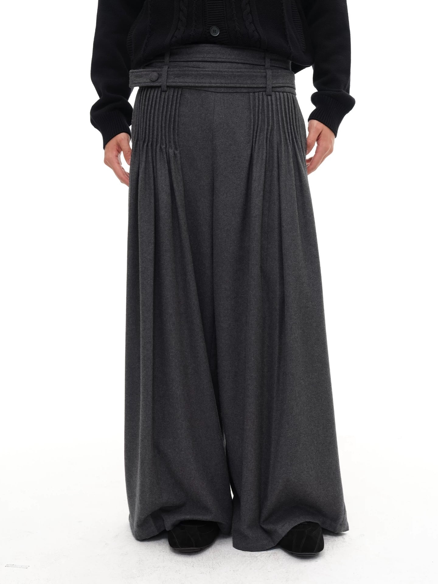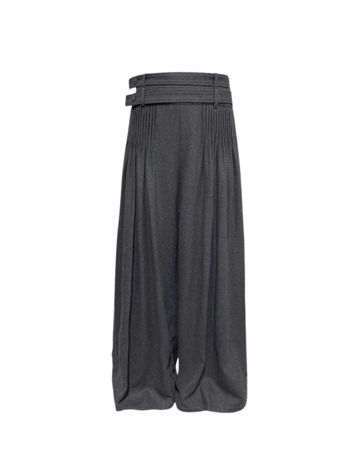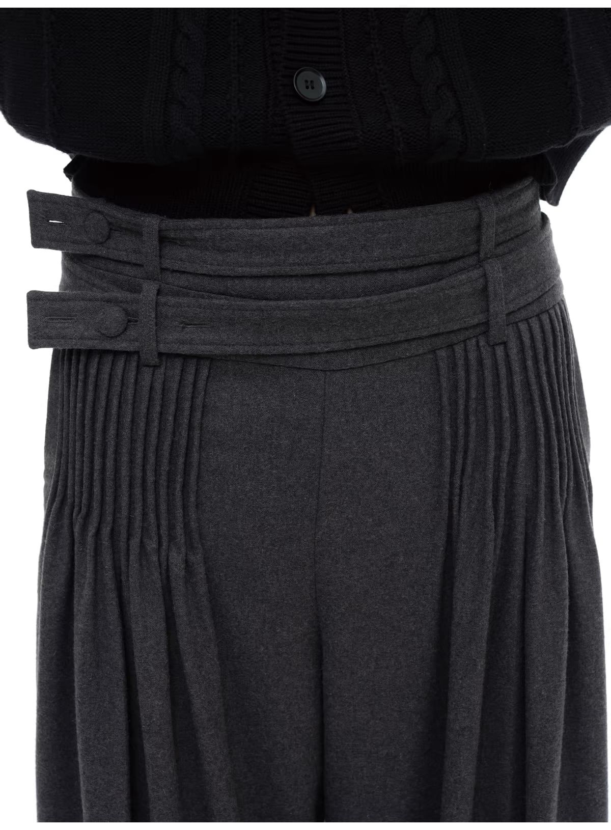 ウエスト部分に配された二重のベルトデザインと包みボタンが、独創的で構築的な腰回りを演出するワイドウールパンツ。