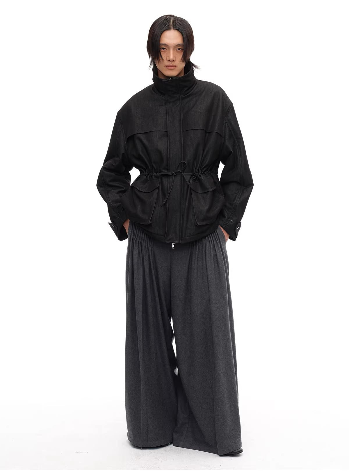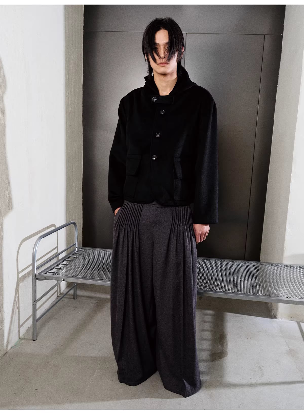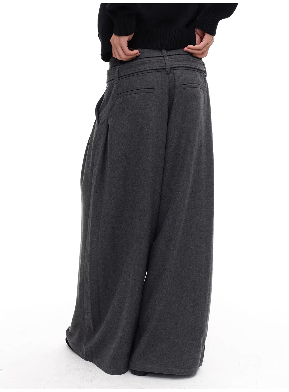ウエスト部分に配された二重のベルトデザインと包みボタンが、独創的で構築的な腰回りを演出するワイドウールパンツ。