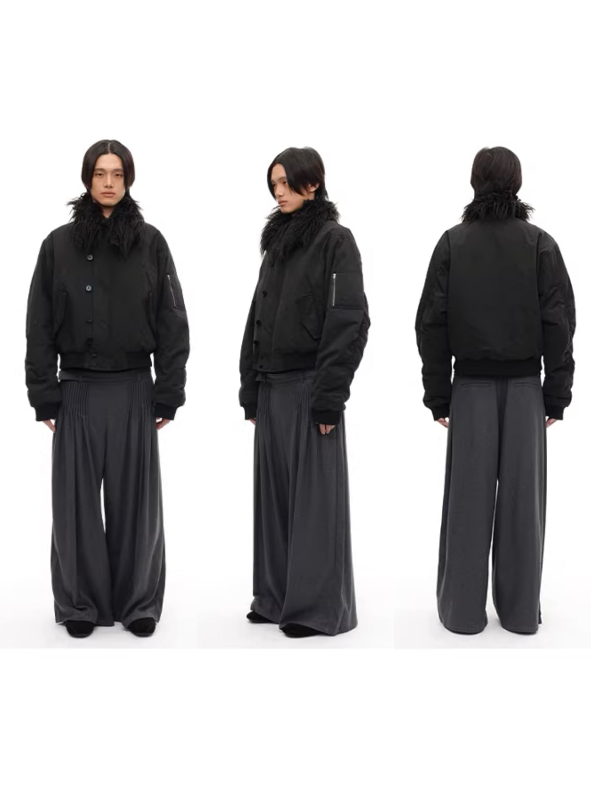 フロントには「ピンタック」と呼ばれる繊細で立体的なプリーツが幾重にも施されており、縦のラインを強調することで、ワイドシルエットながらも脚を長くスマートに見せる視覚効果を発揮します。