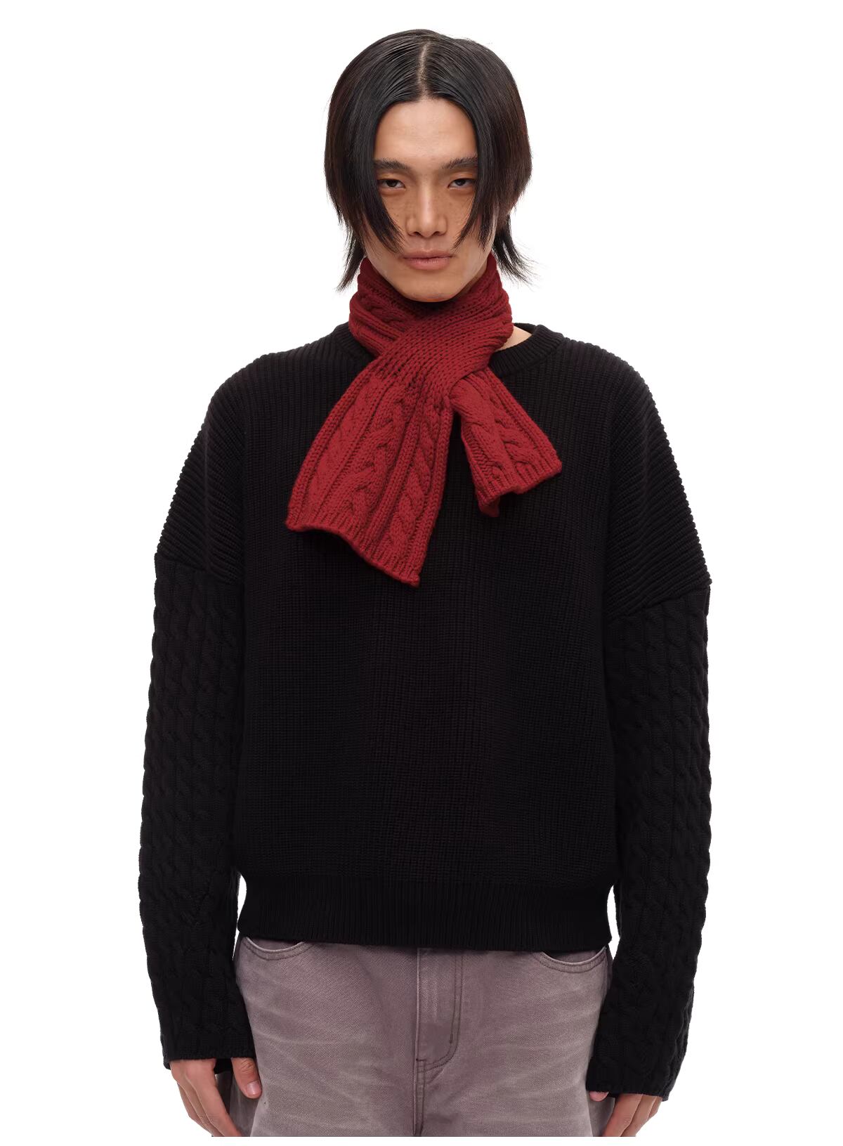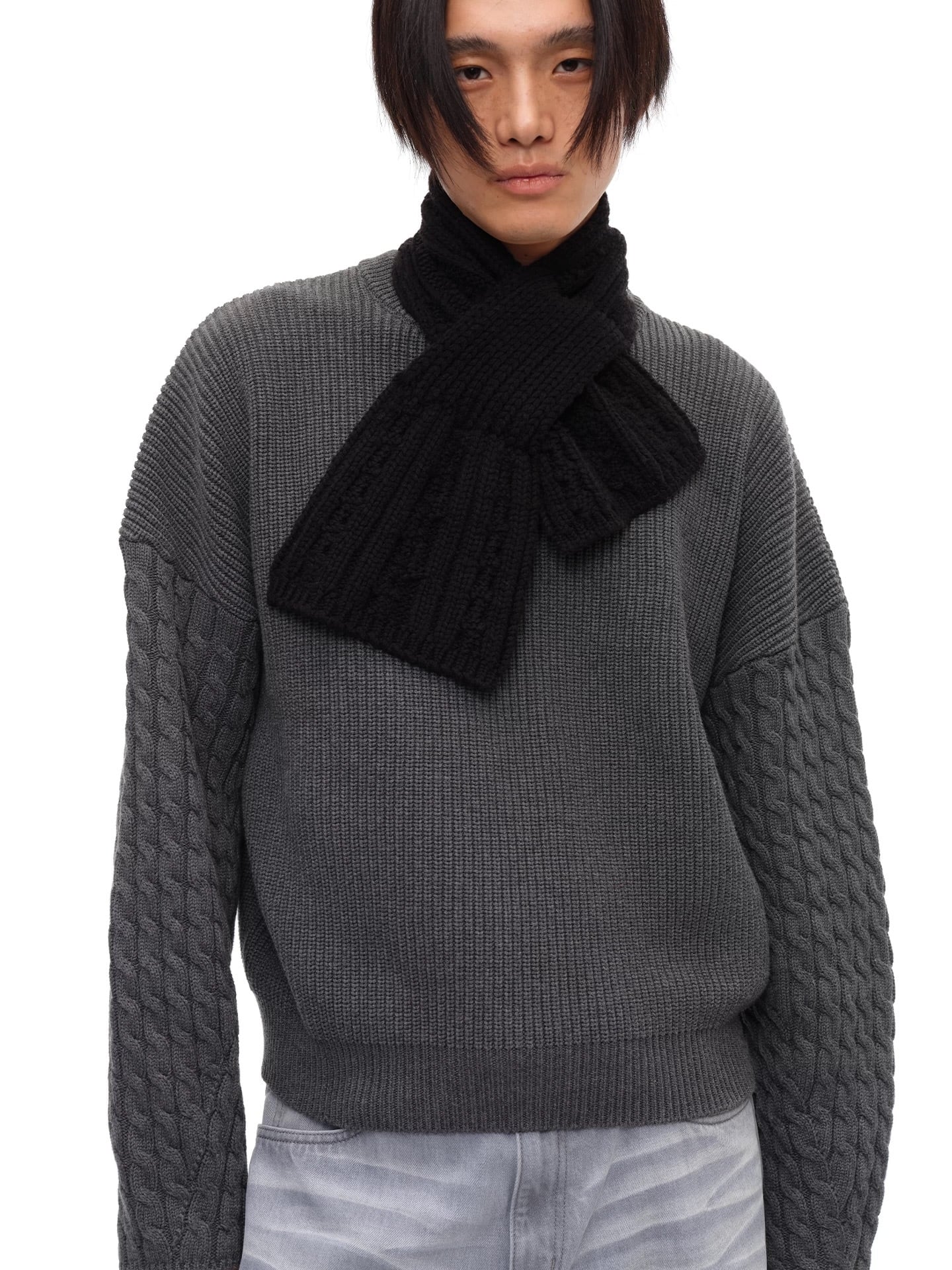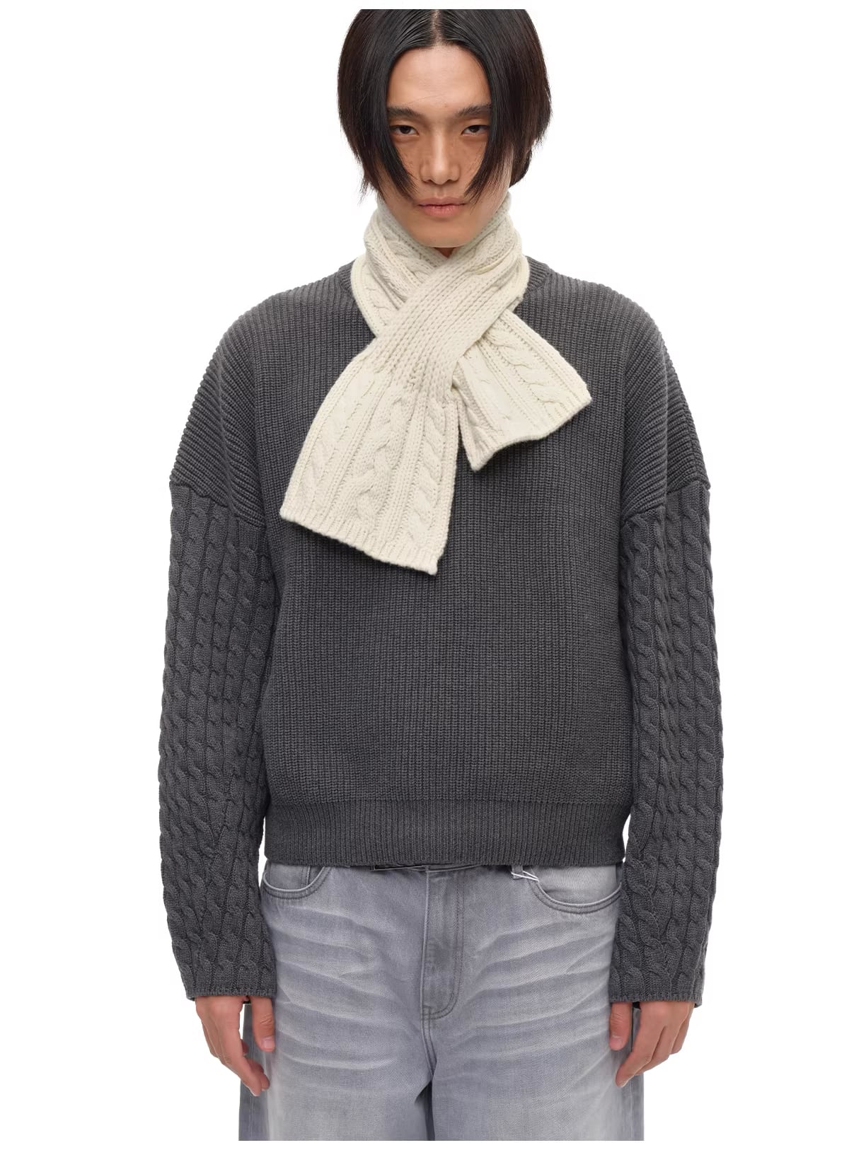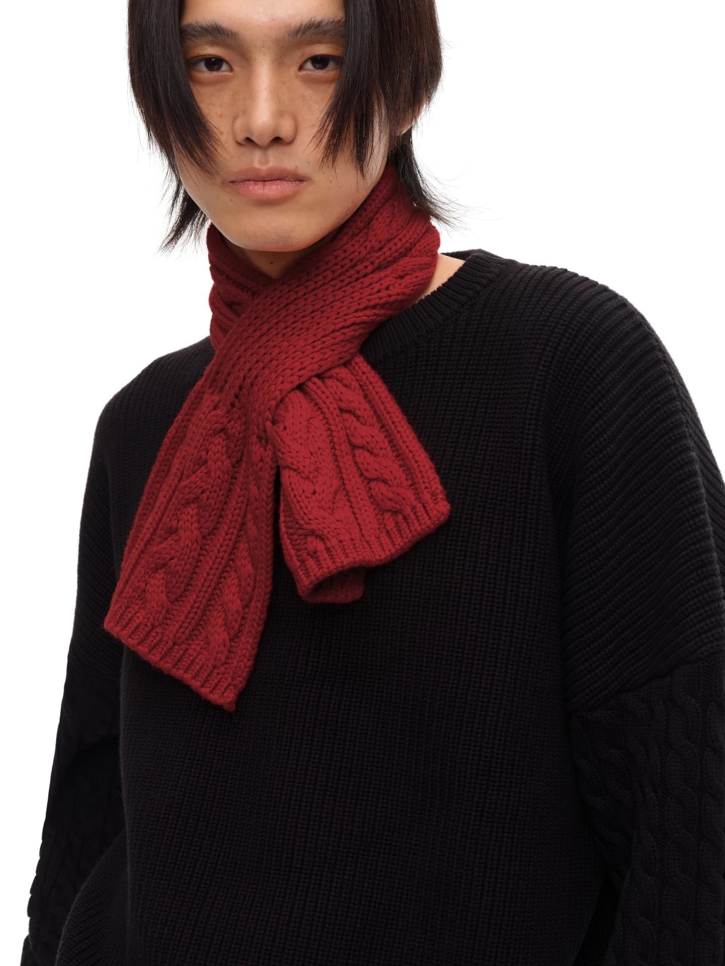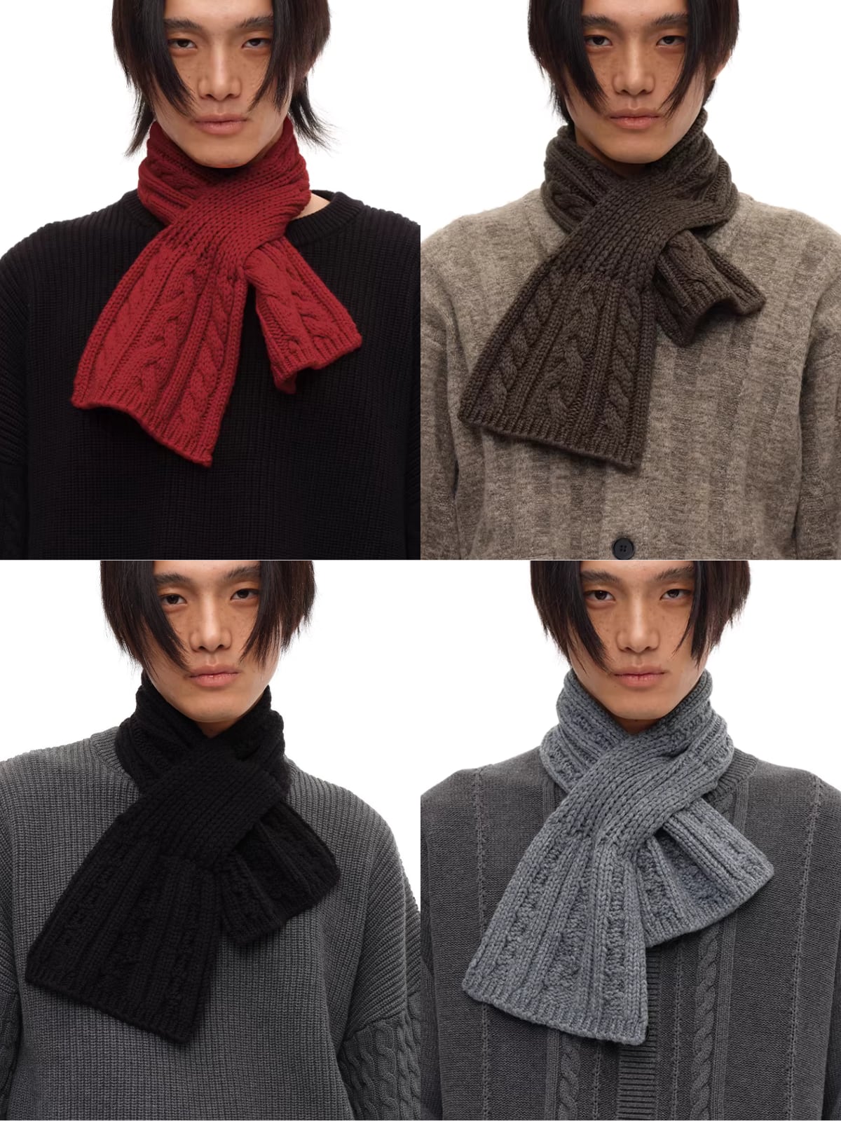 デザインの核となるのは、3つの異なる編み地を組み合わせた立体的なケーブル構造で、単色ながらも奥行きのある豊かな表情を首元にプラスします。