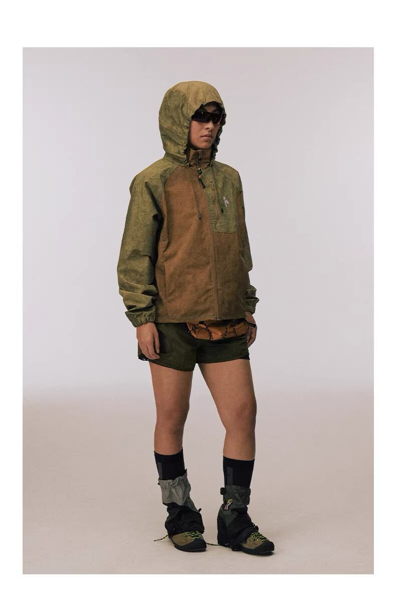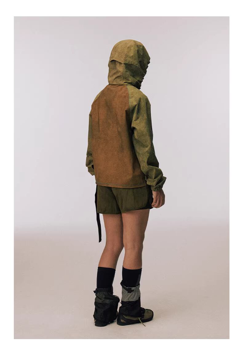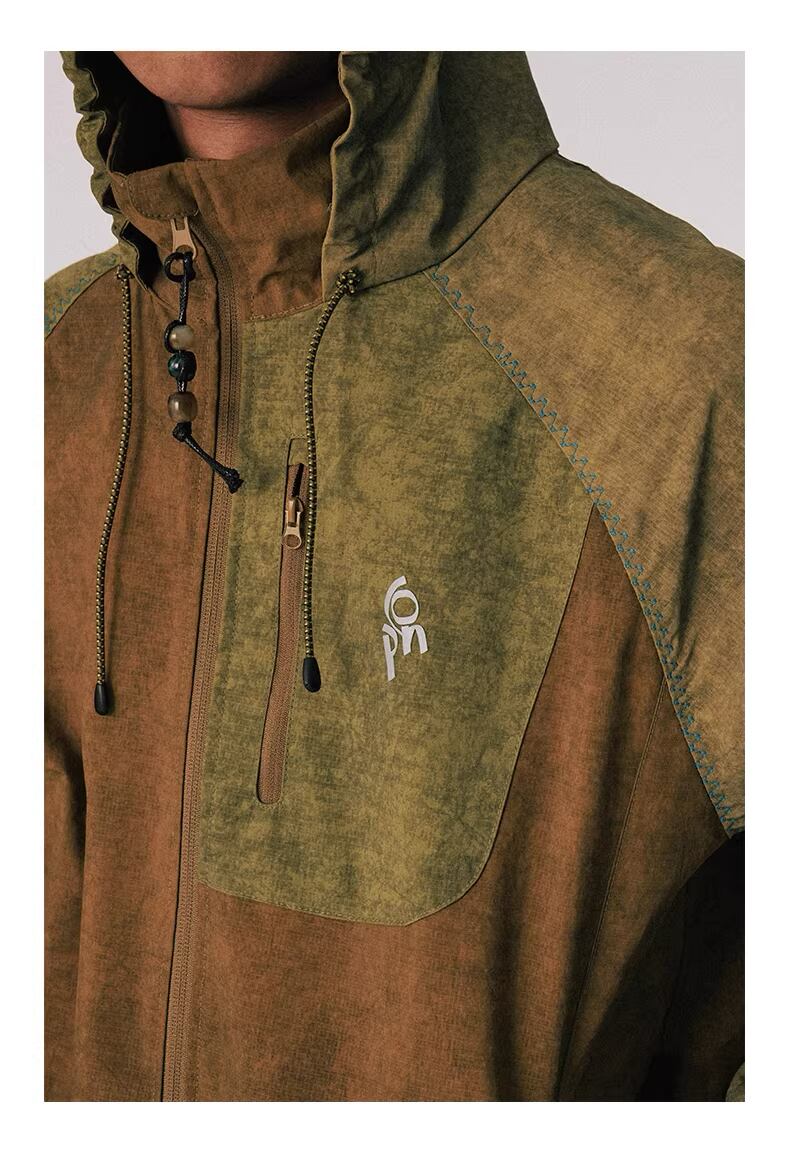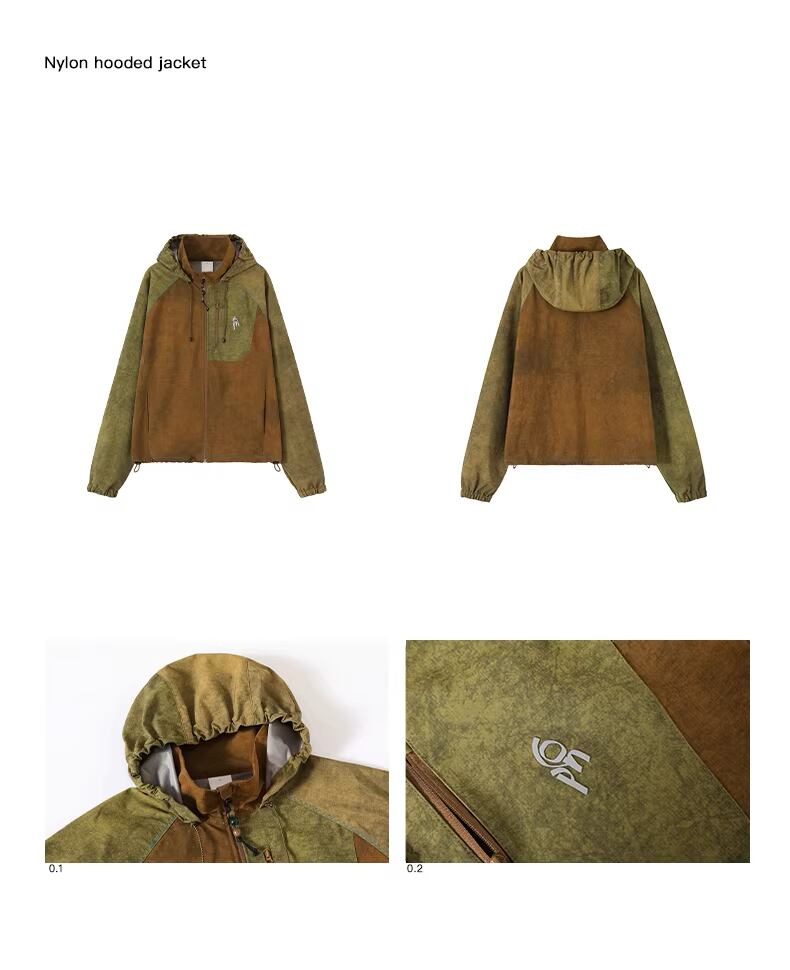 25AWコレクションより、アースカラーのタイダイパターンが自然な陰影を生み出す、存在感抜群のフード付きナイロンジャケット。