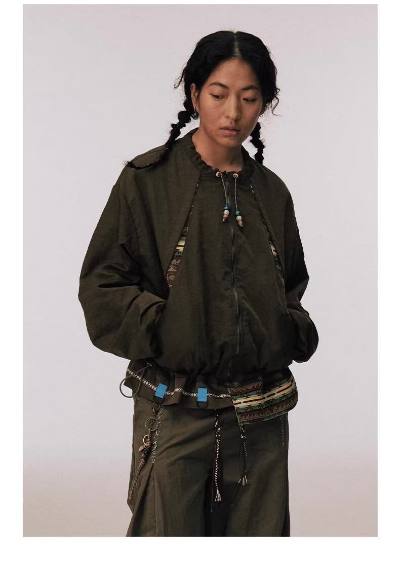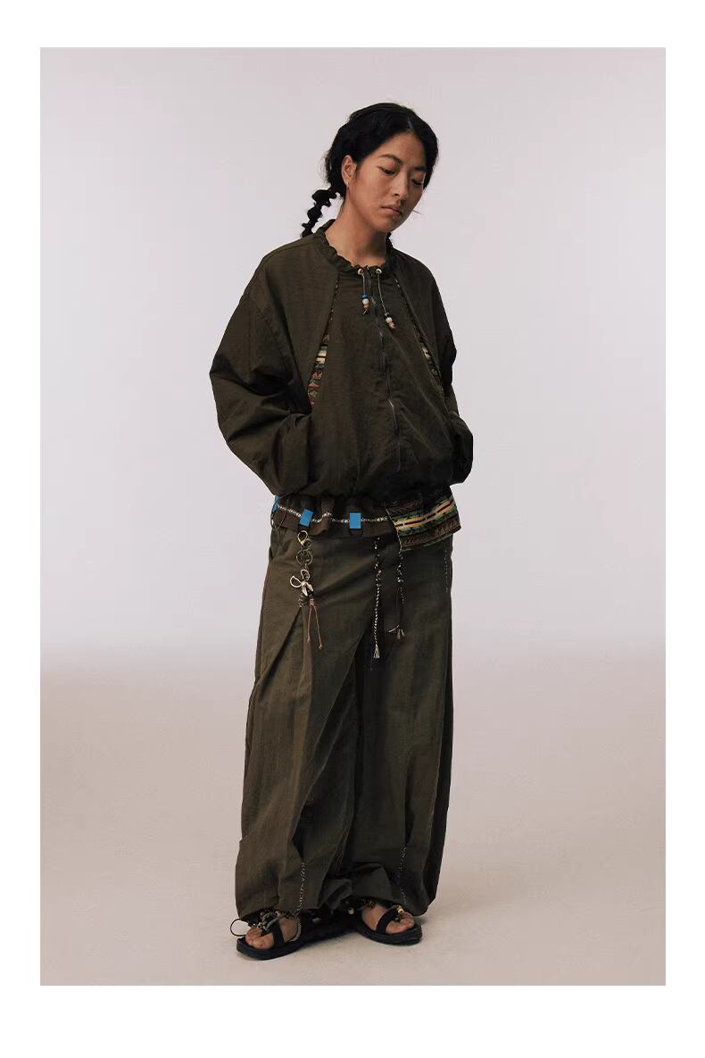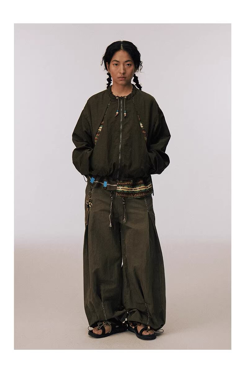 スタンドカラーの首元にはビーズ装飾をあしらったドローコードを配し、テックな素材感の中にボヘミアンな温もりをプラス。