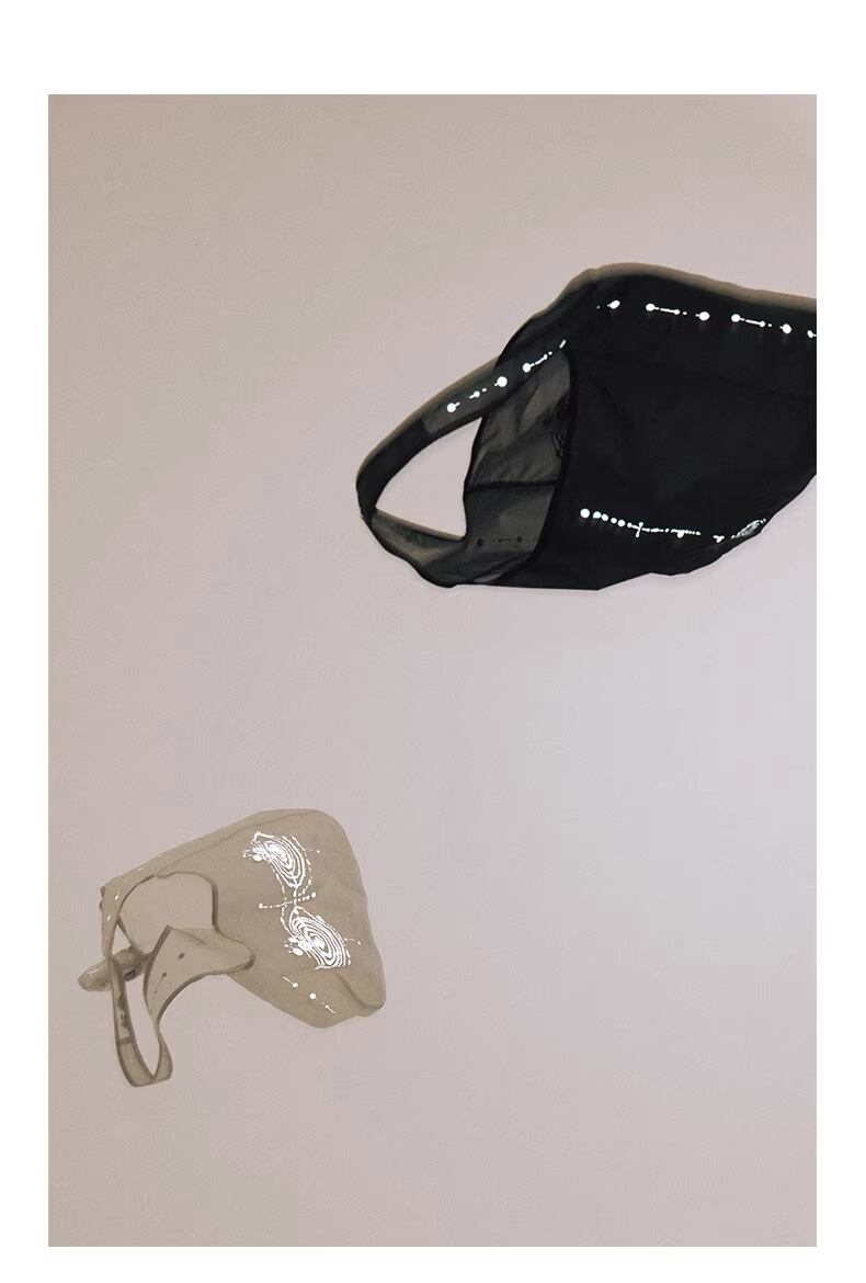 特徴的なグラフィックプリントは、光を受けると反射し、暗い場所や夜間でも存在感を放つデザイン。
