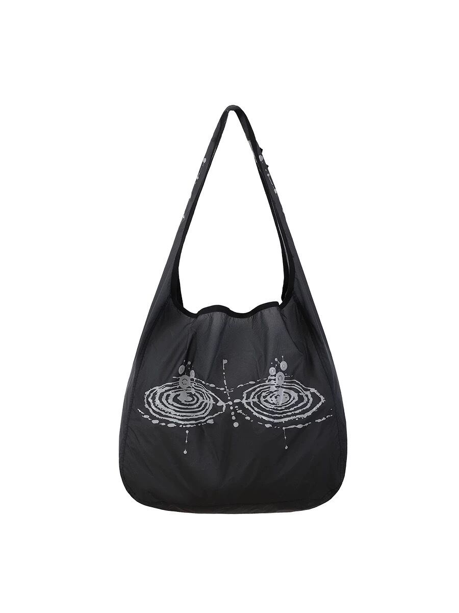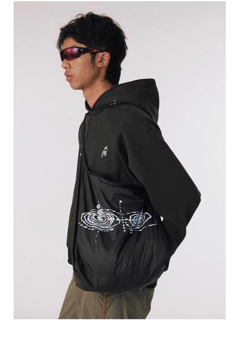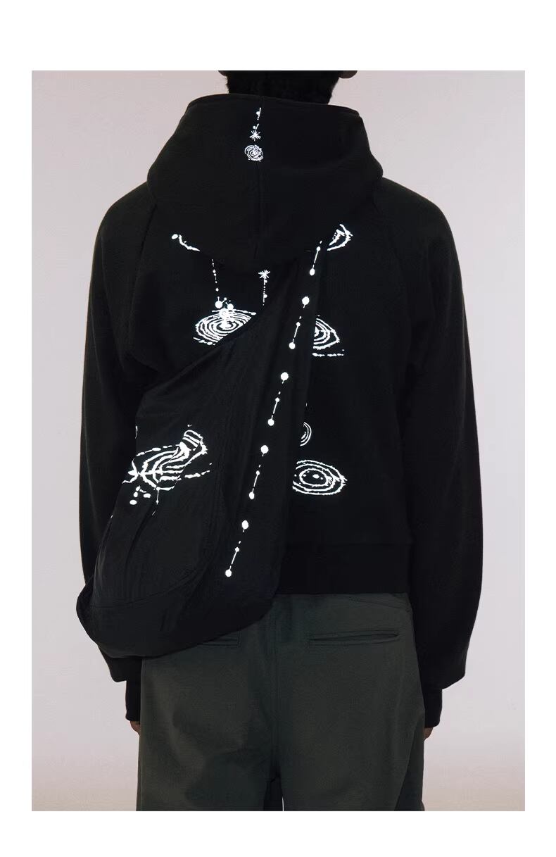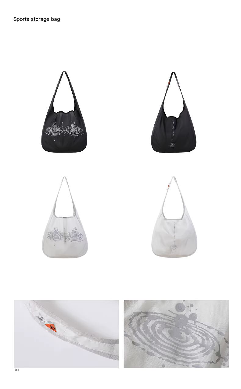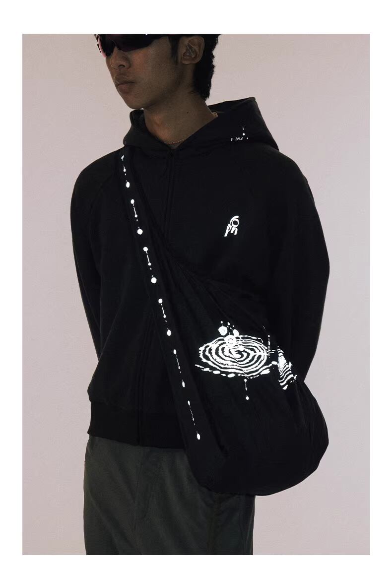 2025年秋冬コレクションのアイテムの、宇宙の軌道を思わせる「Universe Echo」のグラフィックプリントが印象的なショルダーバッグ。