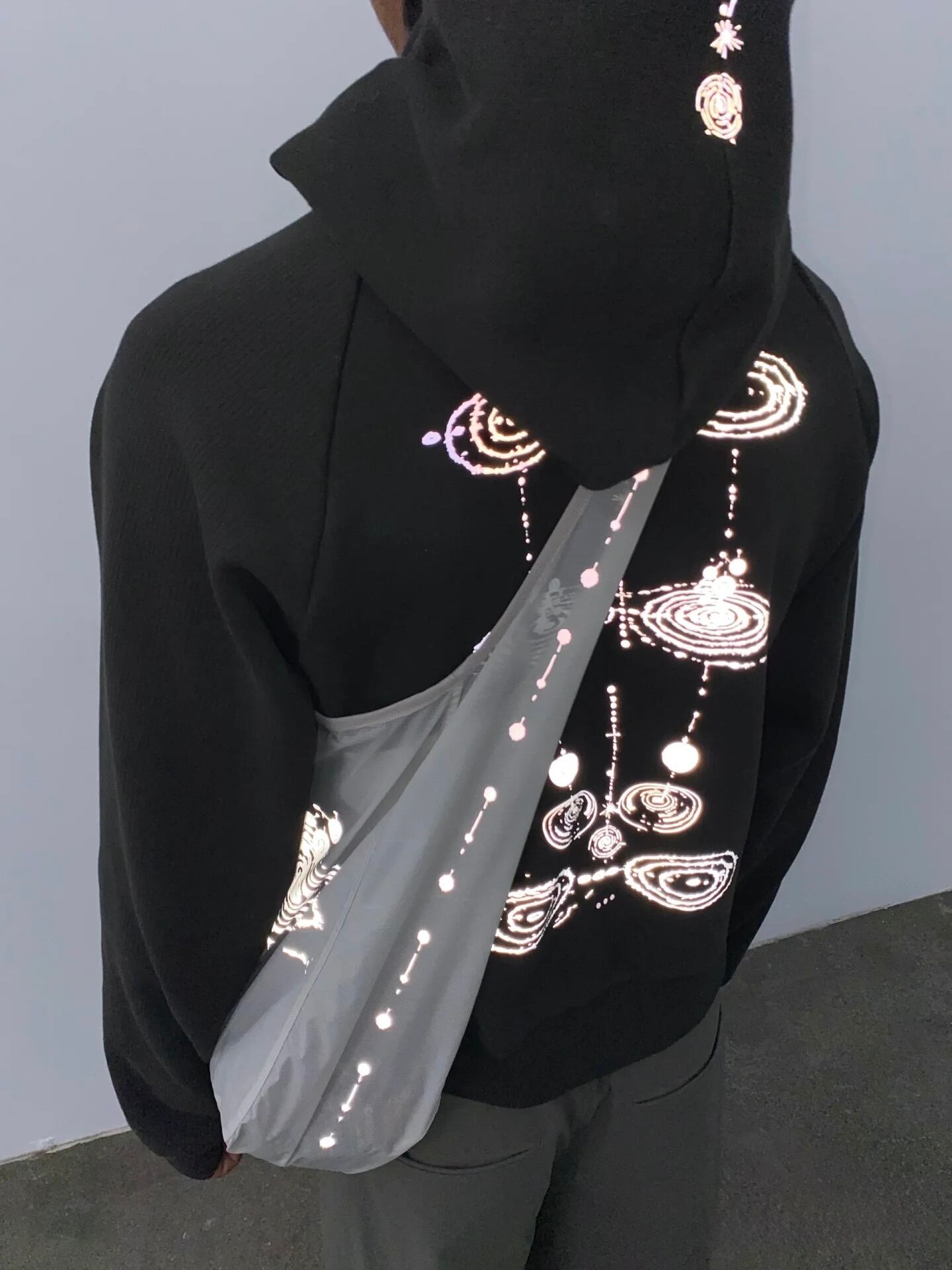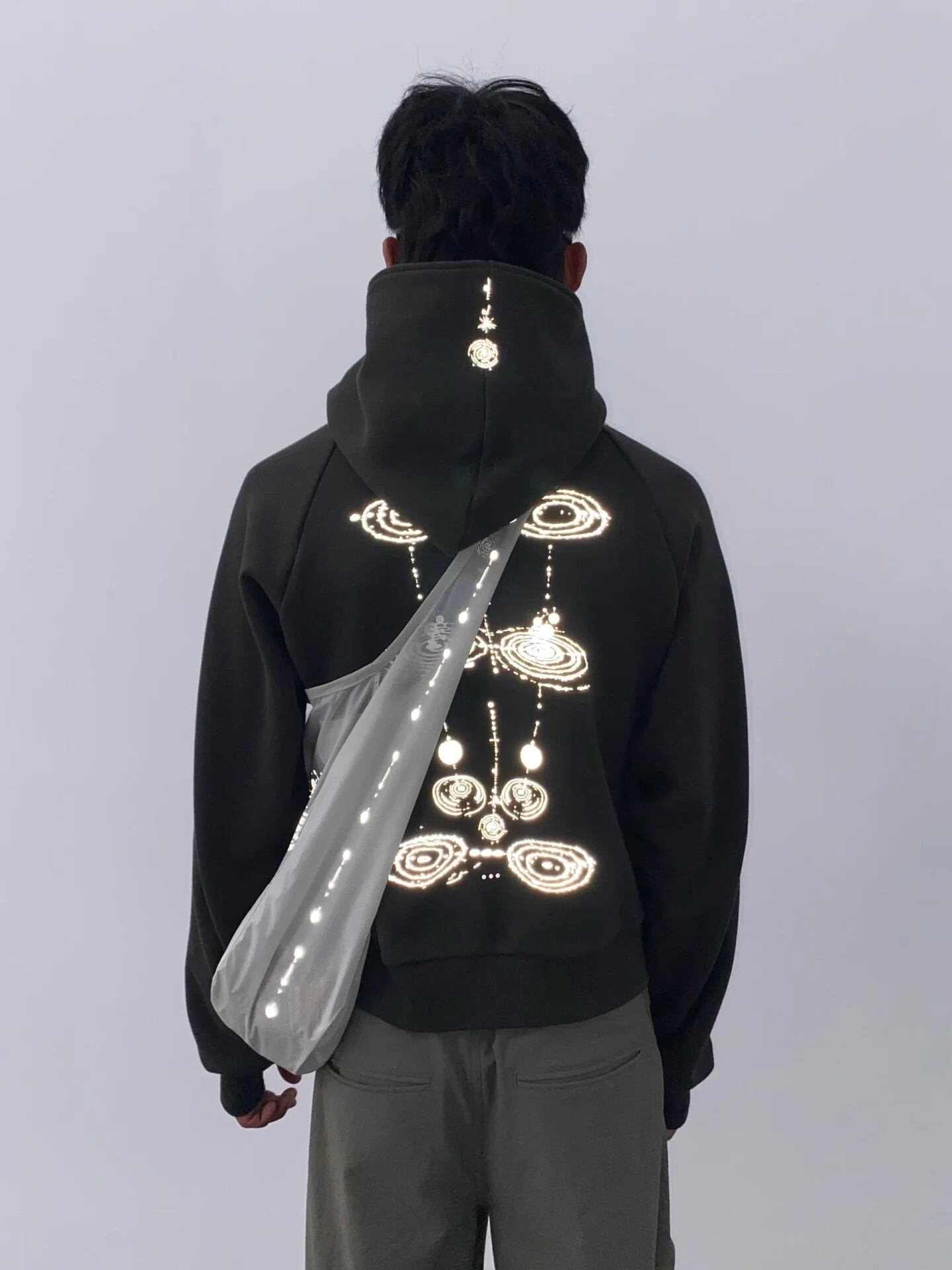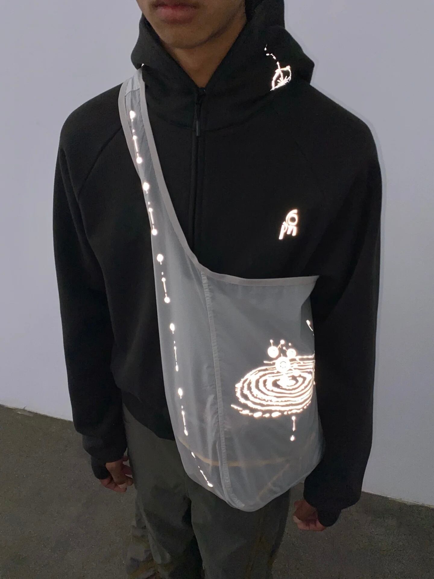 特徴的なグラフィックプリントは、光を受けると反射し、暗い場所や夜間でも存在感を放つデザインとなっています。