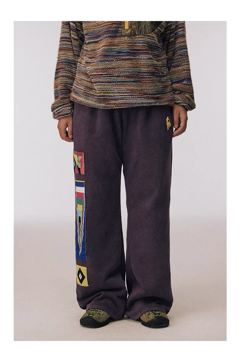 2025年秋冬コレクションの新作で、サイドに施された手作業によるビーズ刺繍とフラッグモチーフのパッチワークが特徴的なスウェットパンツです。