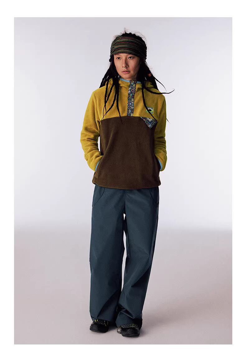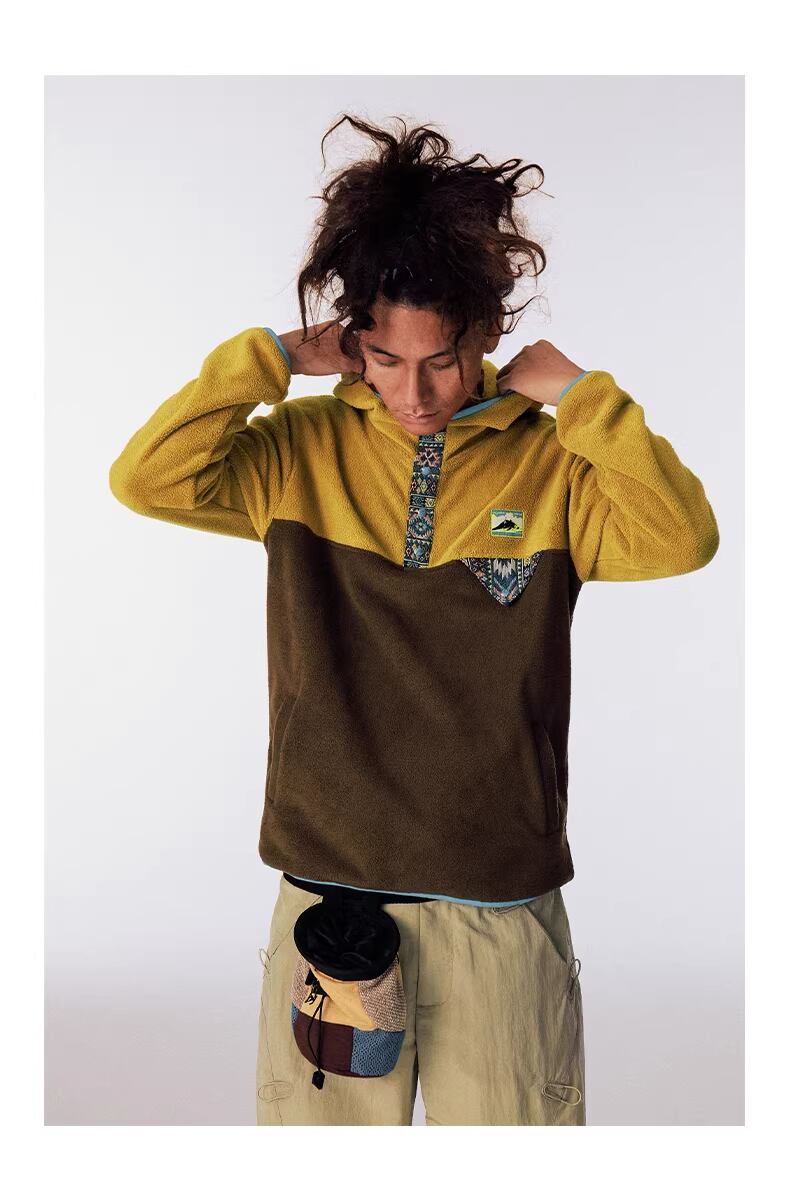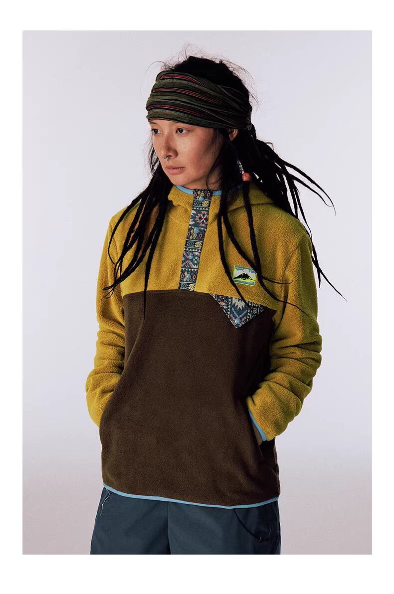 2025年秋冬コレクションの新作で、温かみのあるフリース素材にエスニックな要素を取り入れたプルオーバーフーディー。