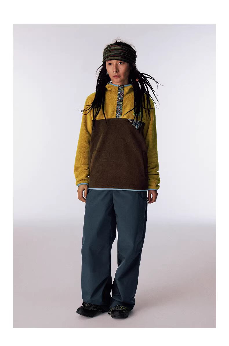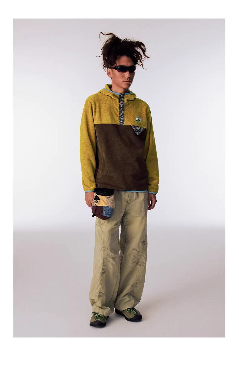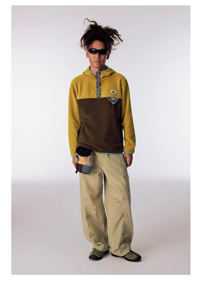 フロントのハーフジップ部分やポケットのフラップに施された、民族調(トライバル柄)のテープディテールと、イエローブラウンとダークブラウンの大胆なカラーブロックデザインが特徴的です。