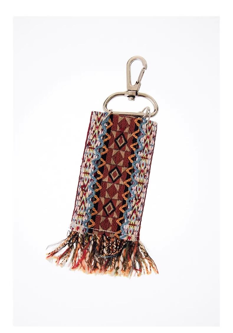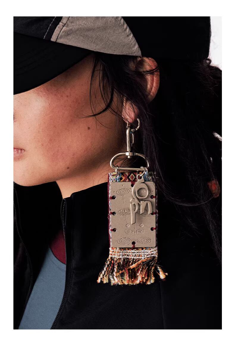 下部には民族調の織り生地とフリンジがあしらわれており、無機質なメタル素材と温かみのあるテキスタイルが融合した独特のデザインが特徴。