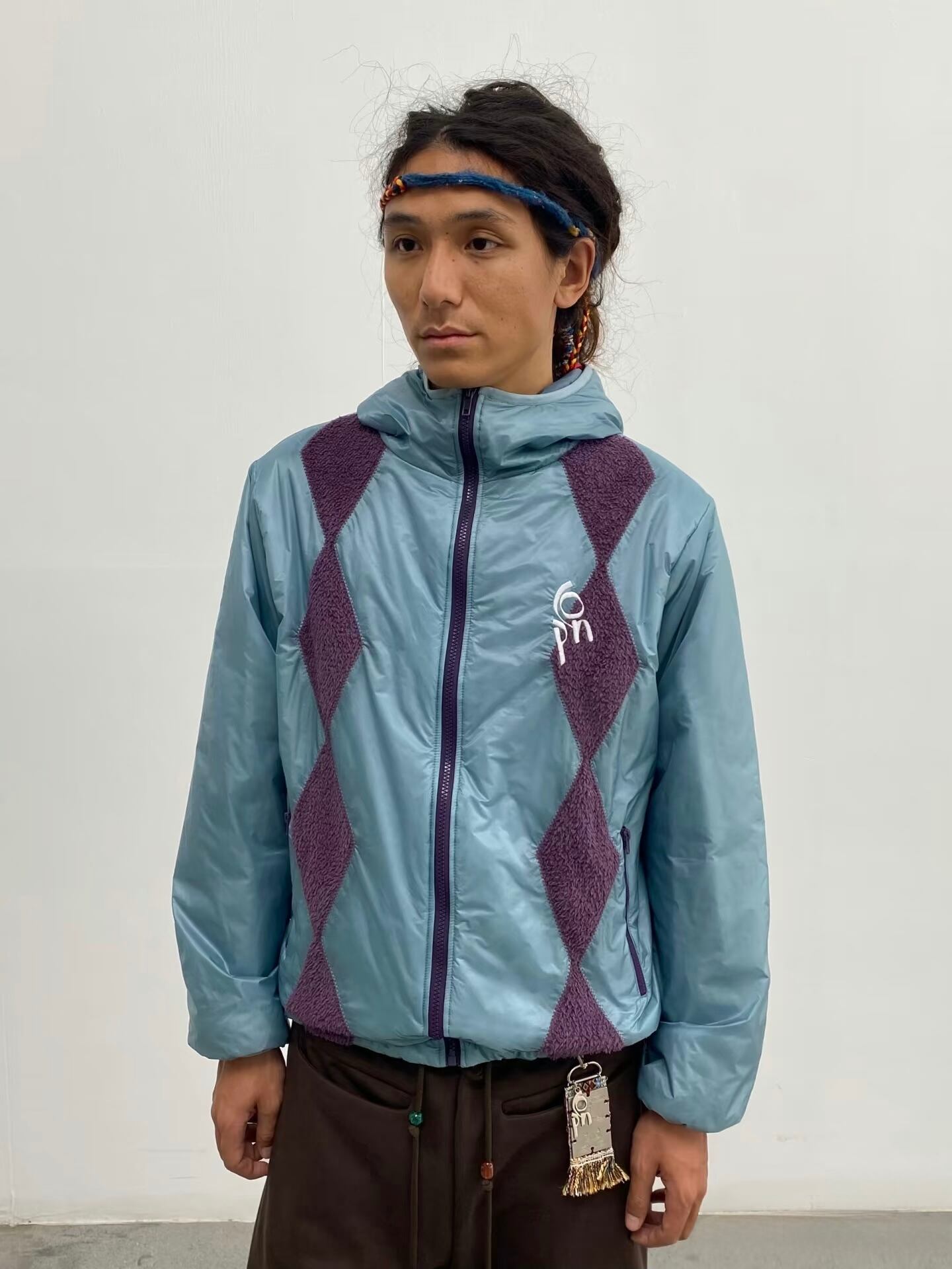 淡いブルーの半透明な表地にはダイヤモンド柄のステッチが施されており、その下に配置された濃い色のボア素材のパッチワークが透けて見える、視覚的に非常にユニークで奥行きのあるデザインになっています。