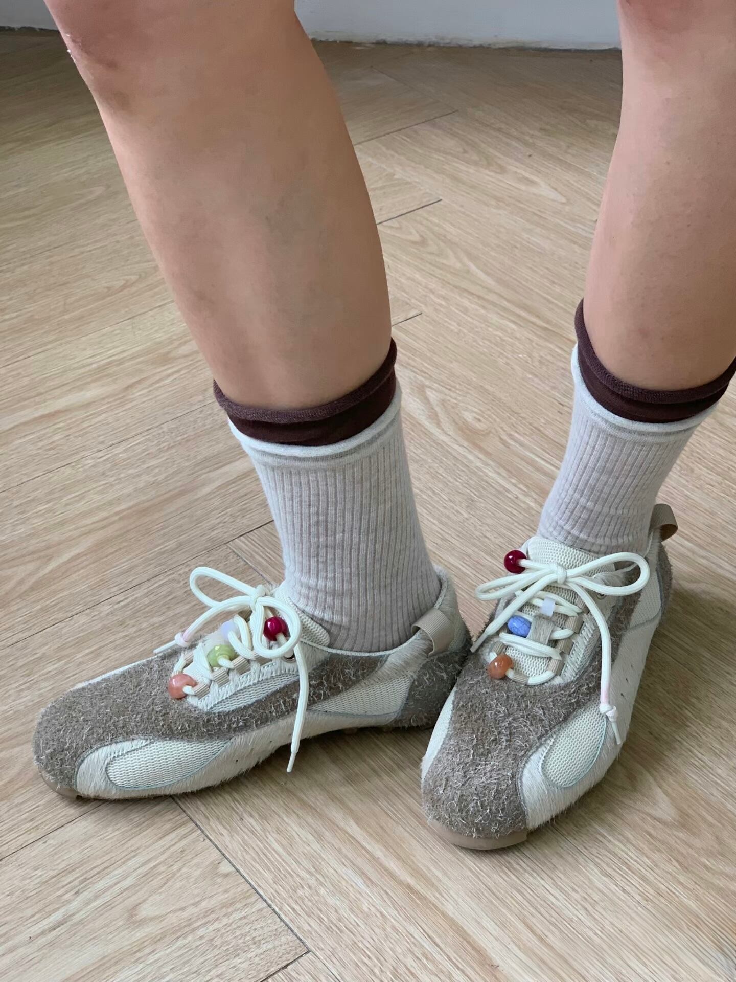シューレースにあしらわれたカラフルなビーズ装飾が特徴で、シンプルになりがちな足元にポップでキュートなアクセントを加えます。