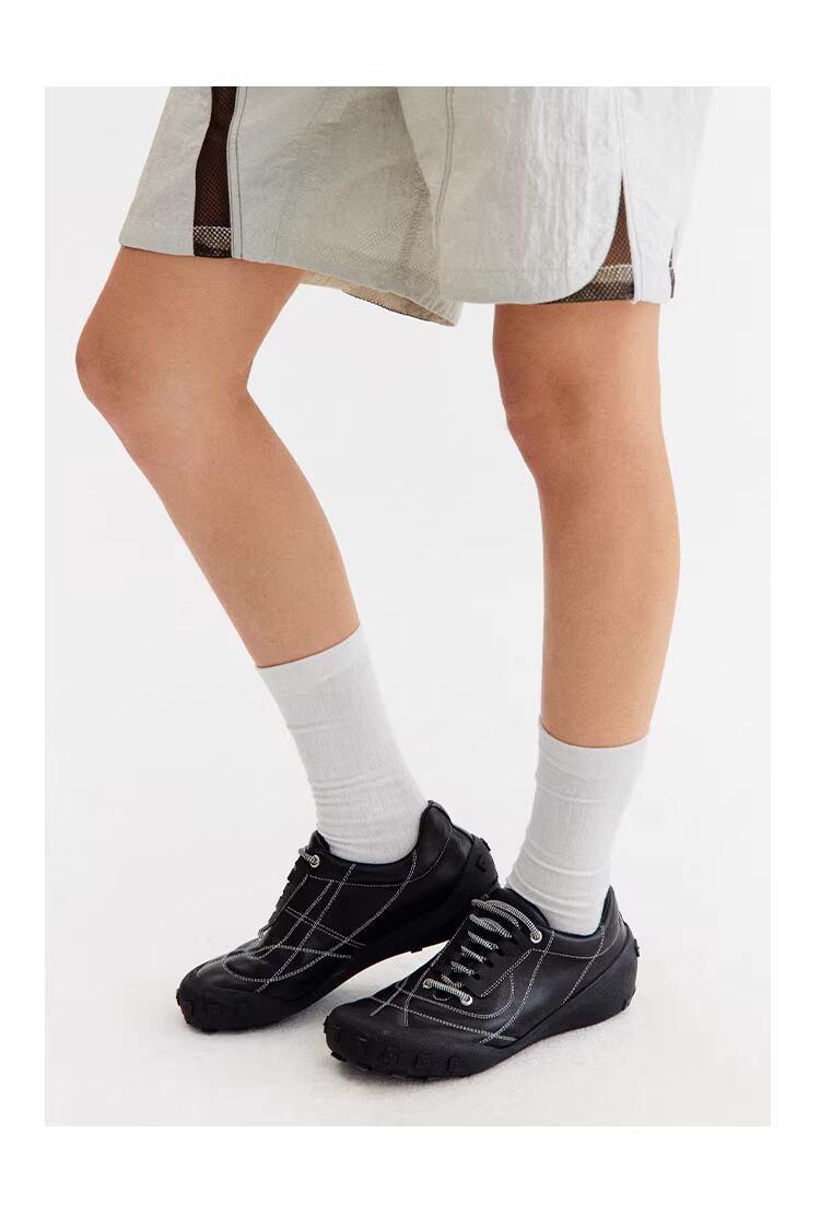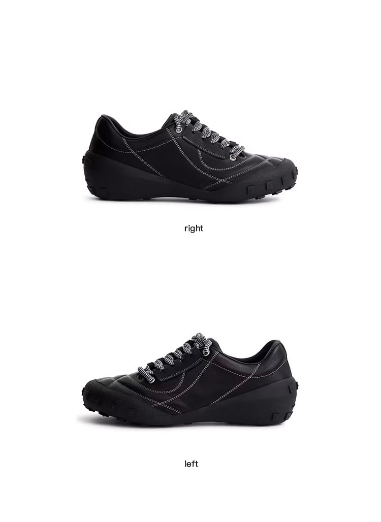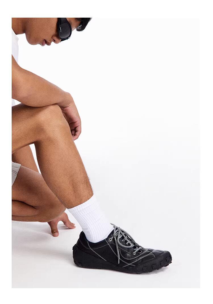 ブラックのボディに施されたホワイトのコントラストステッチが特徴的で、靴の構造を立体的に際立たせる「多次元」的なデザインに仕上がっています。