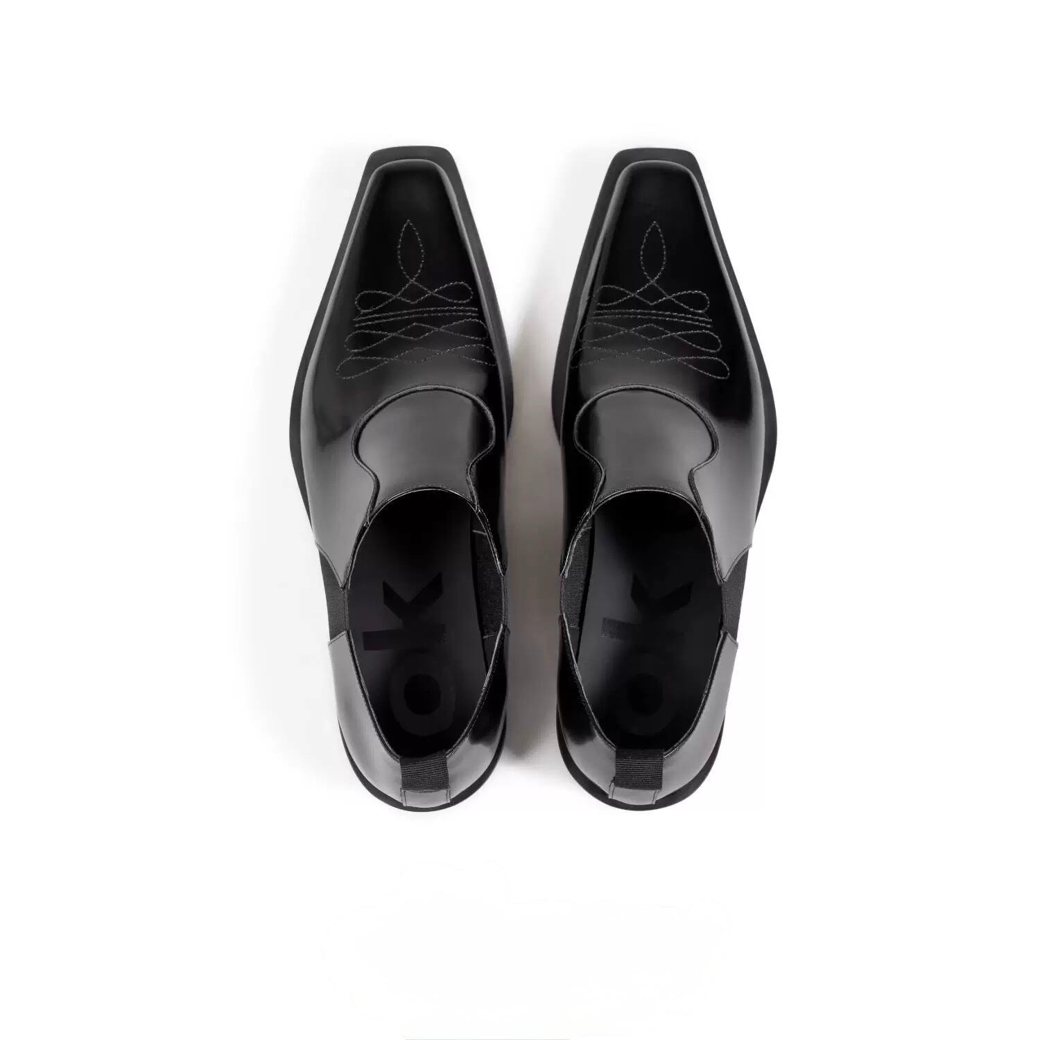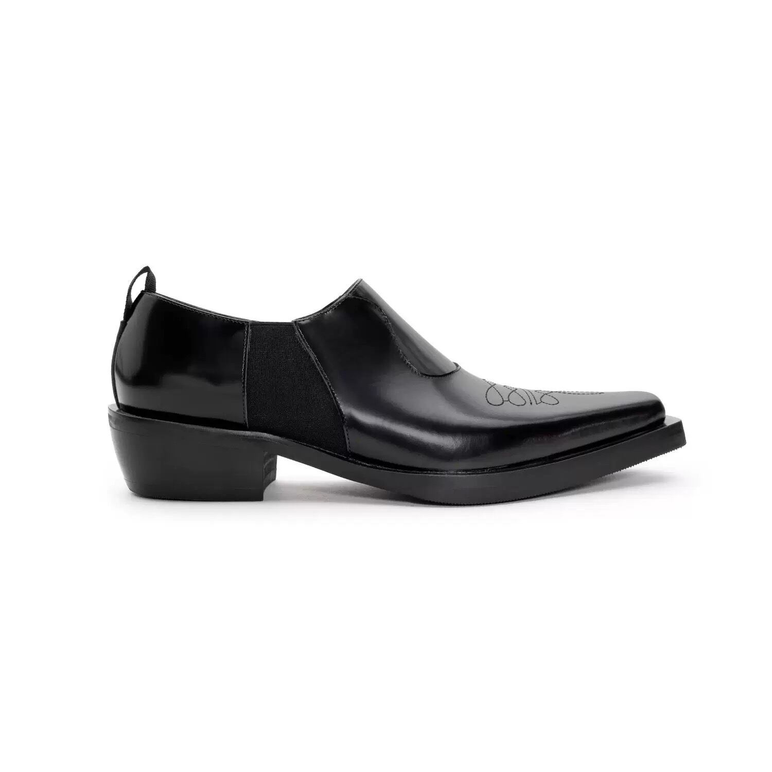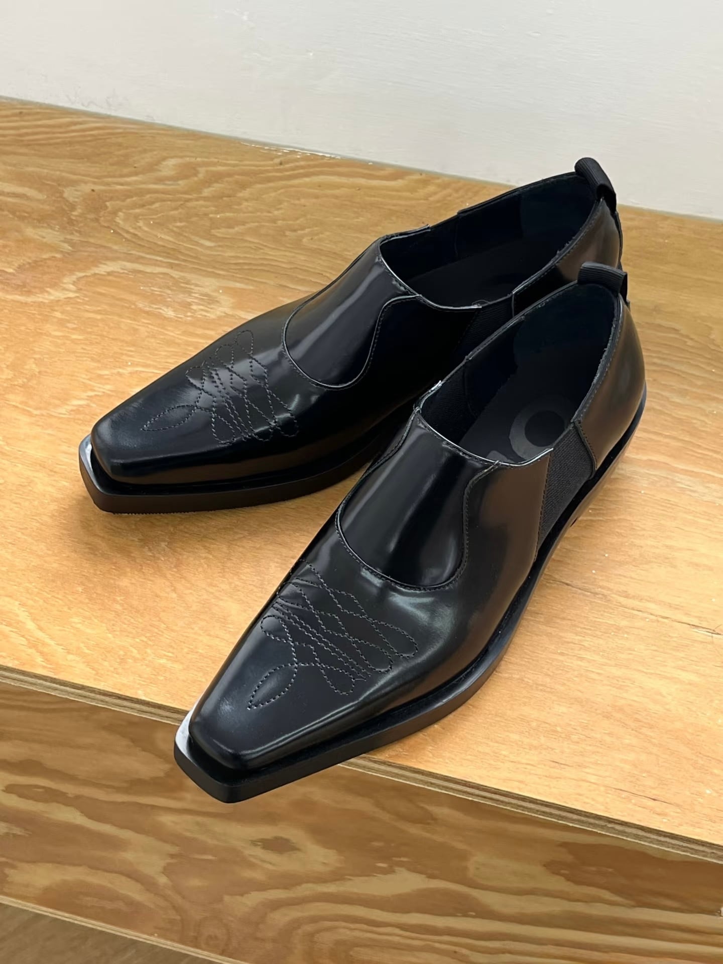シャープなポインテッドトゥのシルエットが特徴的なスリッポンローファーで、ウエスタンブーツのようなクールな雰囲気を漂わせています。