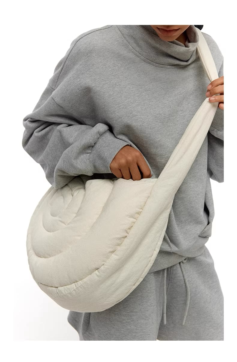 中綿をたっぷりと充填した「パフ」のようなふっくらとしたボリューム感があり、雲のように柔らかく体にフィットするシルエットが特徴です。