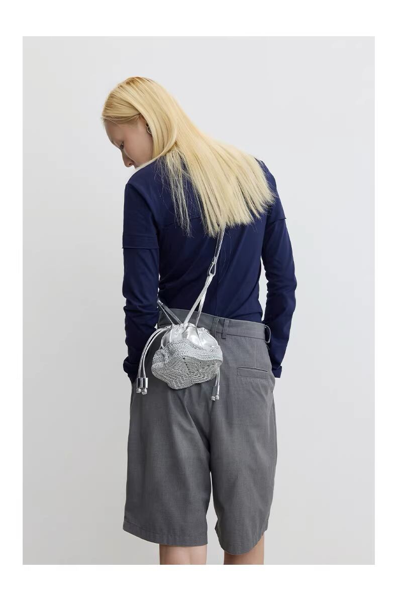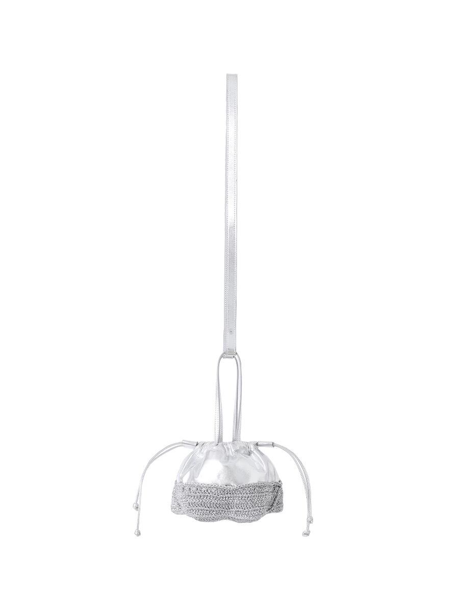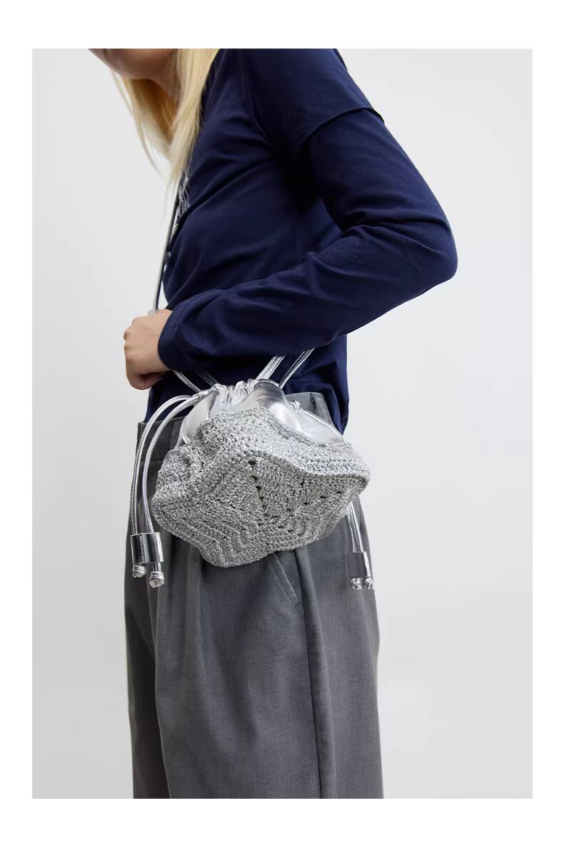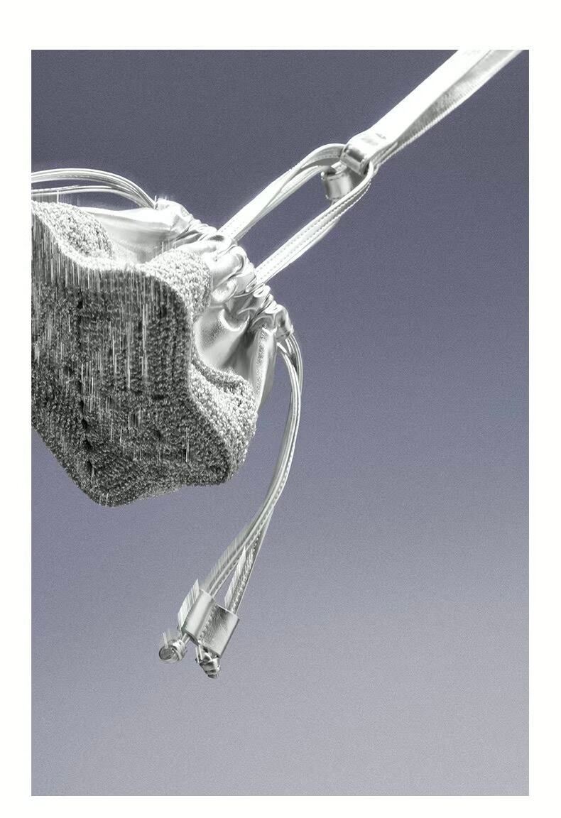 メタリックな輝きを放つシルバーの糸を使用しており、クラフト感のある編み地と近未来的な素材感のコントラストが特徴です。