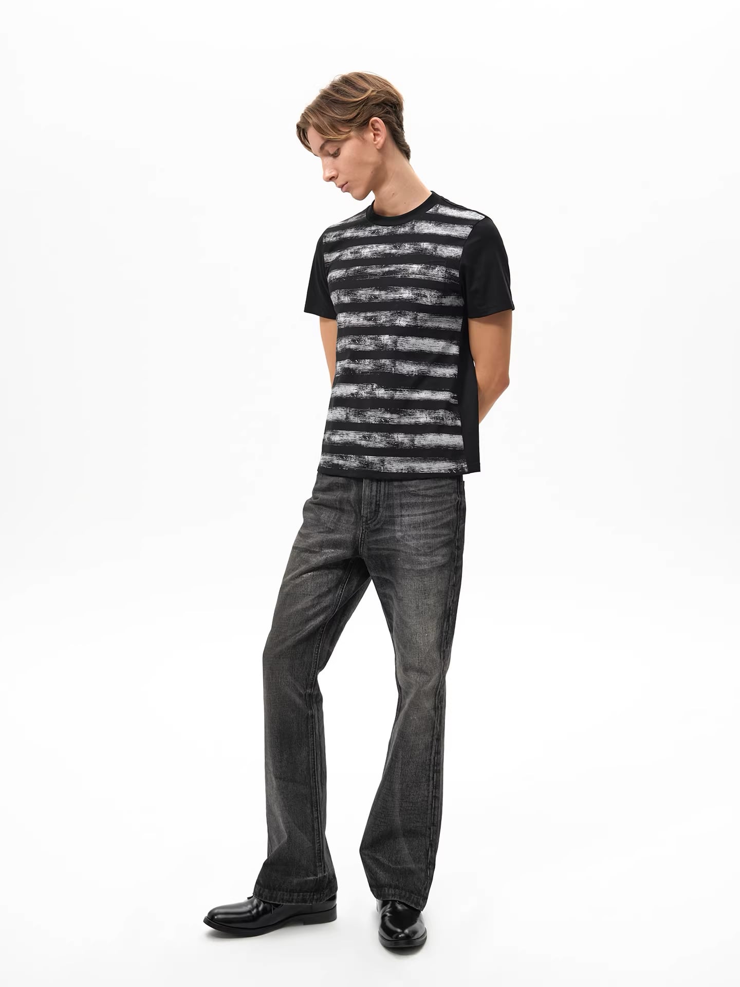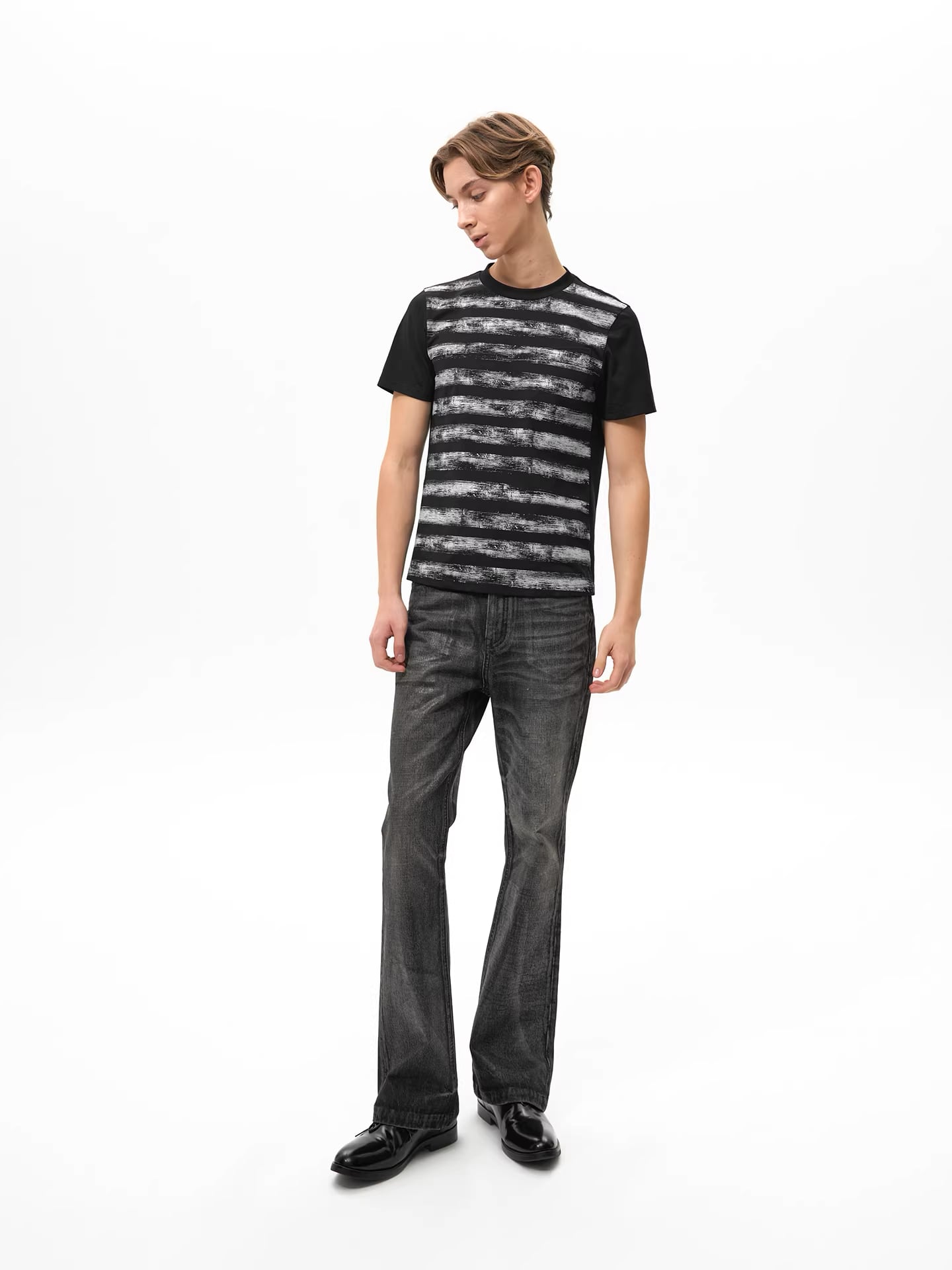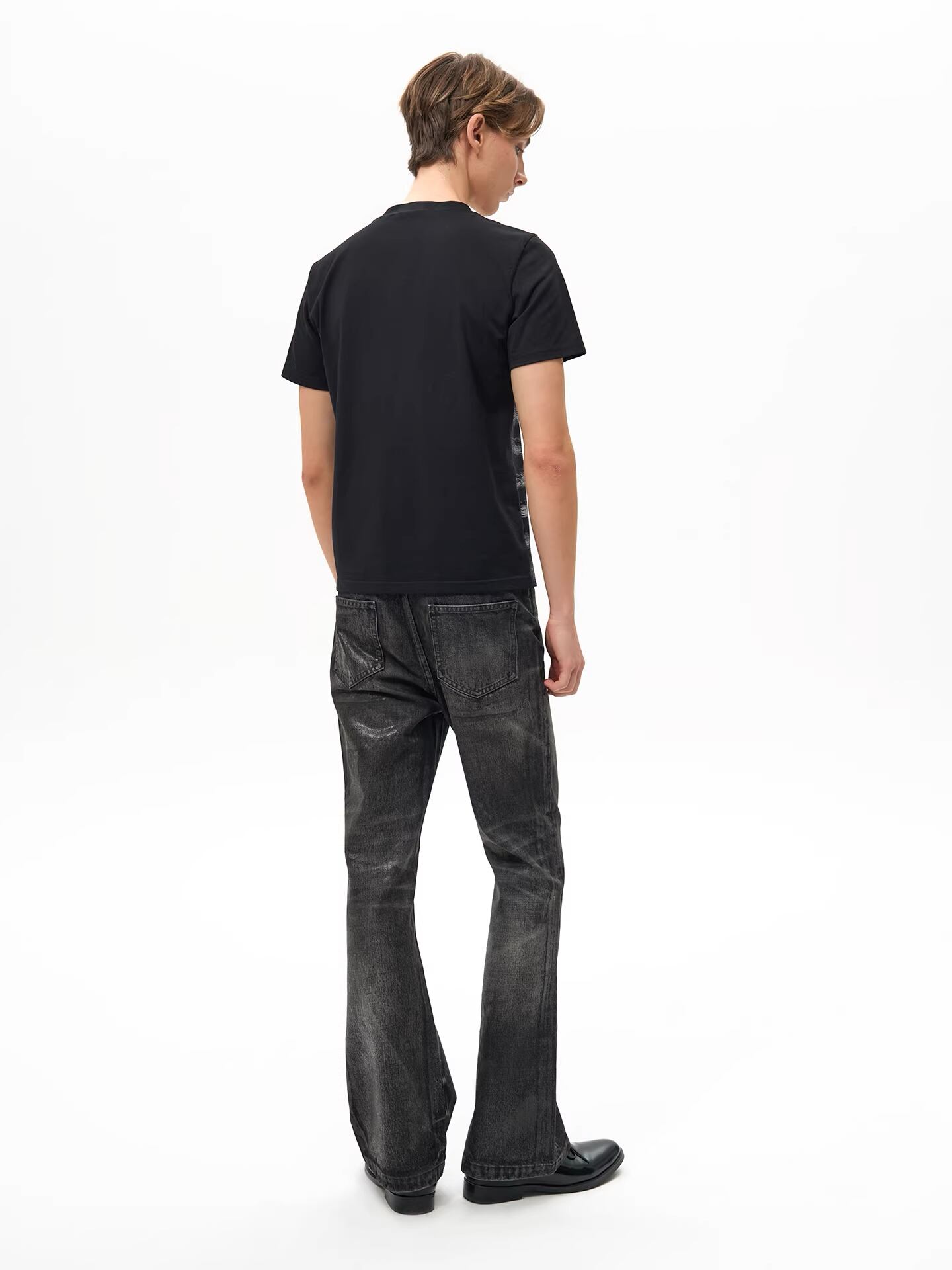 膝下から自然に広がる微フレア(ブーツカット)シルエットが脚の比率を美しく見せ、クラシックな5ポケット構造とストレートウエストのデザインにより、多様なトップスやシューズと調和します。