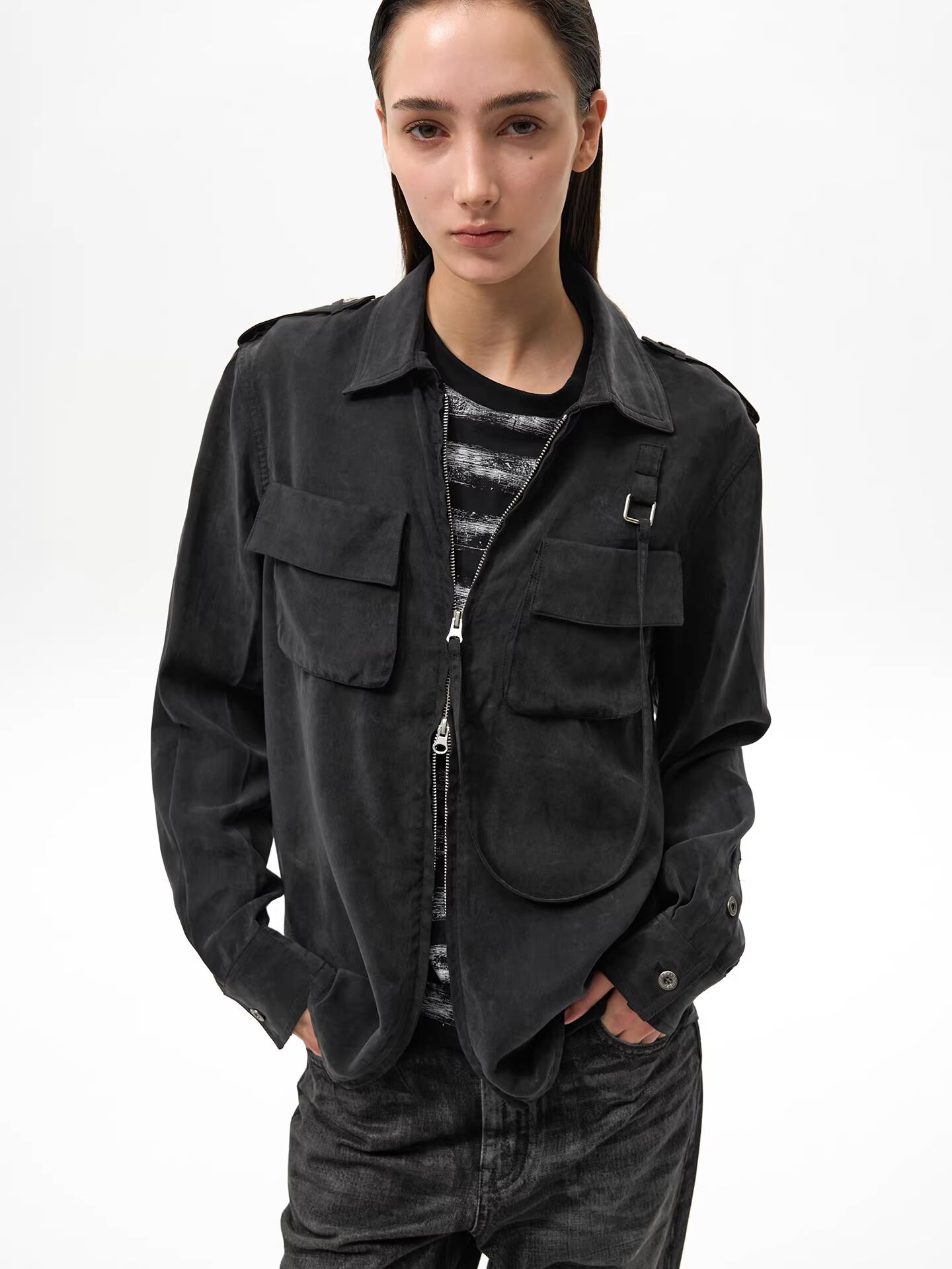 肩章(エポレット)やダブルフラップの胸ポケット、フロントのメタルジッパーが力強いスタイルを演出しつつ、右胸に施された非対称のストラップとメタルバックルの装飾が洗練されたレイヤード感を生み出しています。