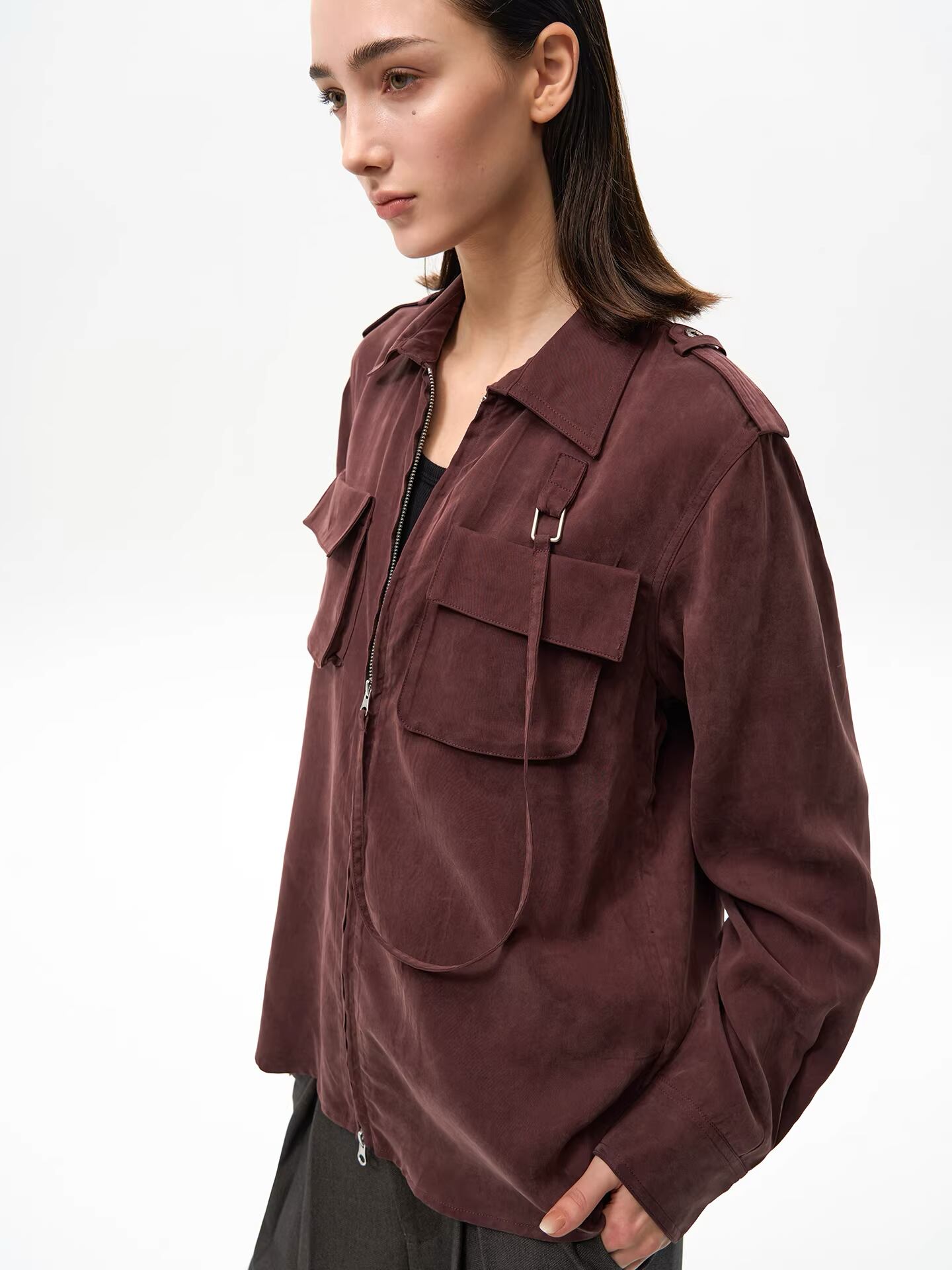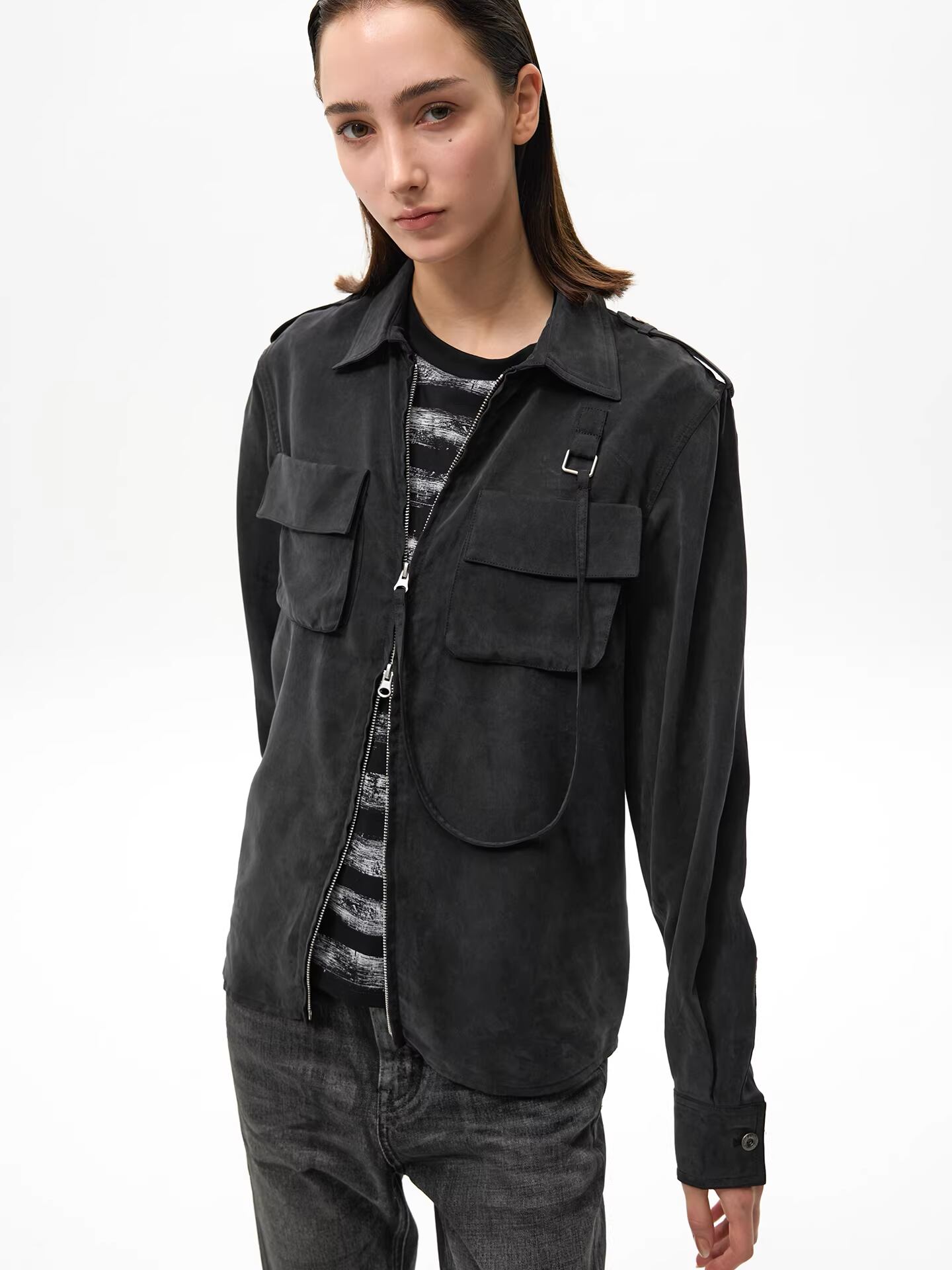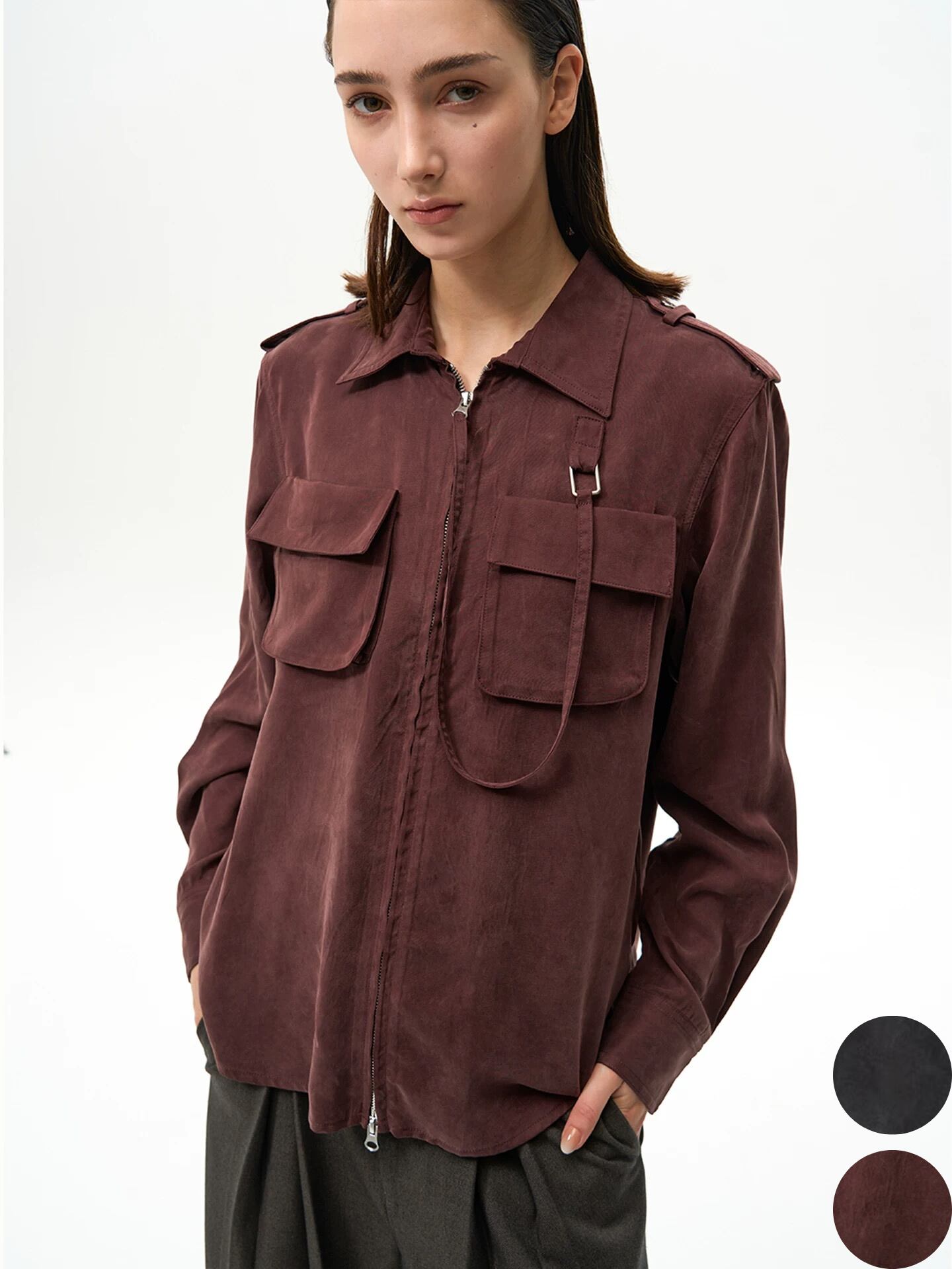 マットな質感のキュプラ混紡素材を使用した、ミリタリーテイストのジップアップシャツ。