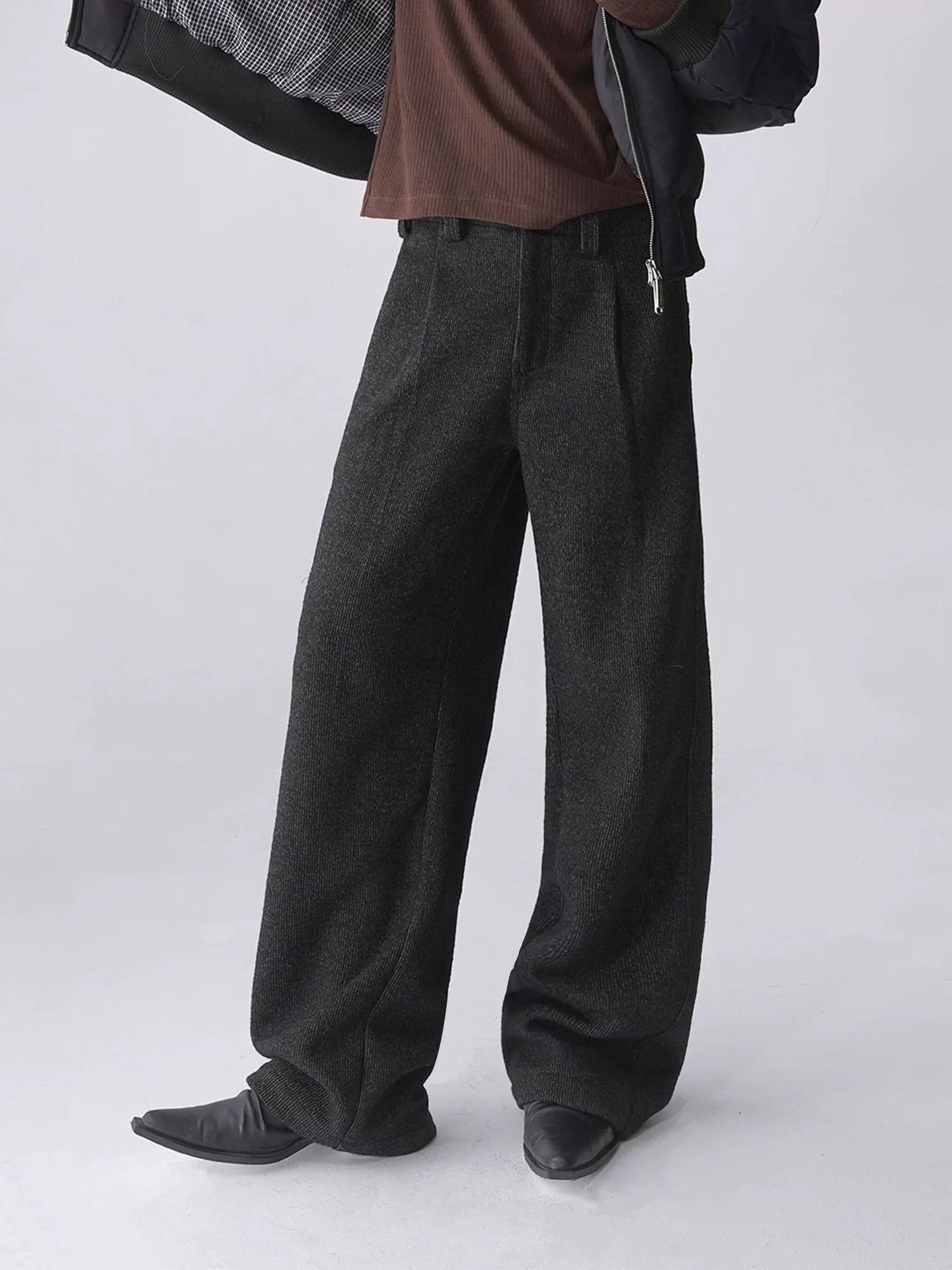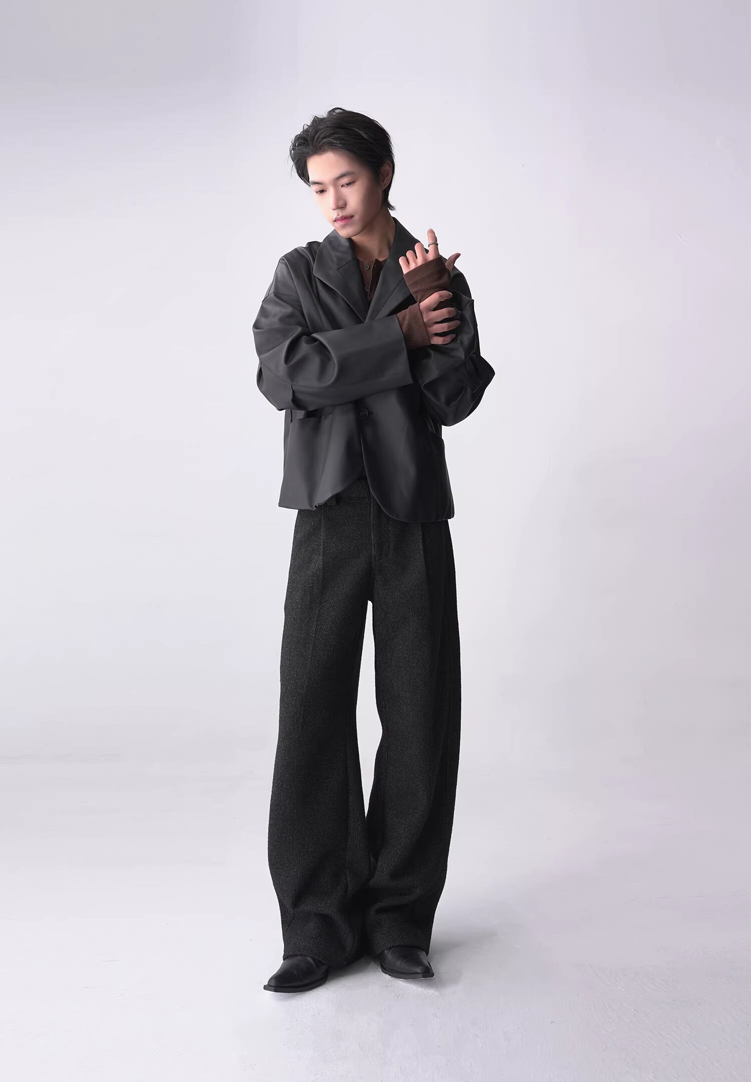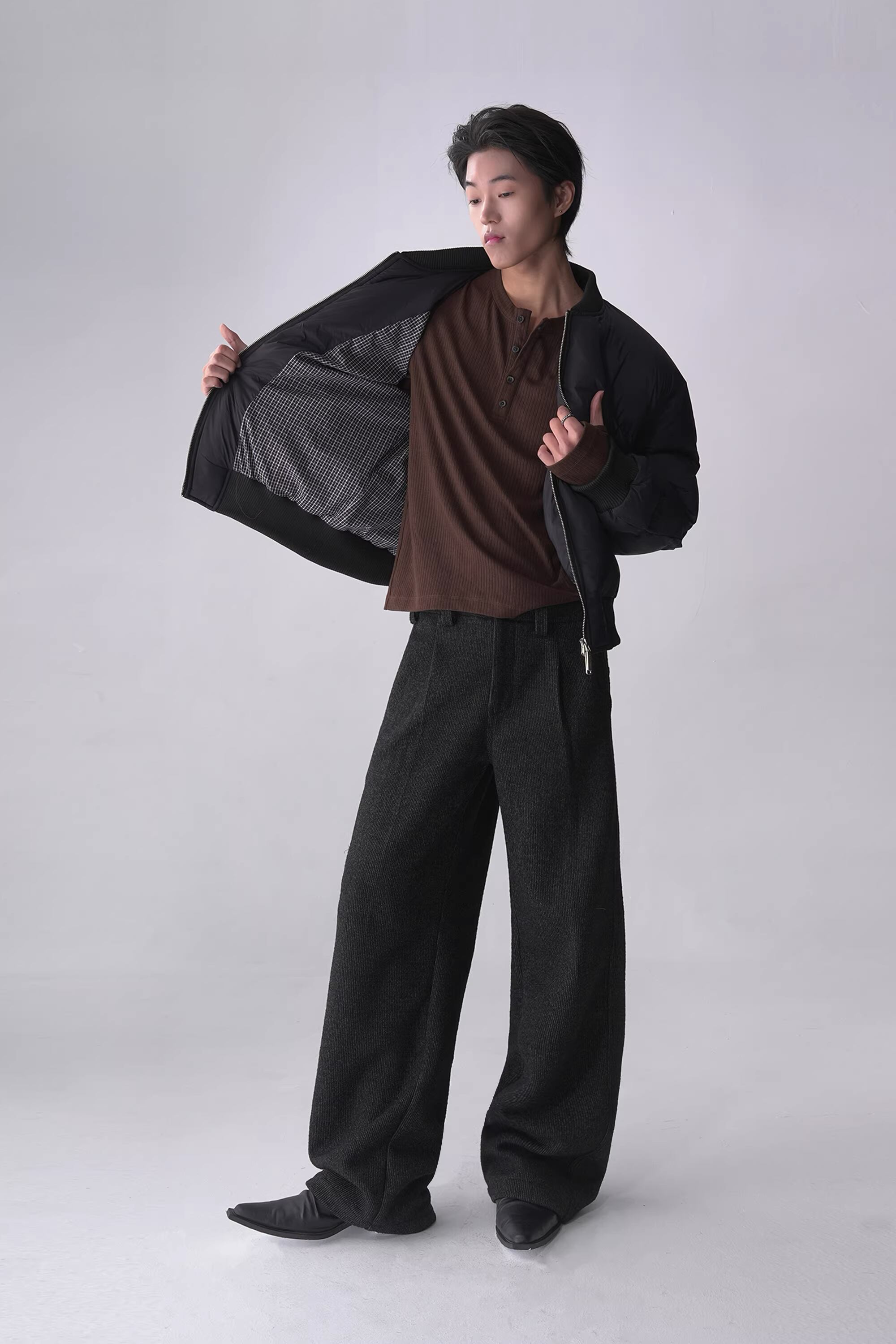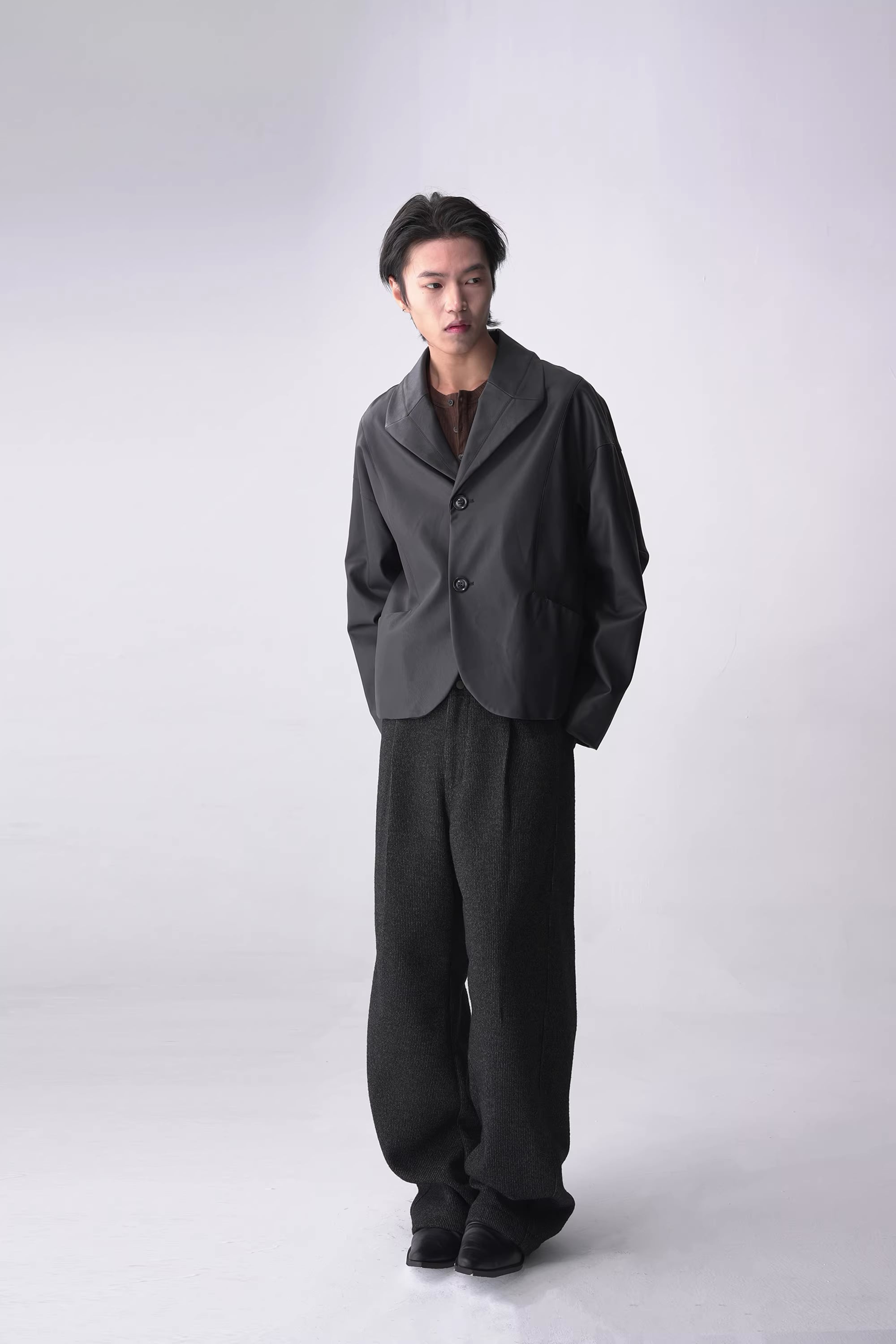 「信陵・遊侠録」シリーズより、重厚感のあるウールライクな質感が特徴のワイドスラックス。 ポリエステルとナイロンを高密度に混紡した複合素材を使用し、厚手で保温性が高く、美しいドレープ性を備えています。