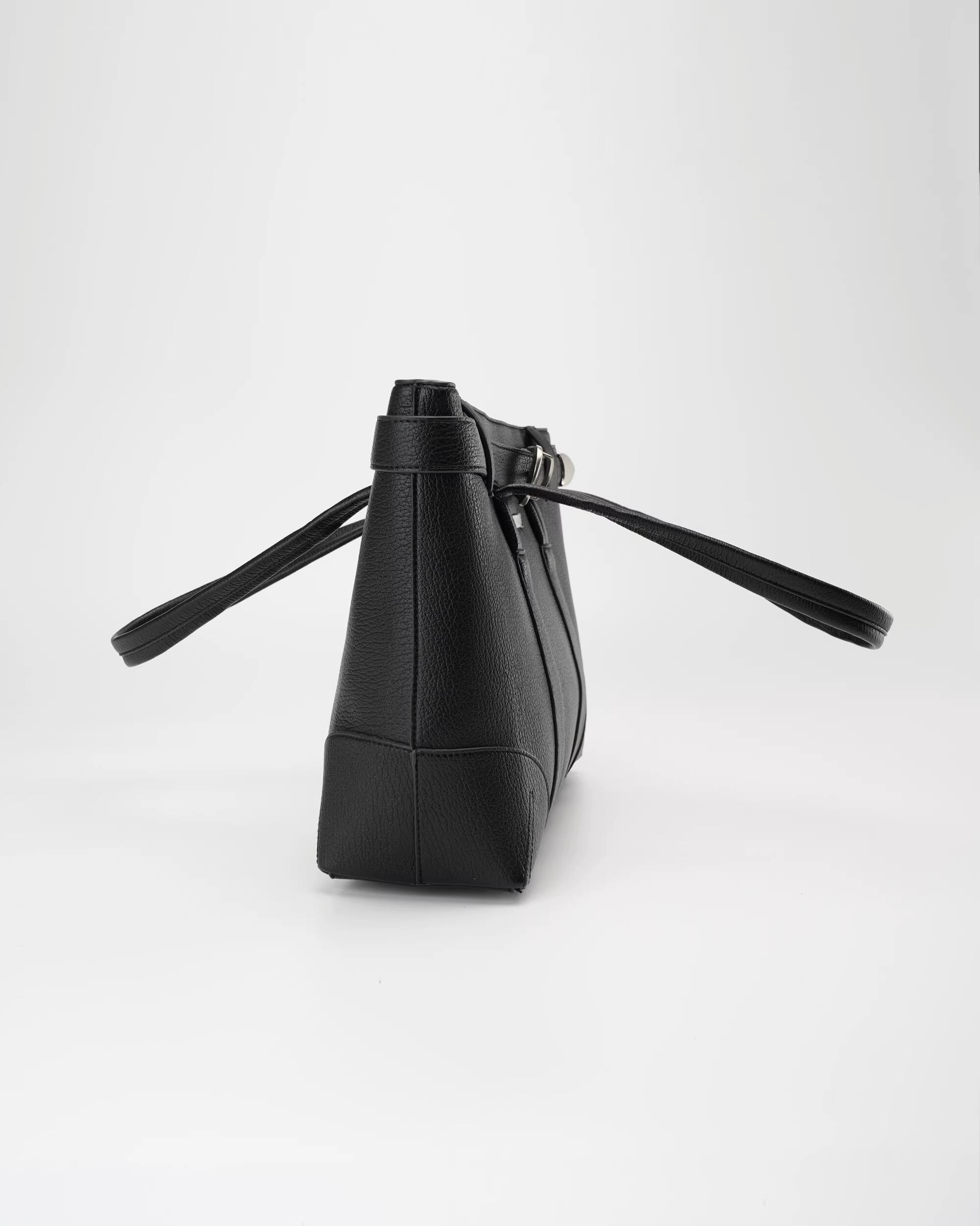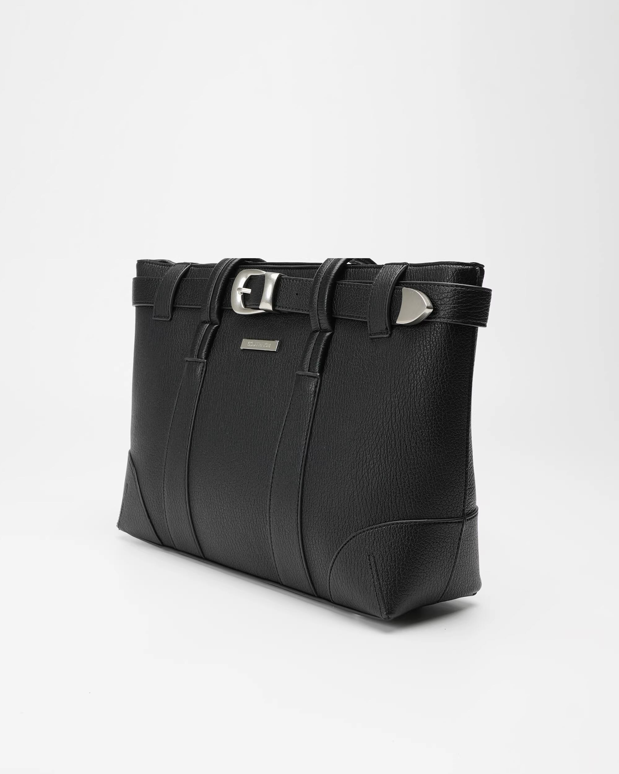 フロントにあしらわれたベルトデザインとシルバーのバックルが、シンプルながらもモダンなアクセントを加えています。