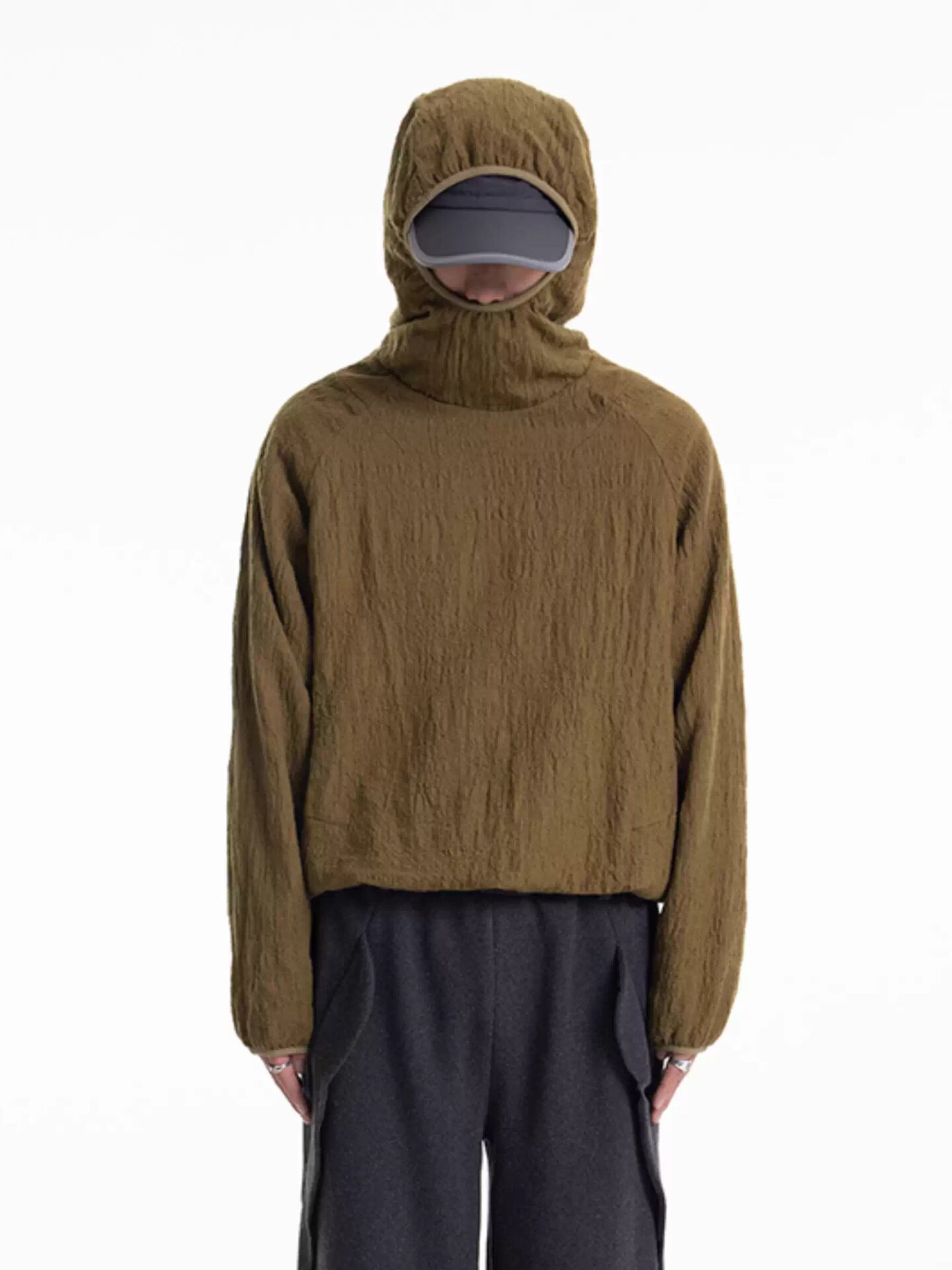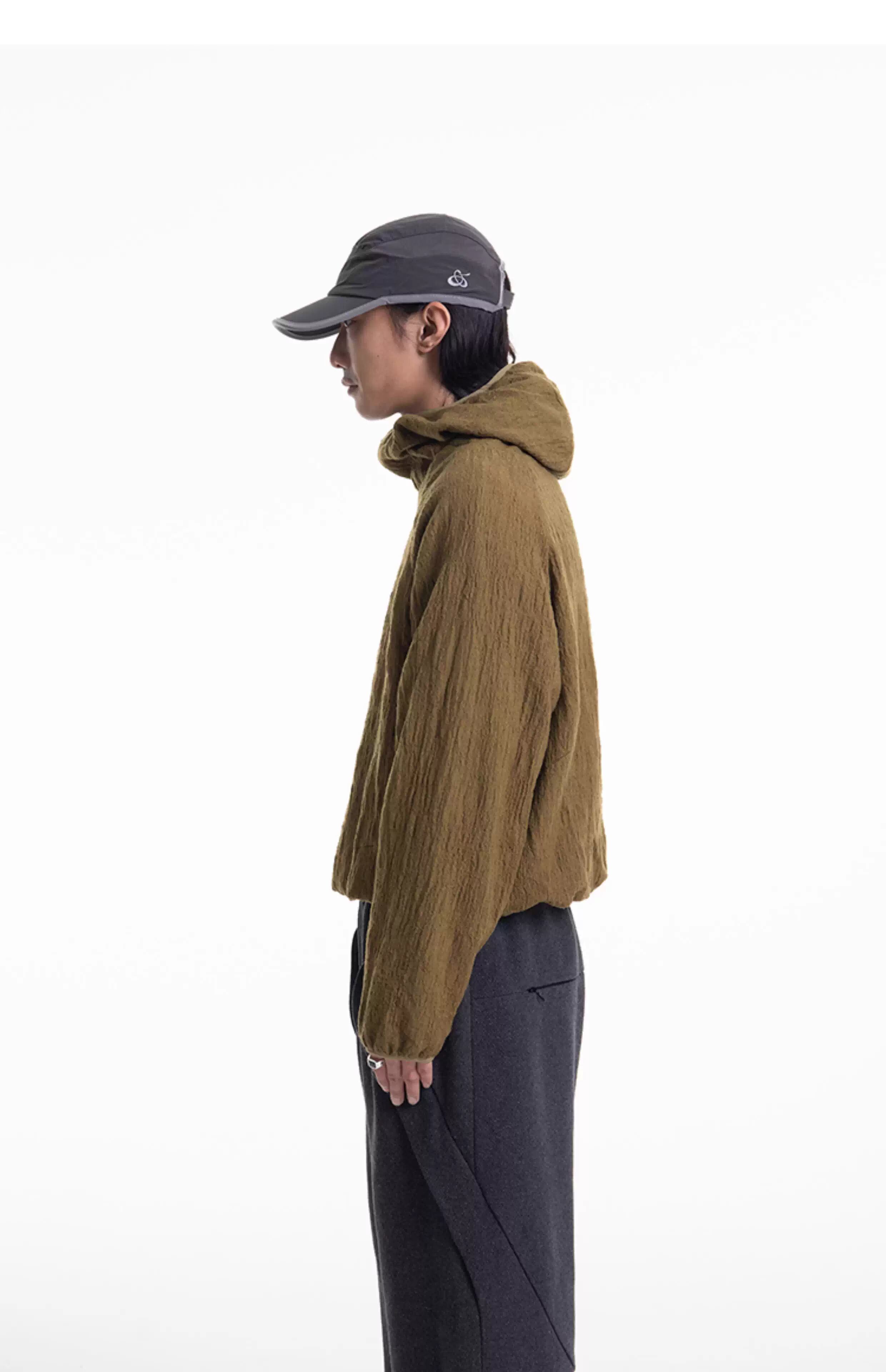 フードの縁には伸縮性のあるパイピングを施し、フィット感とスポーティなアクセントをプラス。