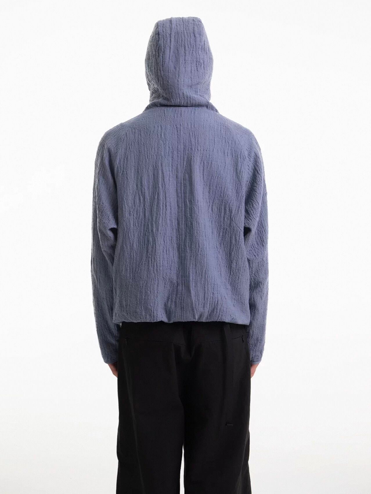 ウール65%とコットン35%をブレンドした、独特のシワ感(プリーツテクスチャ)とふんわりとした微起毛感が特徴のプルオーバーフーディー。