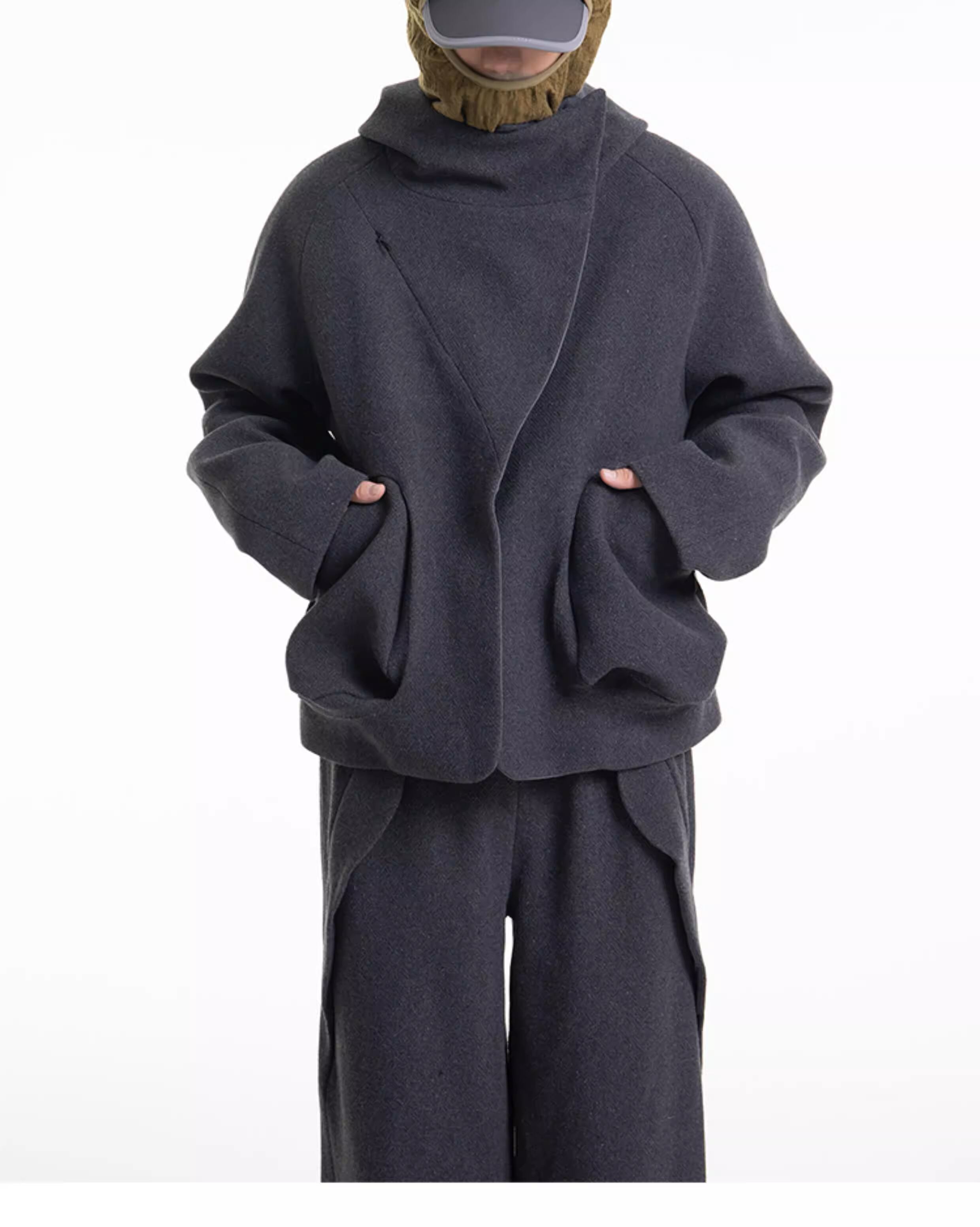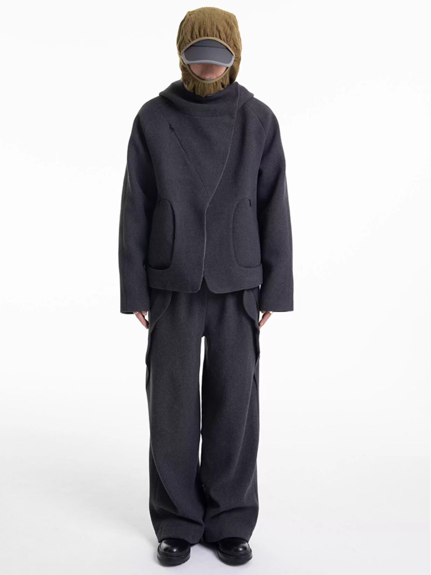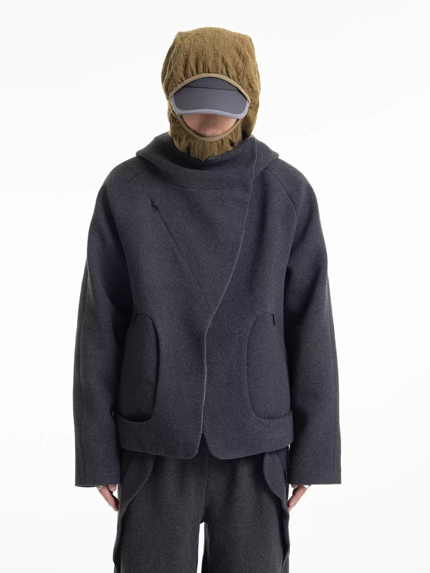 独特なデザインと温かさを兼ね備えたDeconstructive Wool Hooded Jacket。