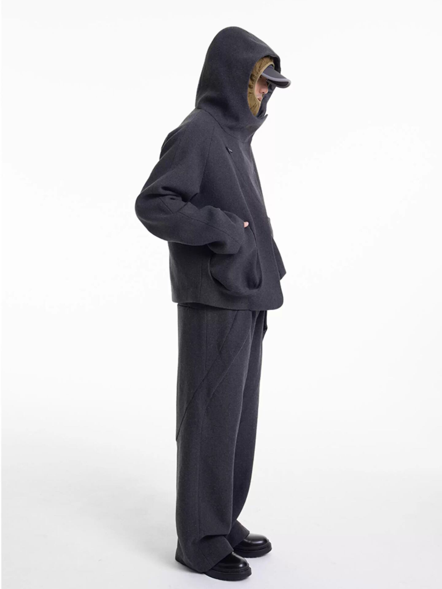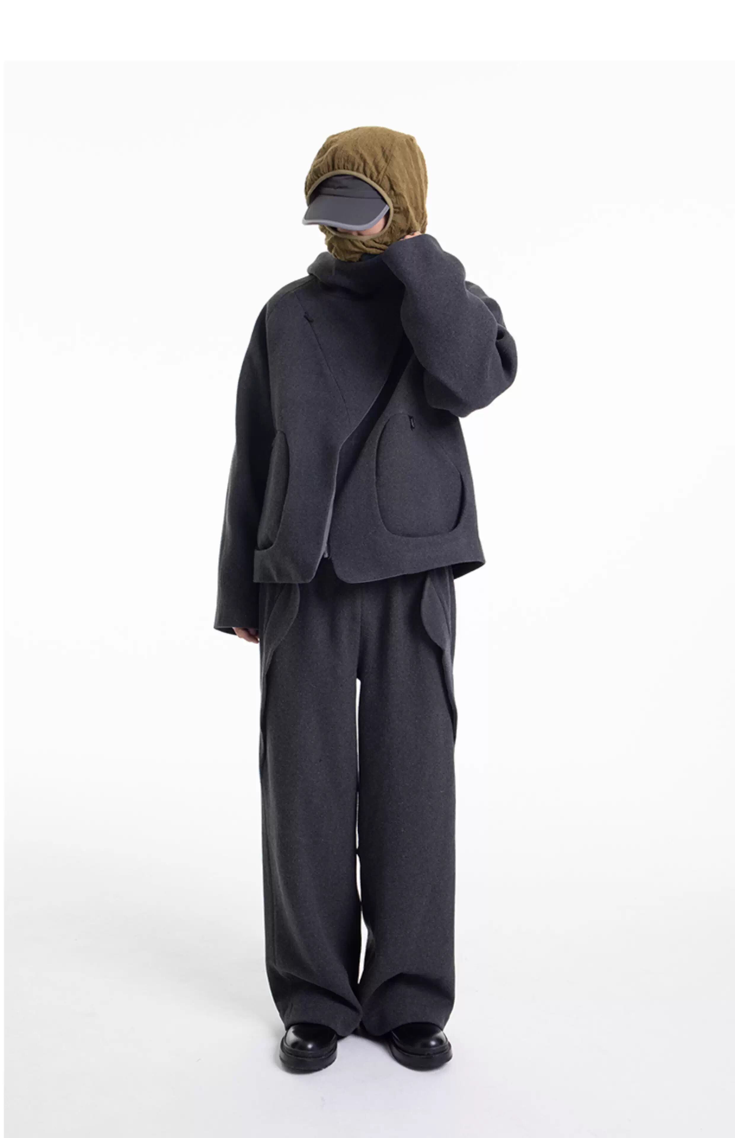 内側には裏地が施されており、ウール特有の肌への刺激を防ぎながら滑らかな穿き心地を実現。最大の特徴は、葉っぱのような形状を取り入れたサイドポケットのデザインで、内部には隠しジッパーも装備されています。