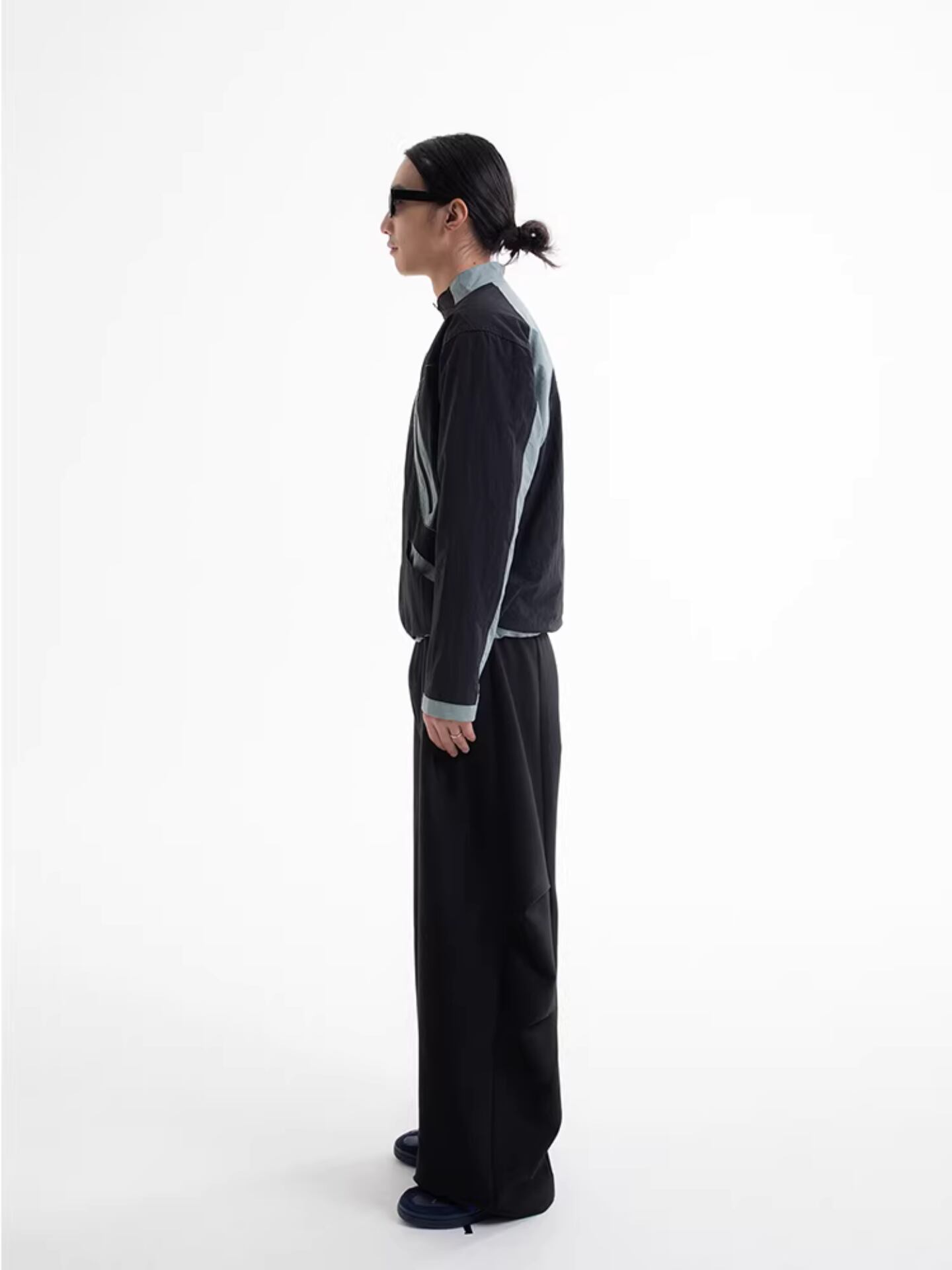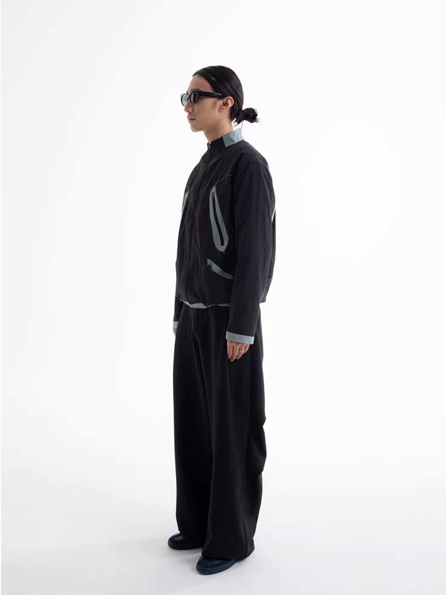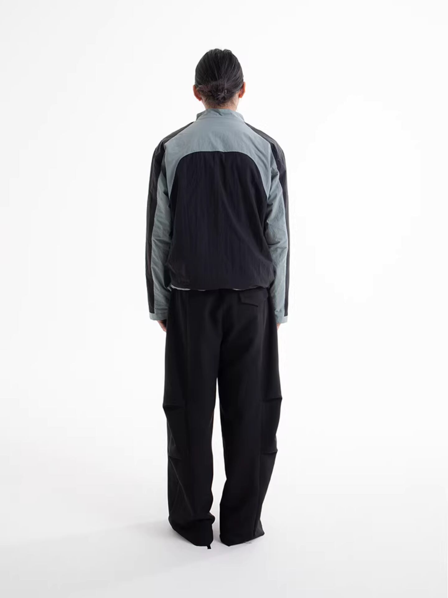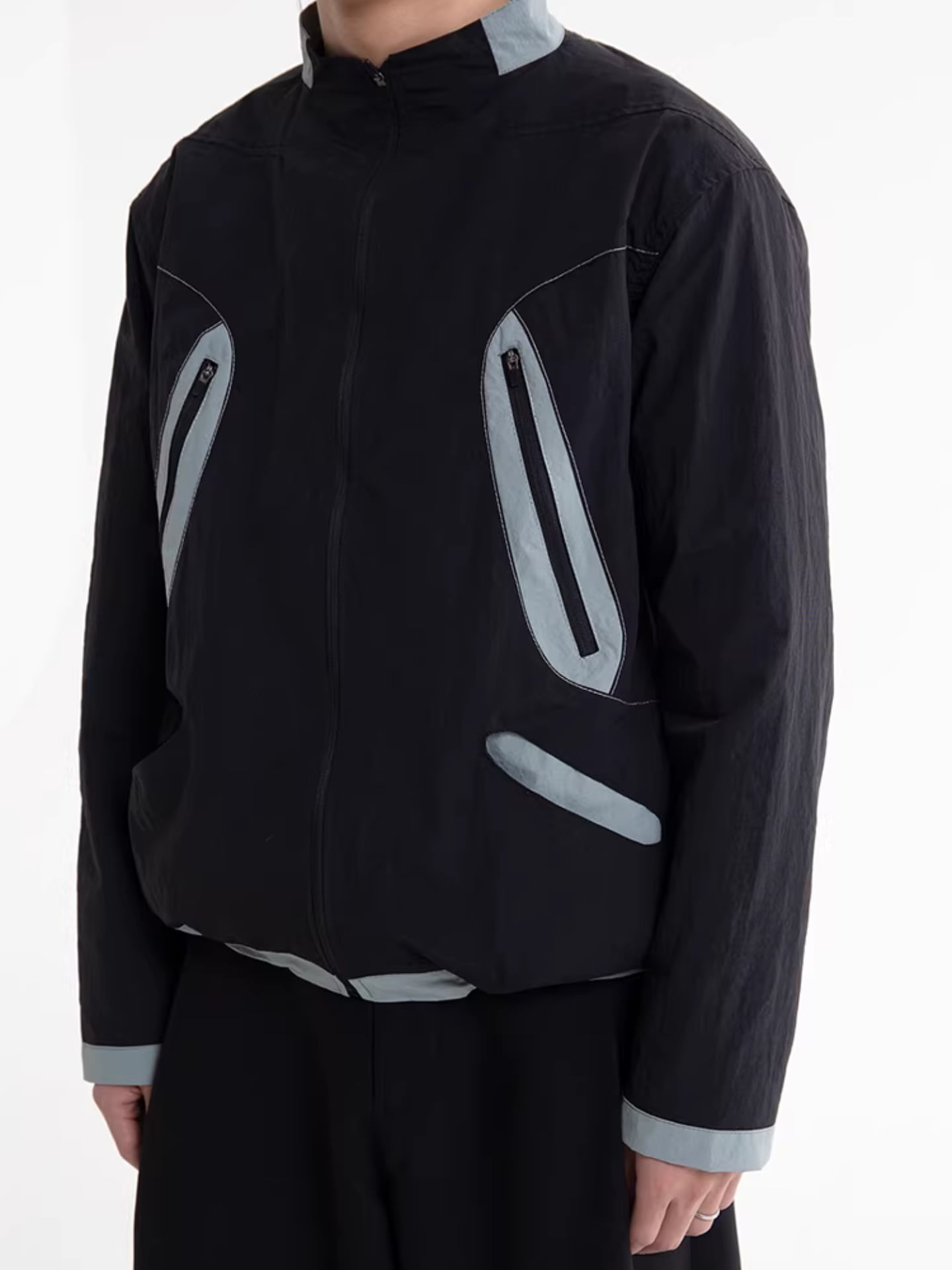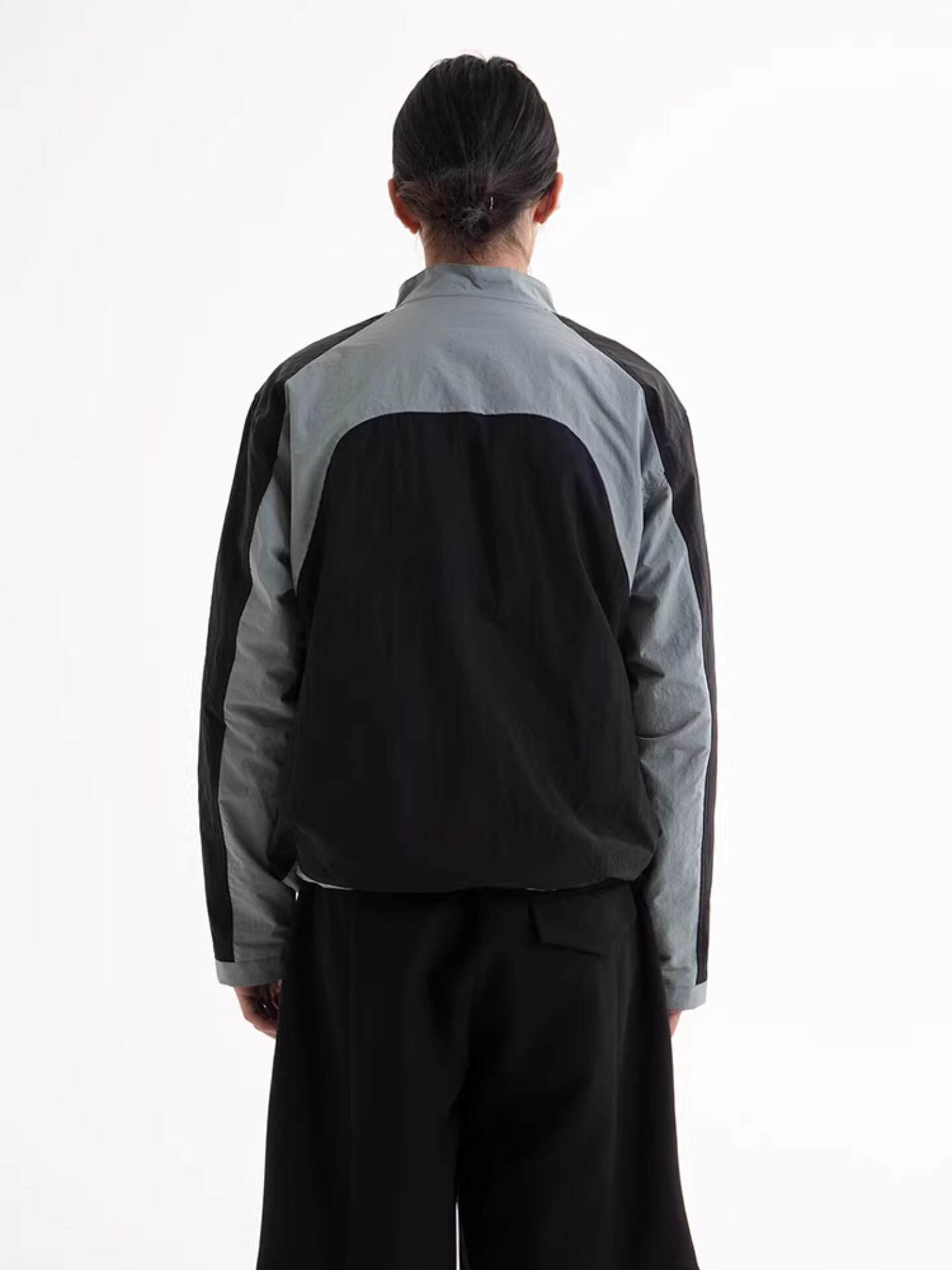 薄手で独特のシワ感を持つナイロン生地を使用し、防風性と撥水性を兼ね備えた機能的なスタンドカラージャケット。