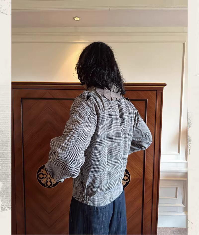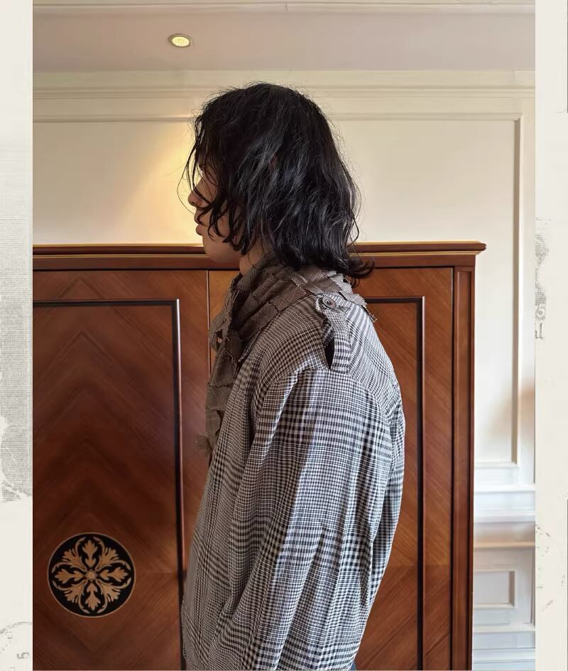 ナイフカットによるダメージ加工を施したチェック柄の生地は、粗野な質感の中に海の塩気を感じさせます。