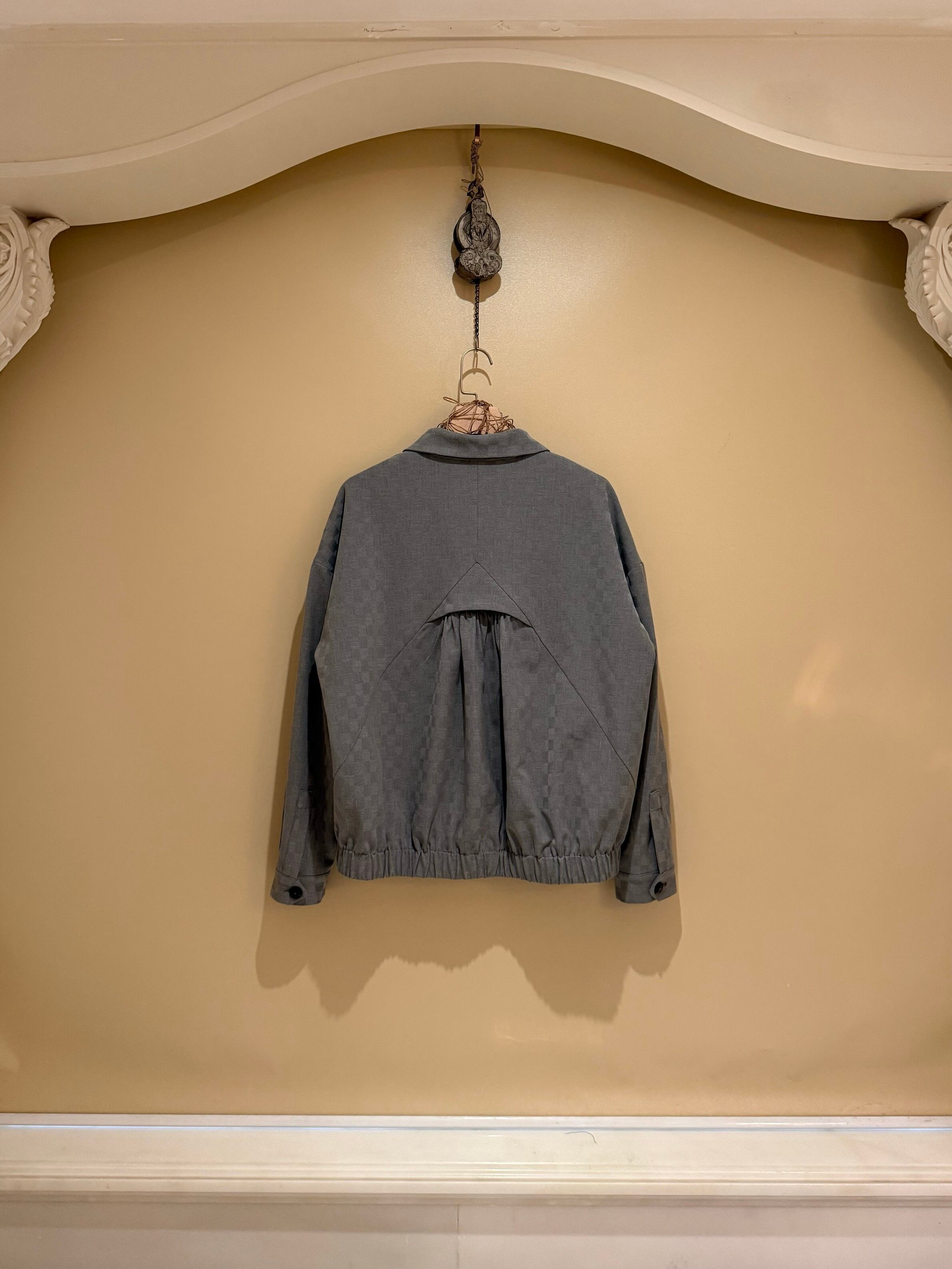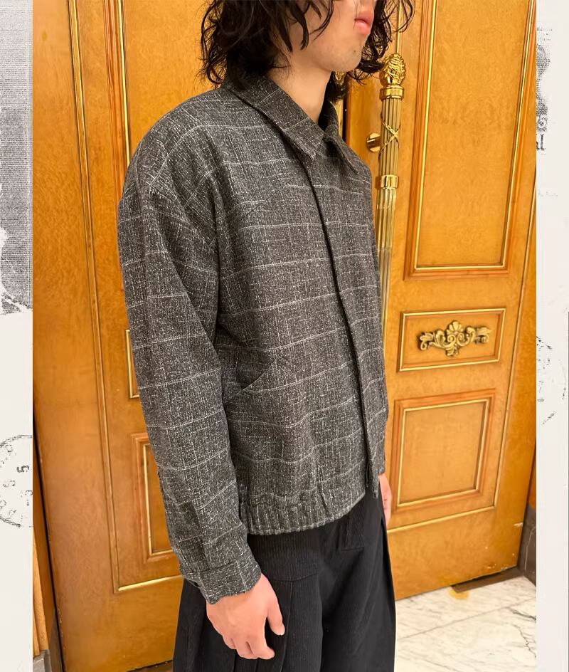 最大の特徴は、右身頃から裾にかけてなだらかにカーブする独特のカッティングと、それと対になるように配置された左側のパッチポケット。