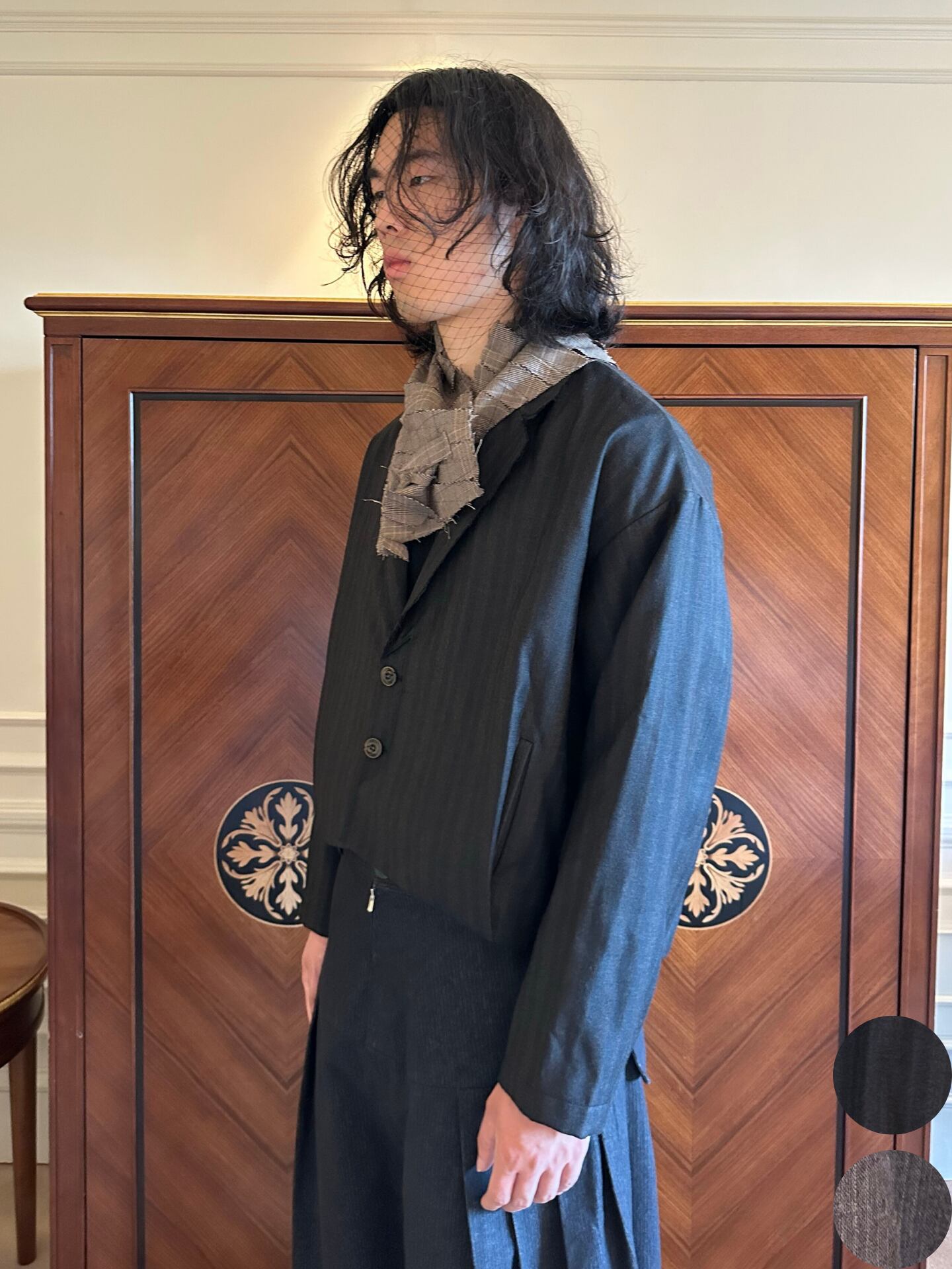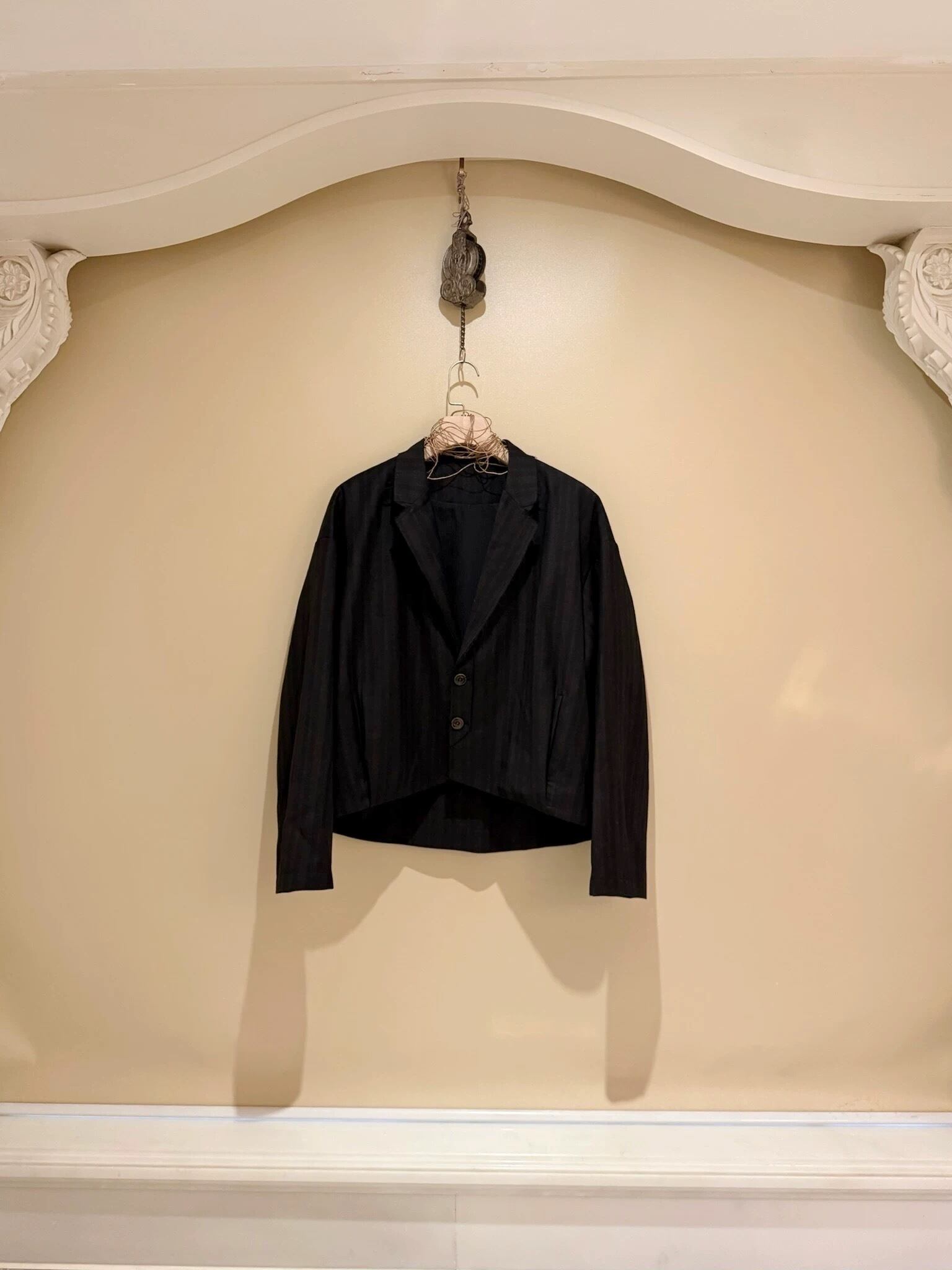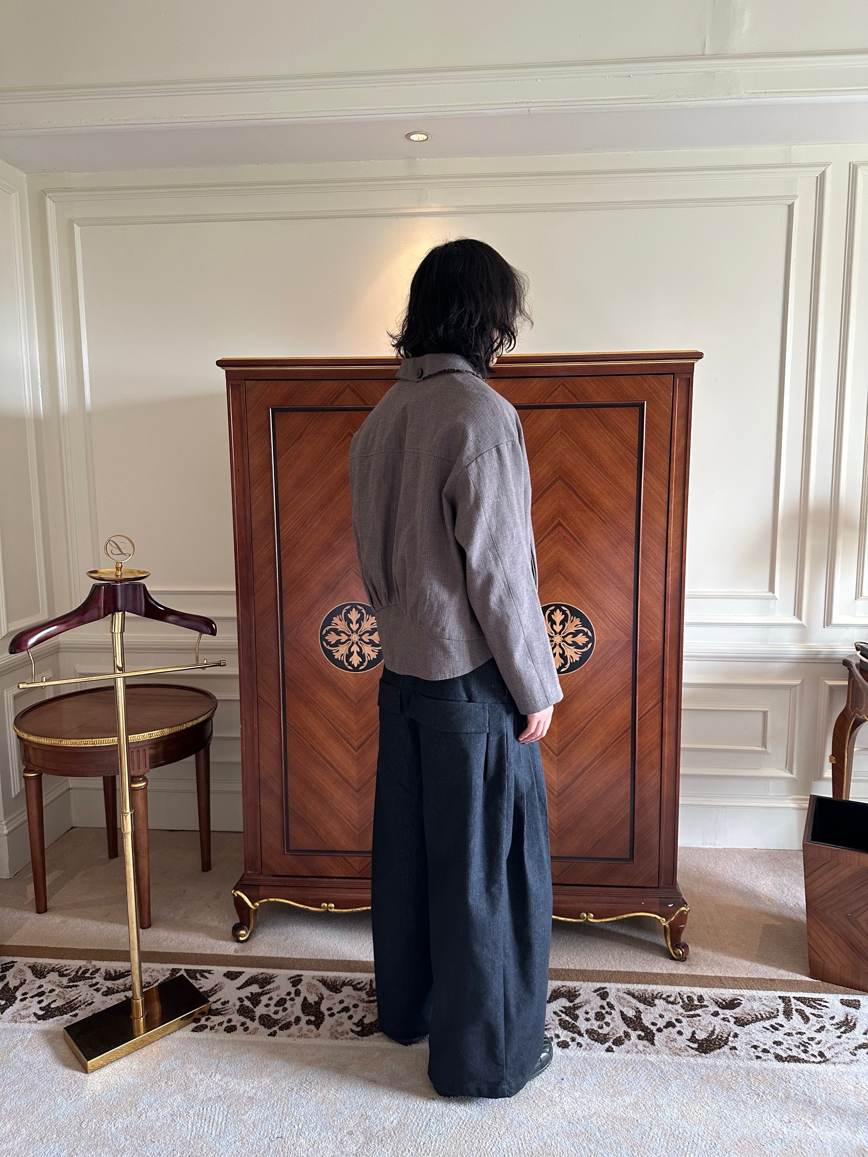 「特殊な平らなラペルは水平線のごとく静かであり、空洞になった二重の前立ては未知への入り口を暗示する」という詩的なコンセプト。