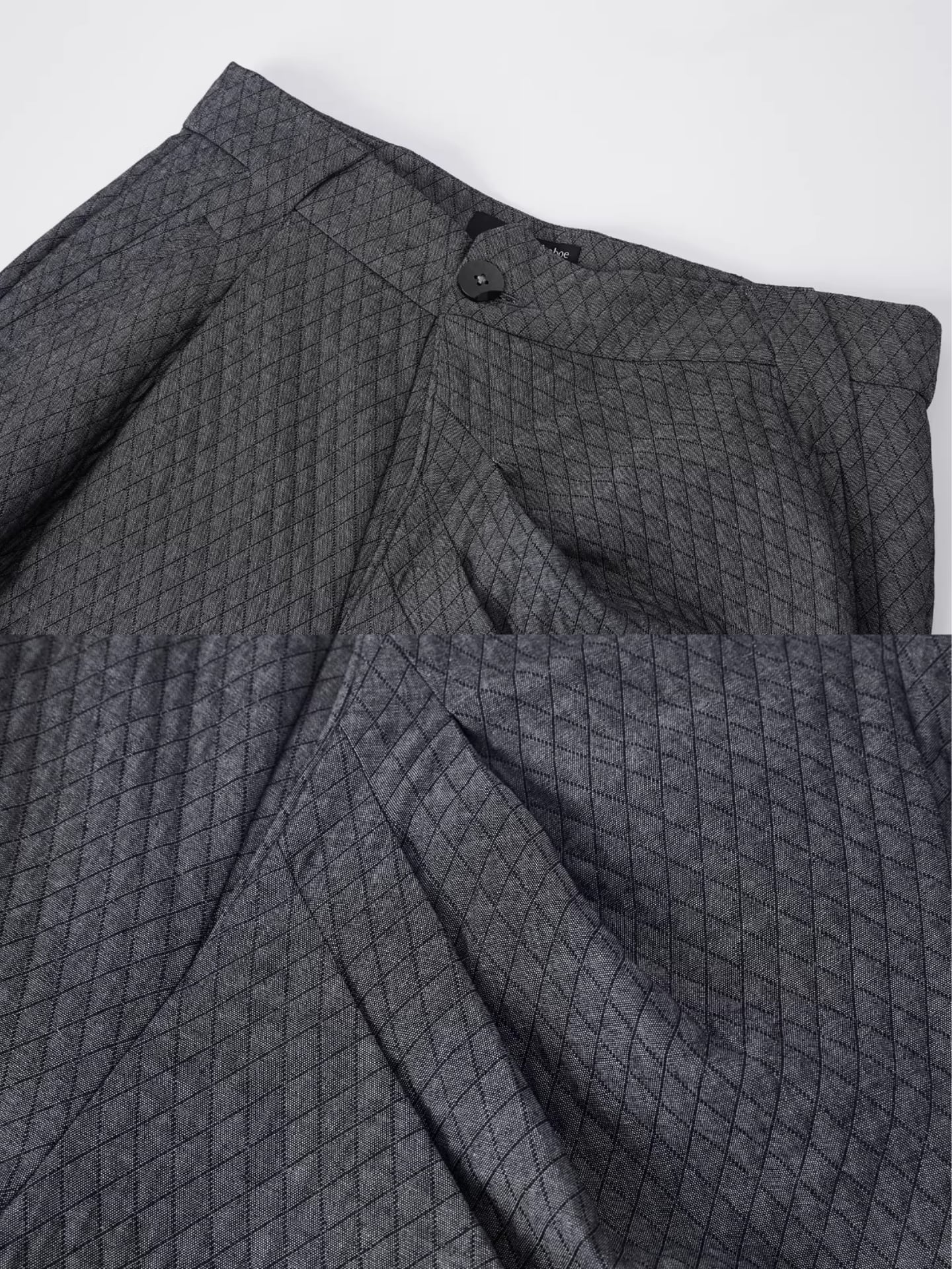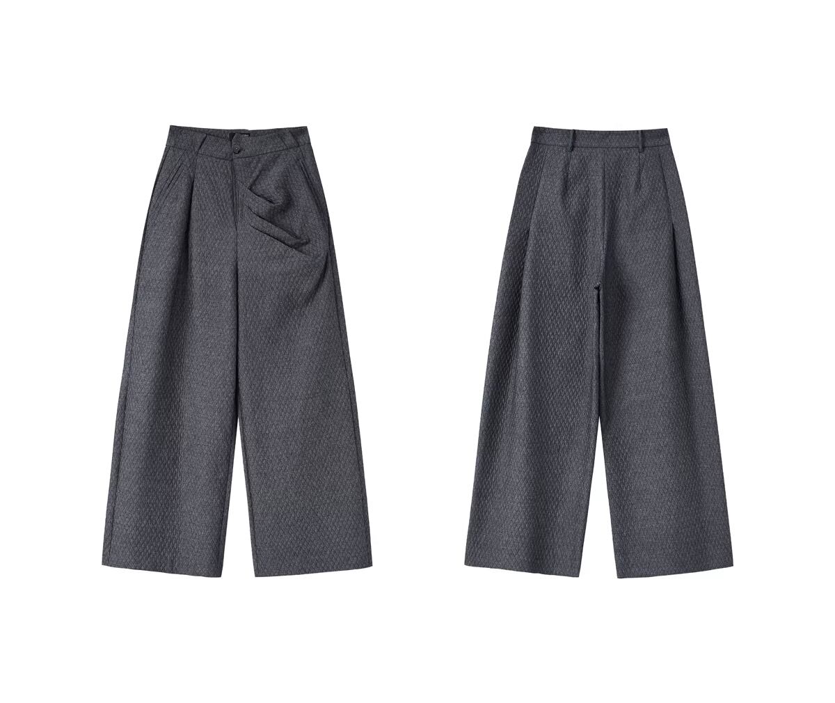 ウエスト部分の三連プリーツが腰回りに立体感と優雅なドレープを生み出し、リラックスしたワイドシルエットが歩くたびに風を孕みます。