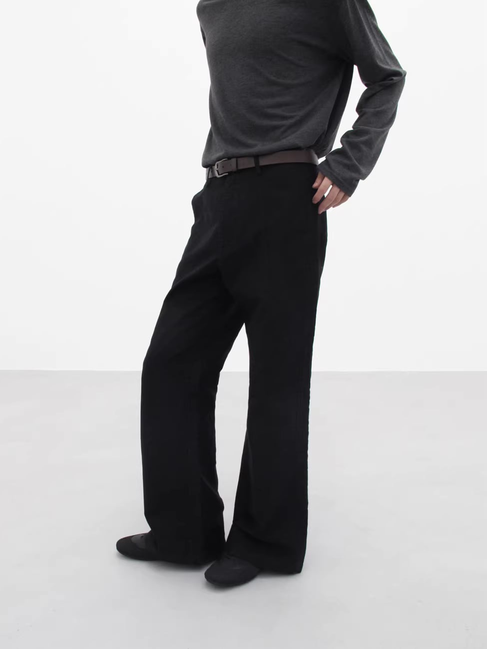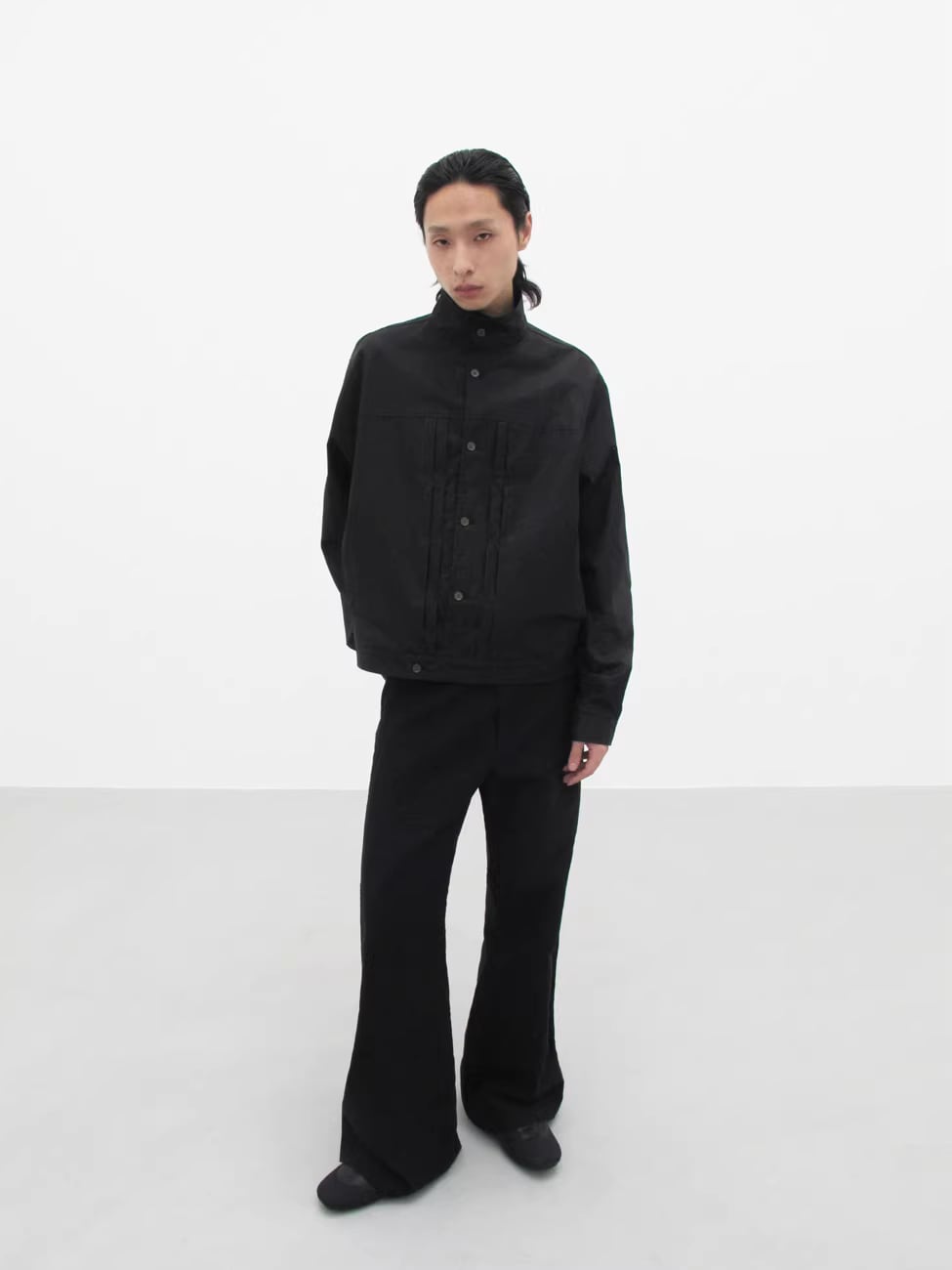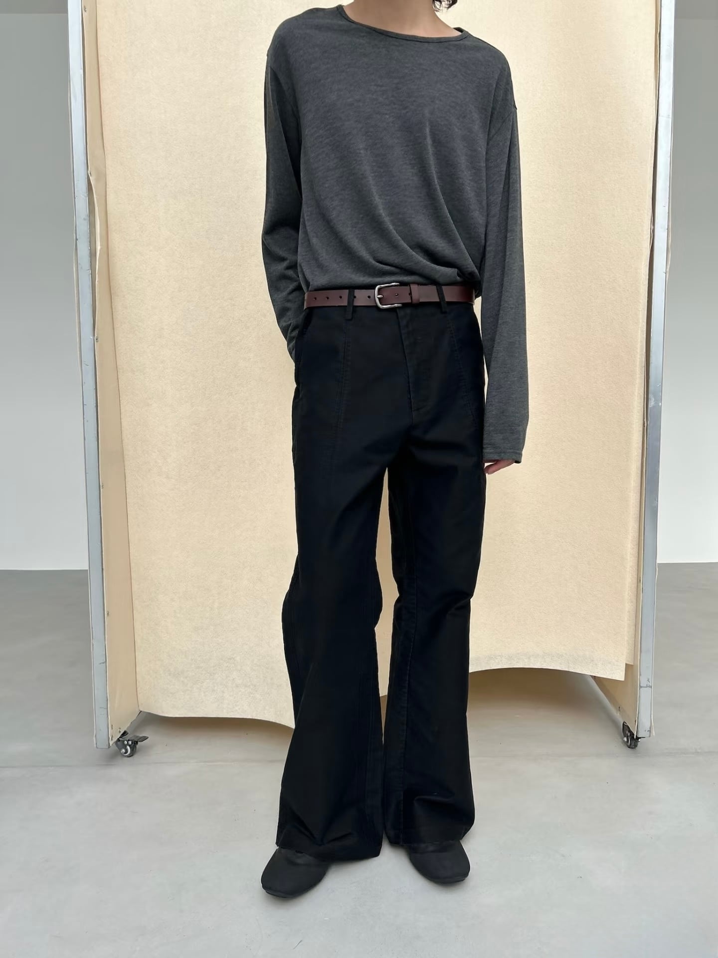 上質なモールスキン素材を採用し、独特の光沢感としっかりとしたハリを持たせたワイドトラウザーズ。