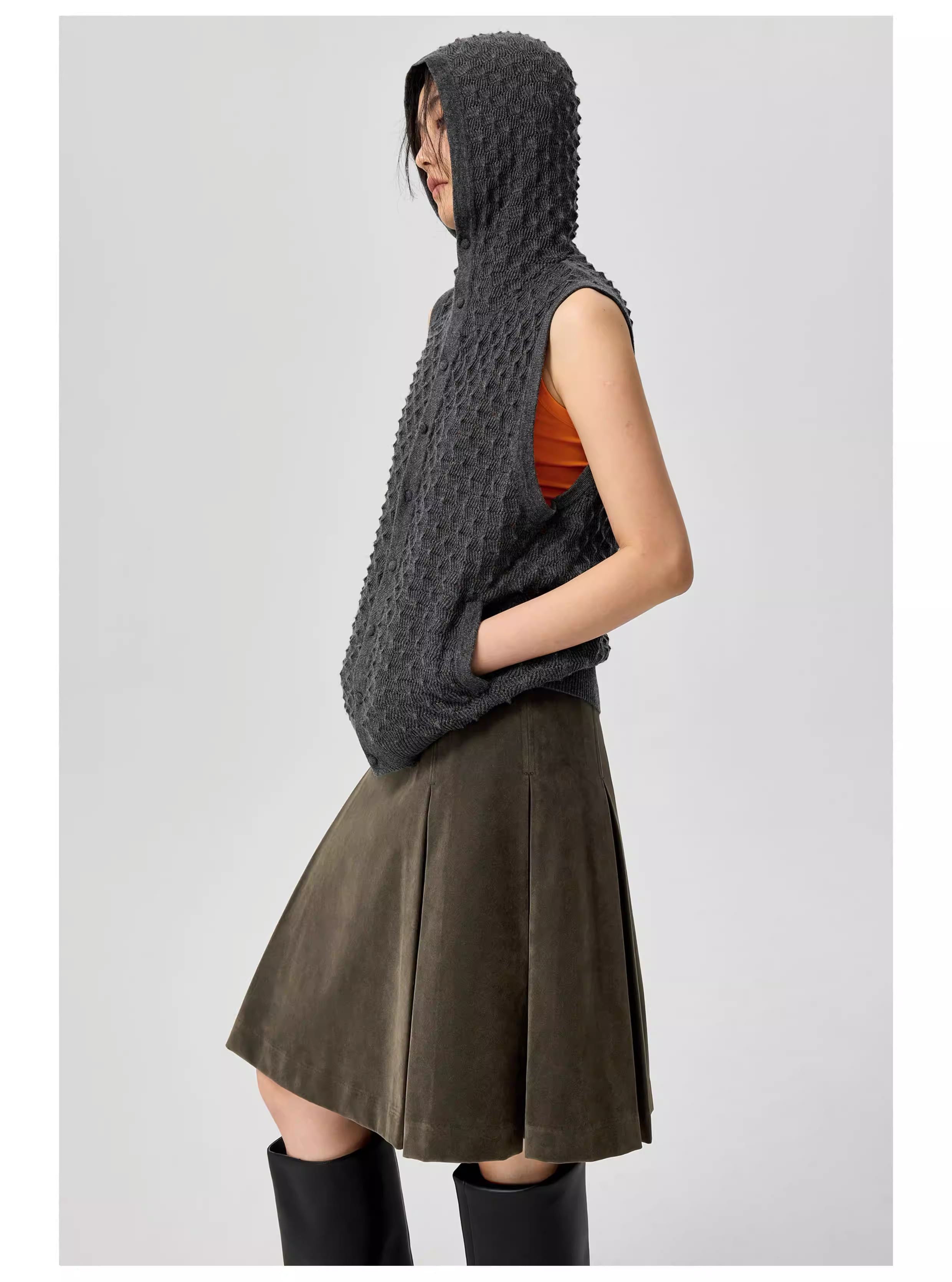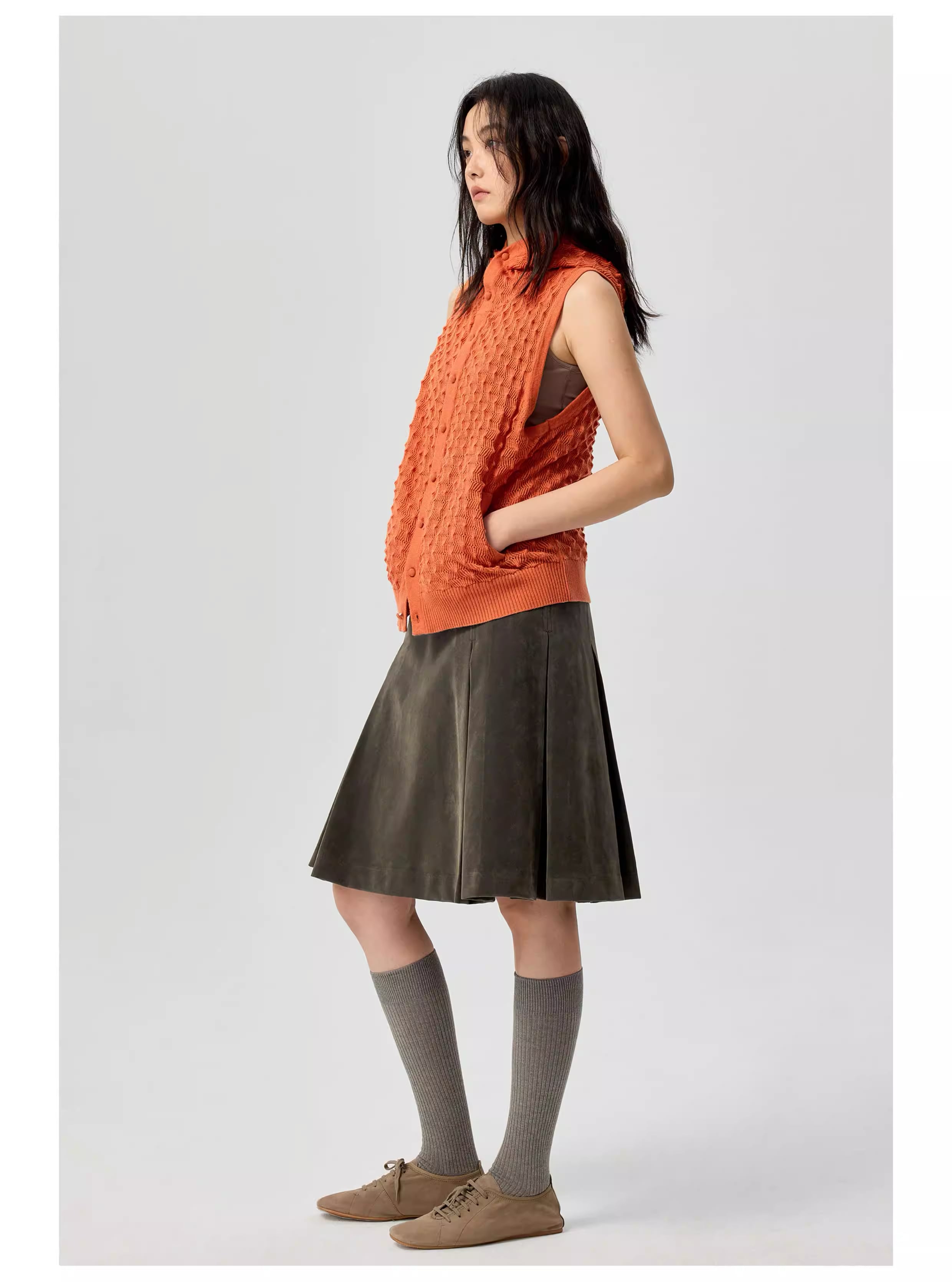 特注のニットくるみボタンや縦型のポケットなど、細部のディテールにもこだわり、洗練された大人のリラックススタイルを演出します。