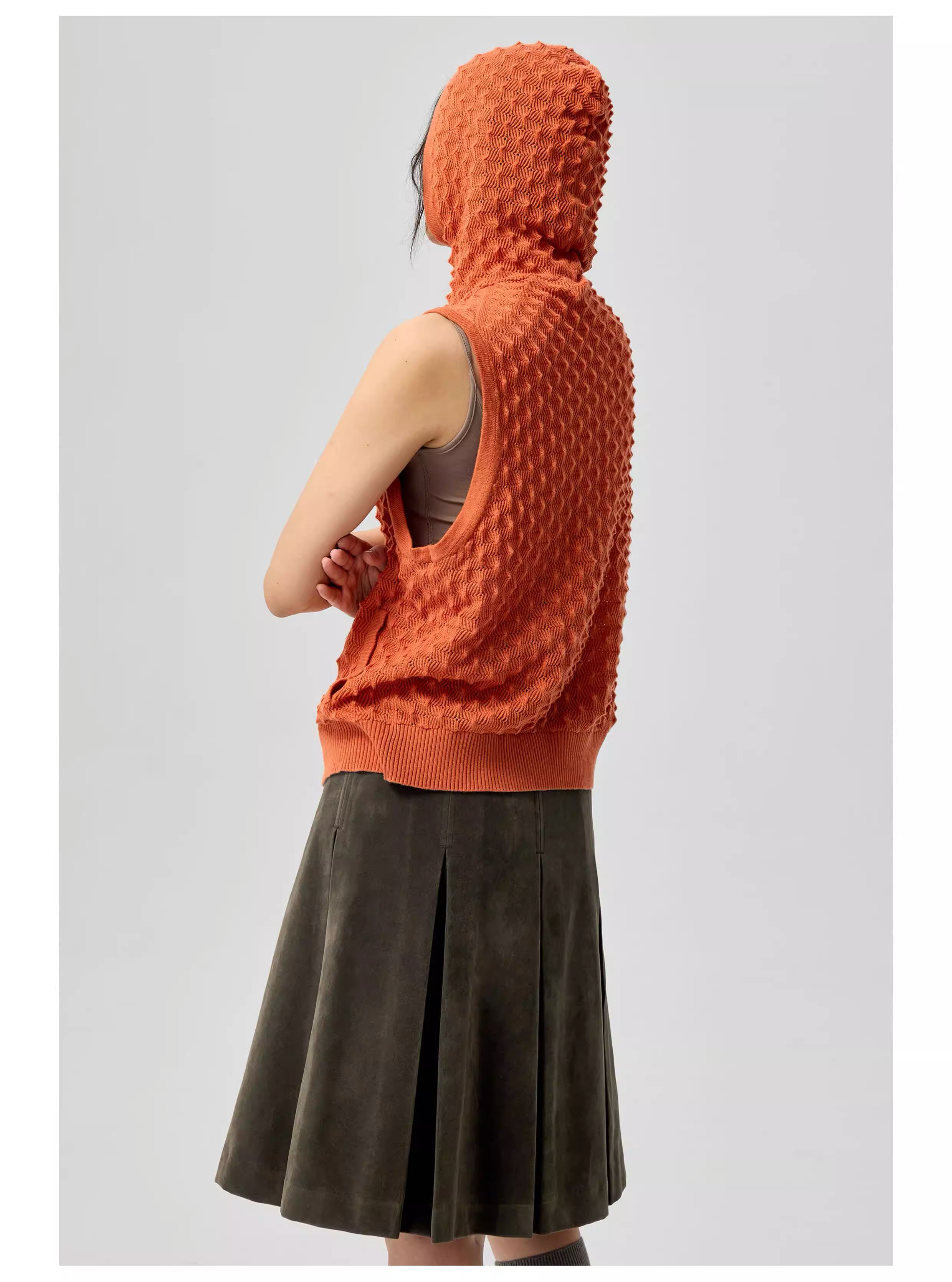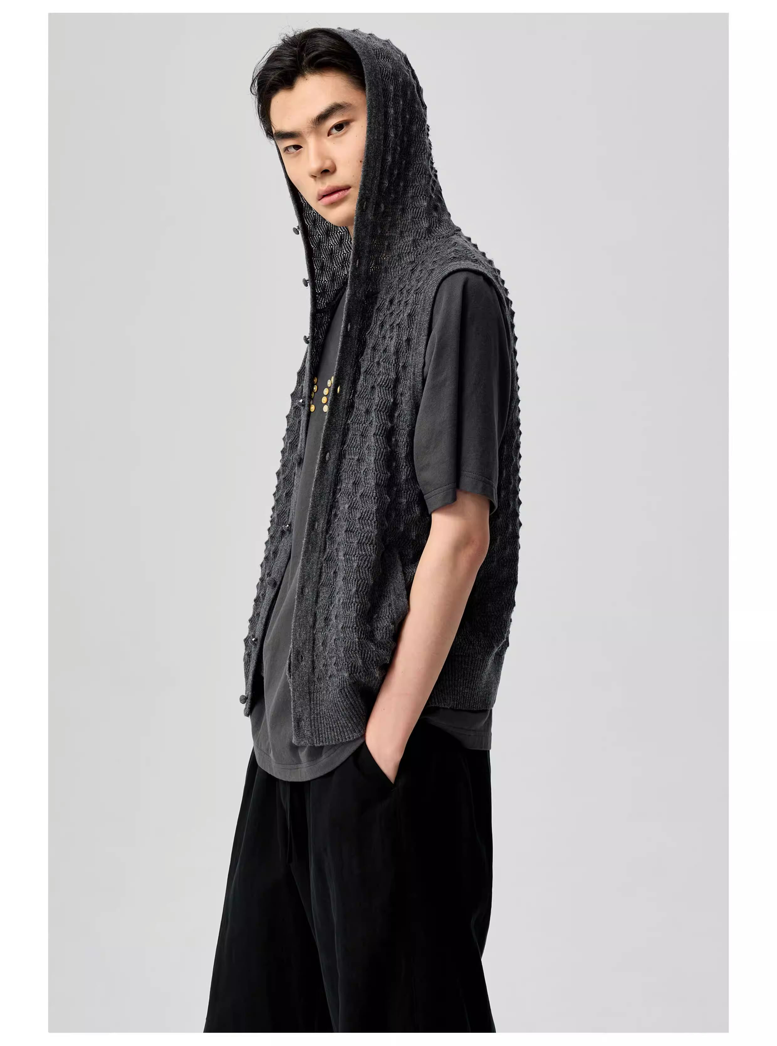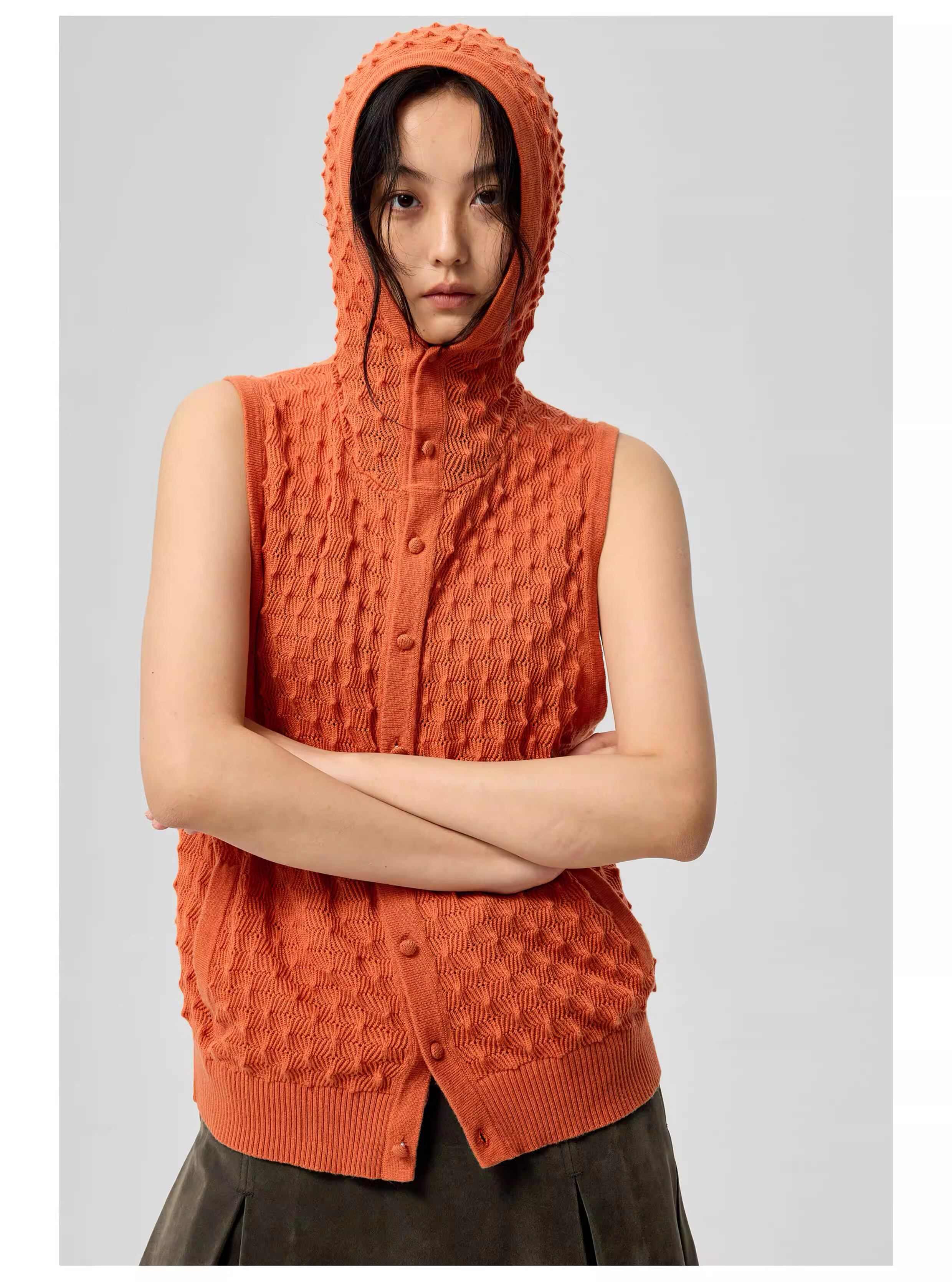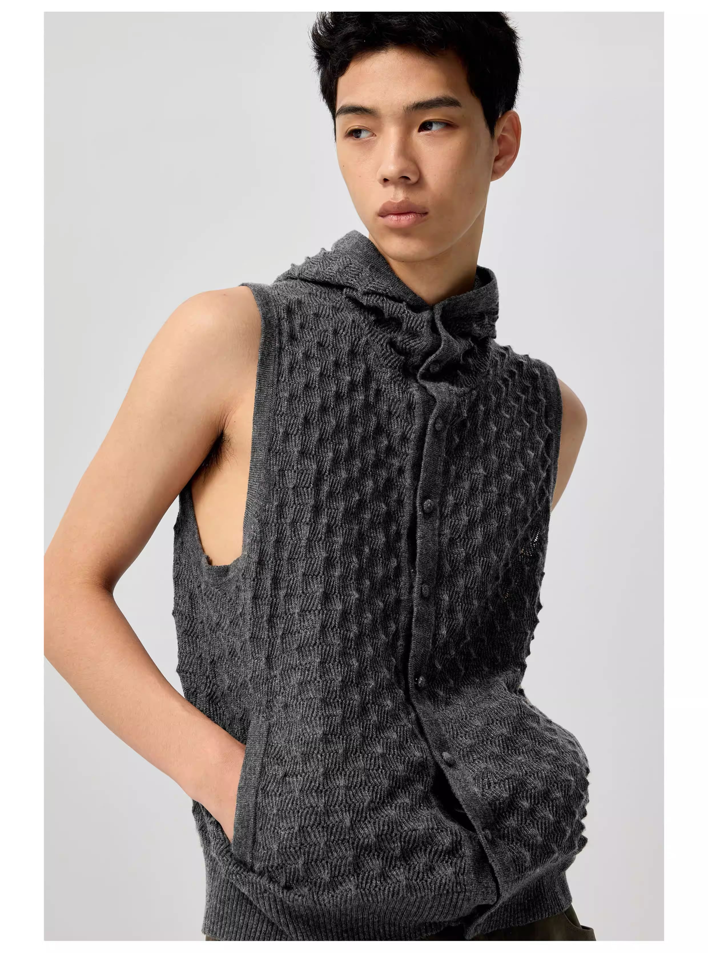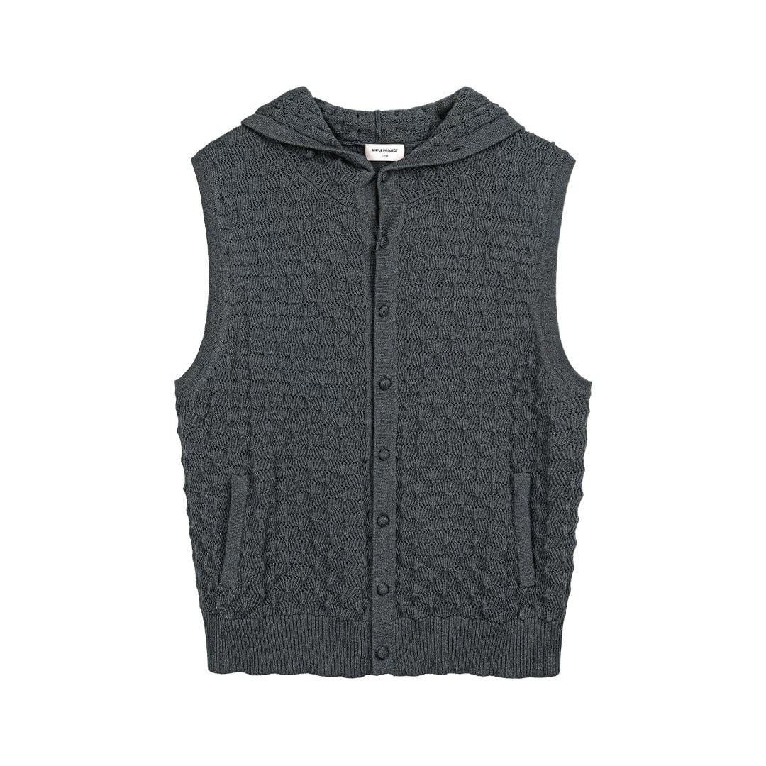 高品質なウール混紡糸を使用し、「パイナップル編み」による立体的なテクスチャーが特徴的なニットベスト。
