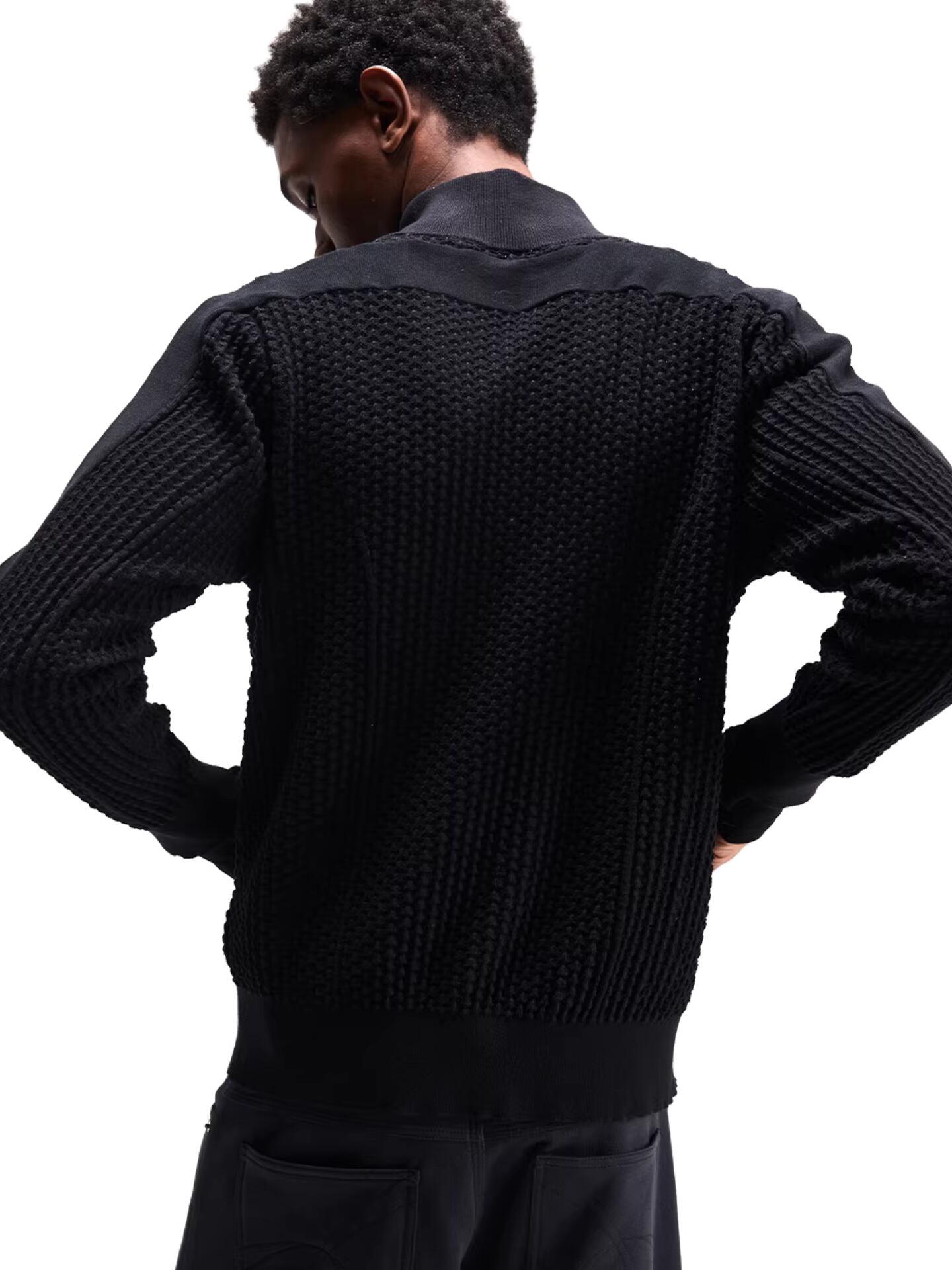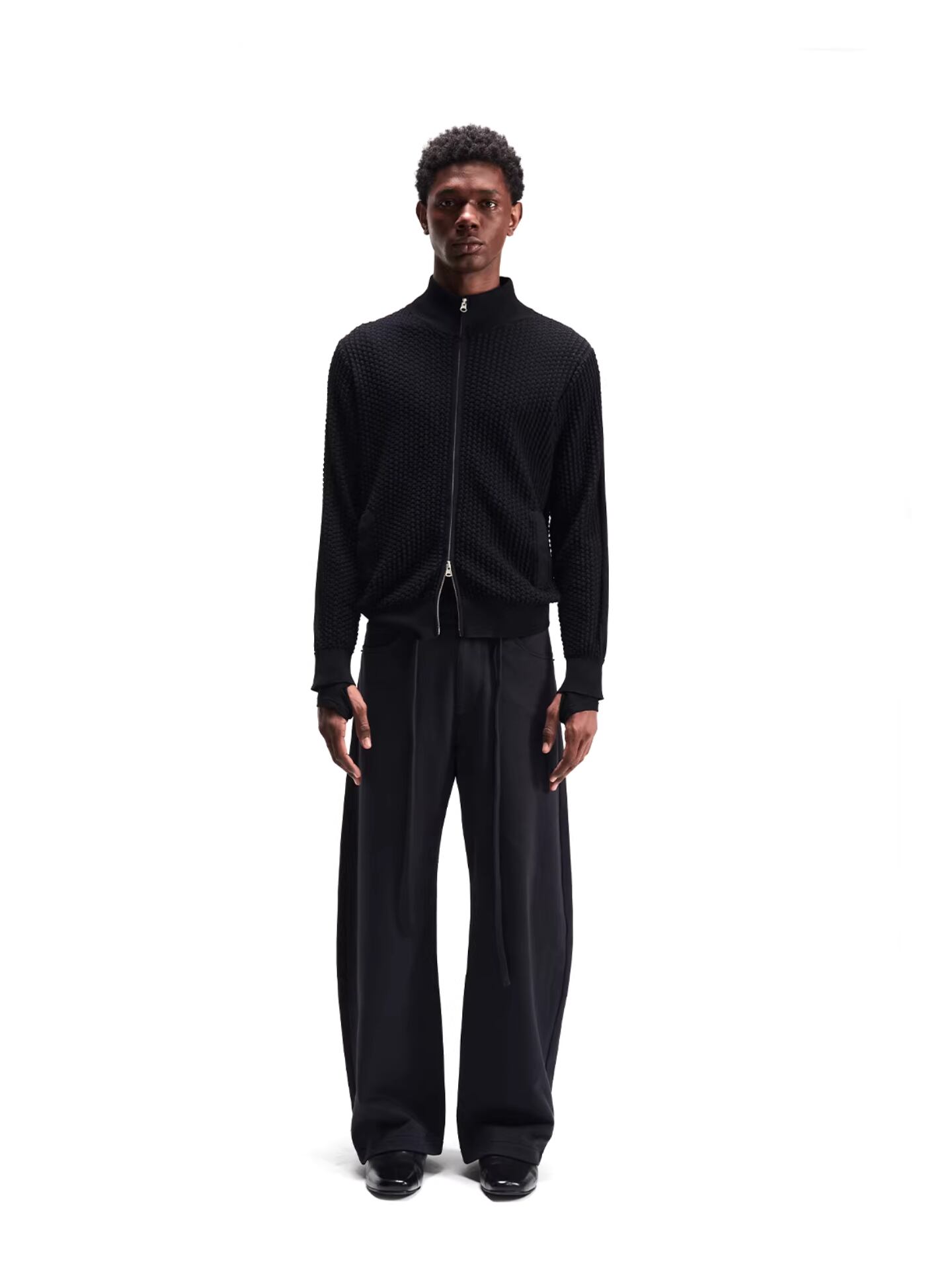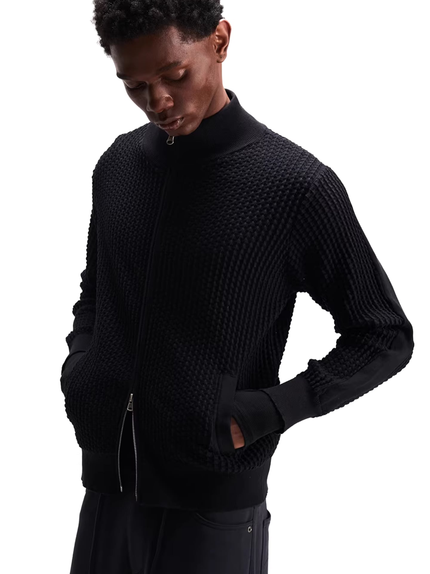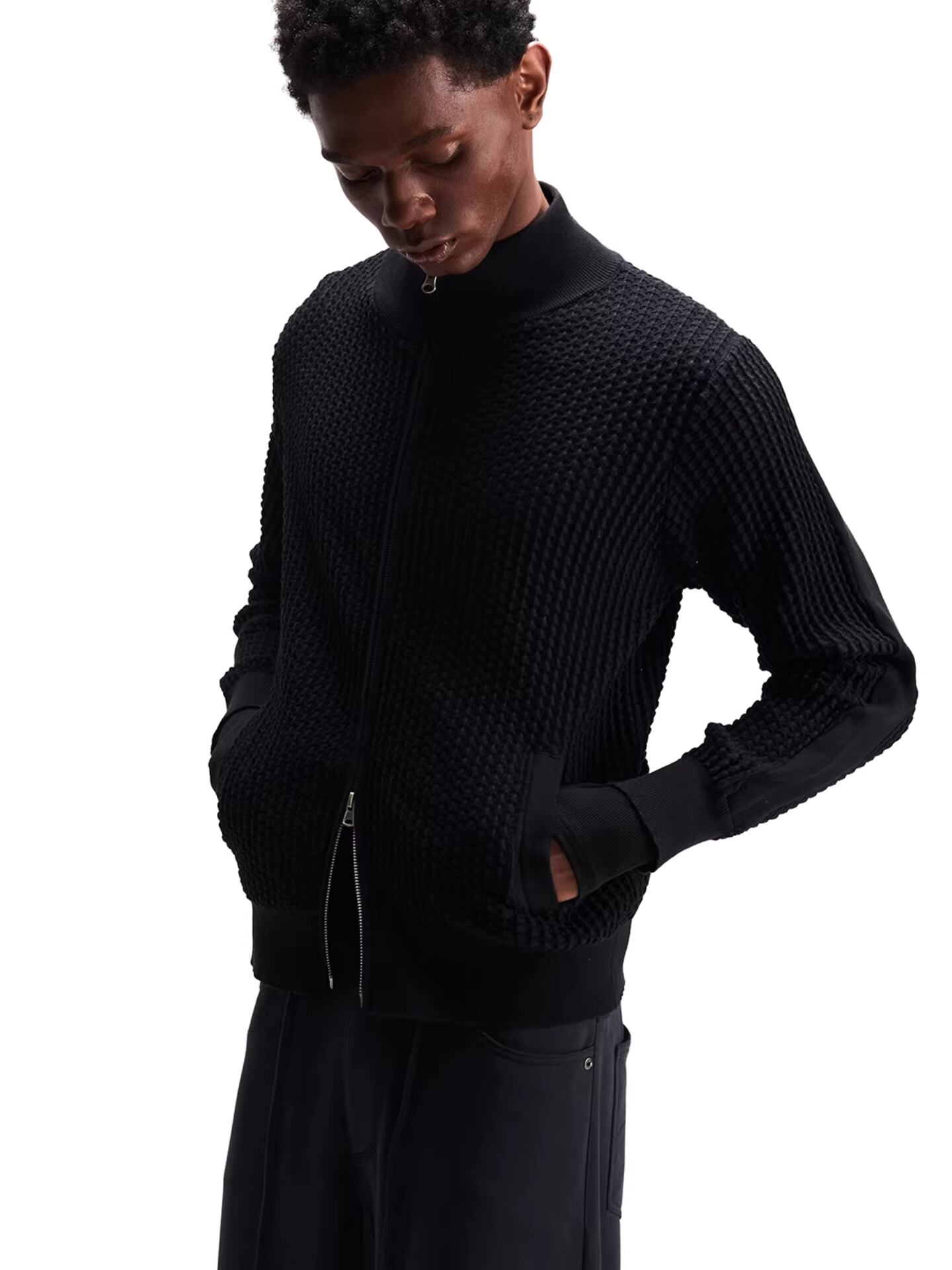 立体的な3Dメッシュ編みを採用した、スタンドカラーのニットジャケット。