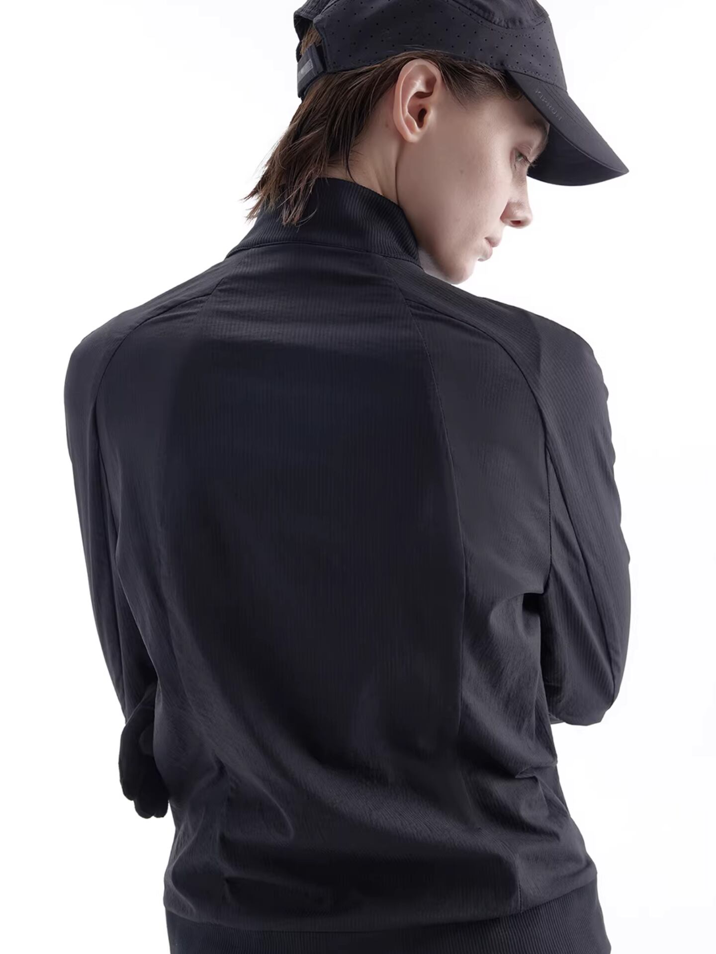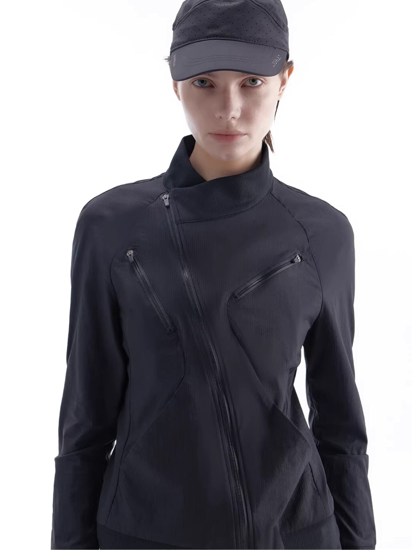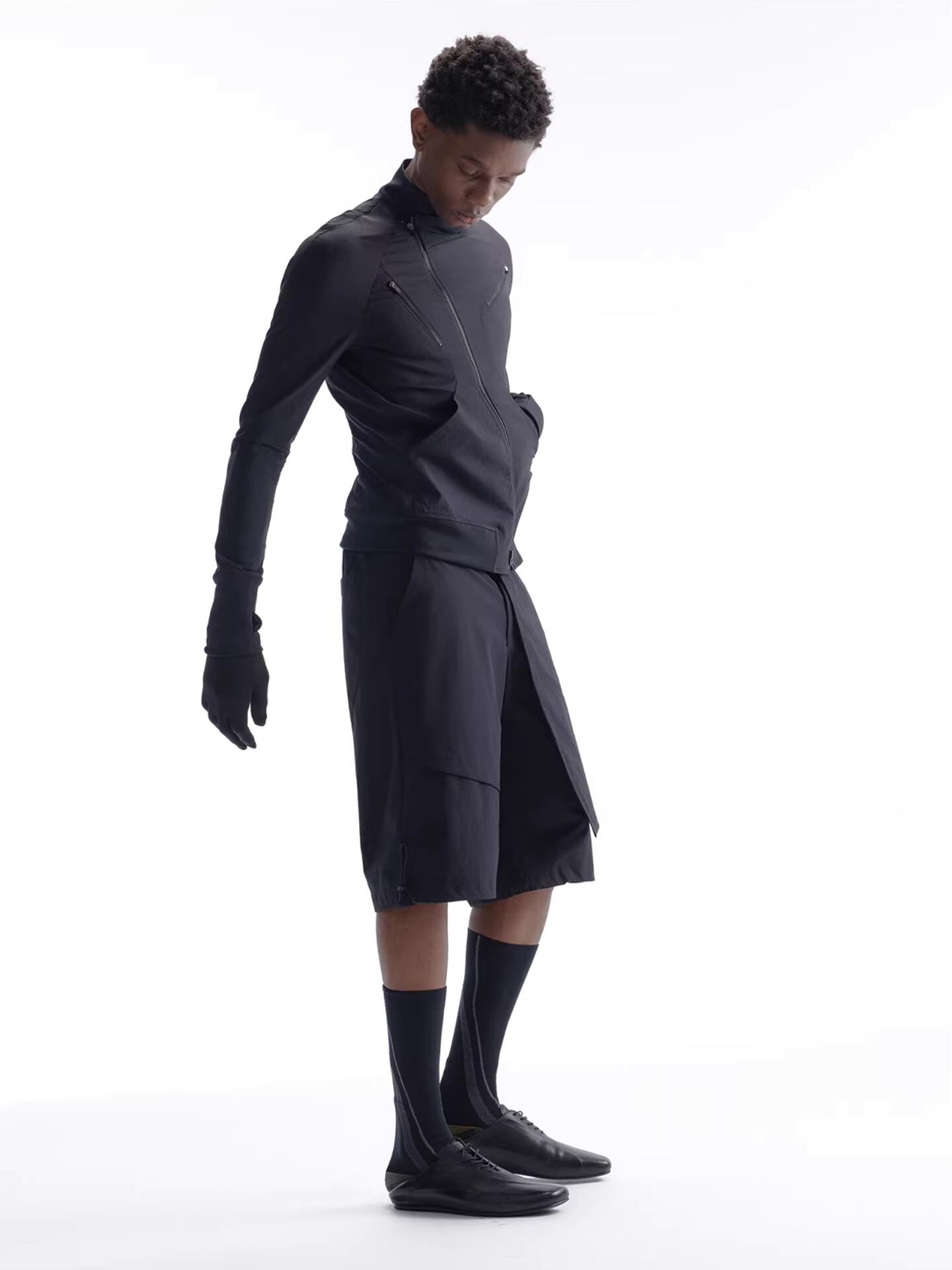生地にはさりげないシャドーストライプがあしらわれ、立体的で不規則なアシンメトリーカッティングと斜めに配されたジッパーが、洗練されたテックウェアの雰囲気を演出します。