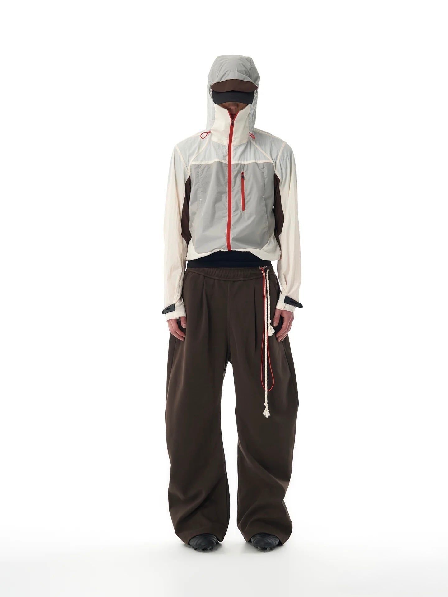 透け感のあるユニークなポケットデザインや、フロントの赤いジッパーが、洗練されたテックウェアのアクセントとして目を引きます。