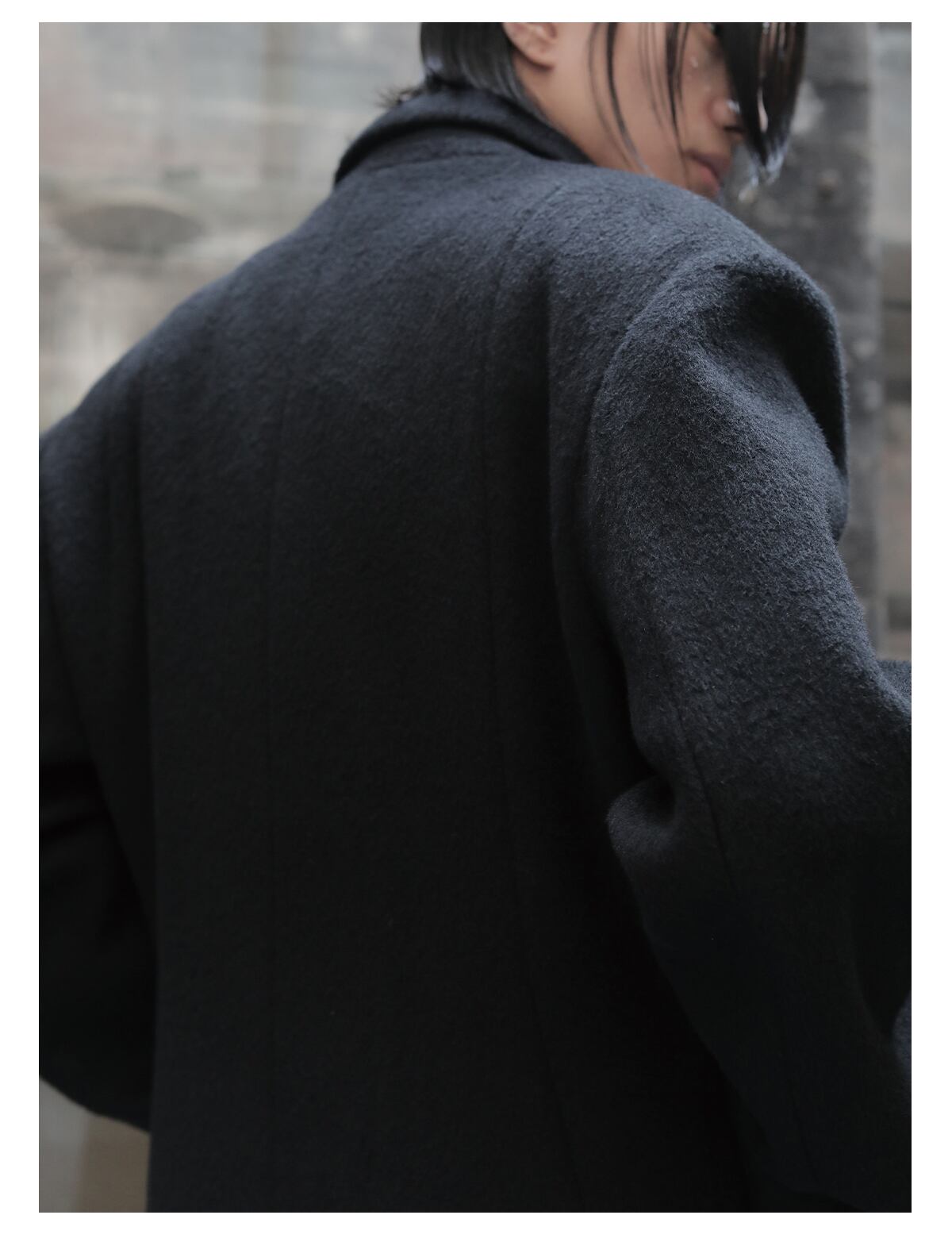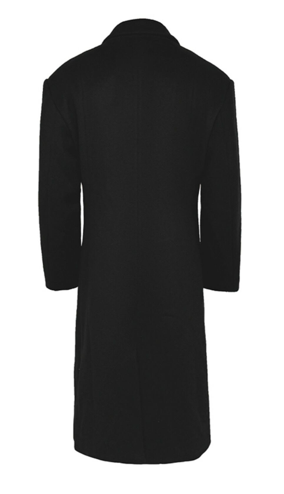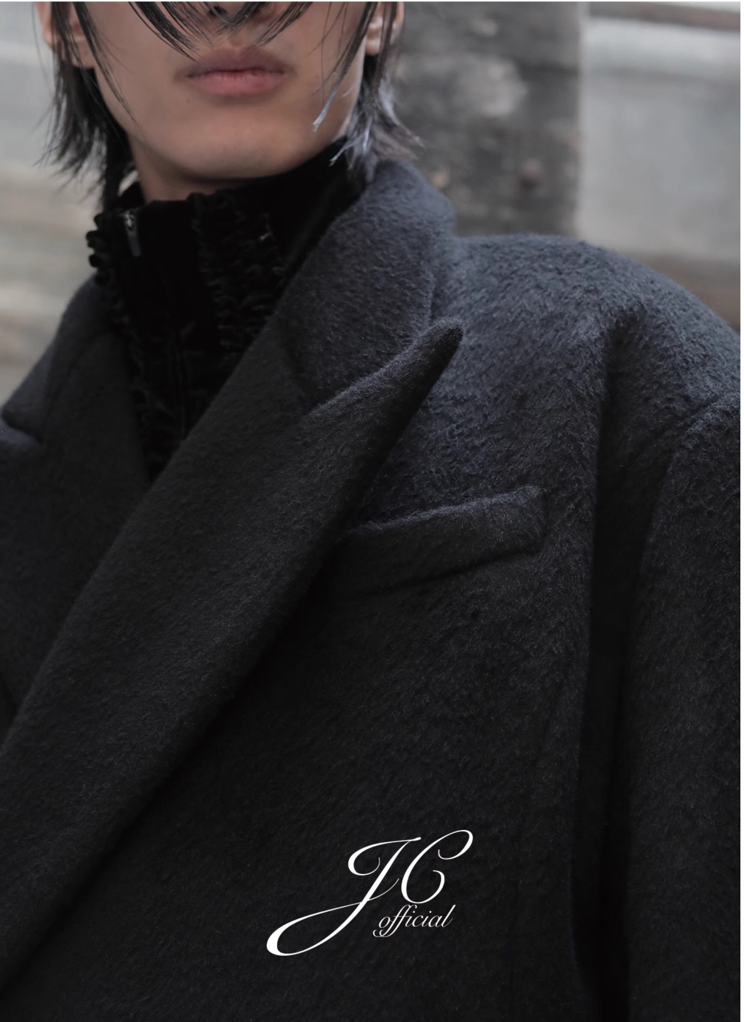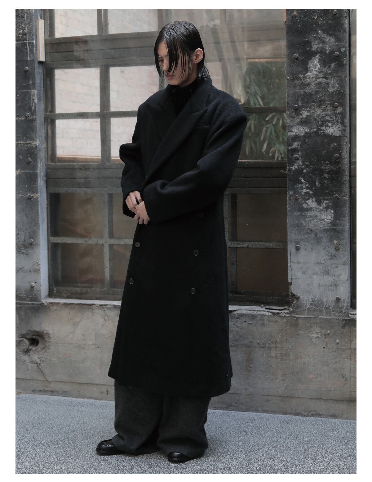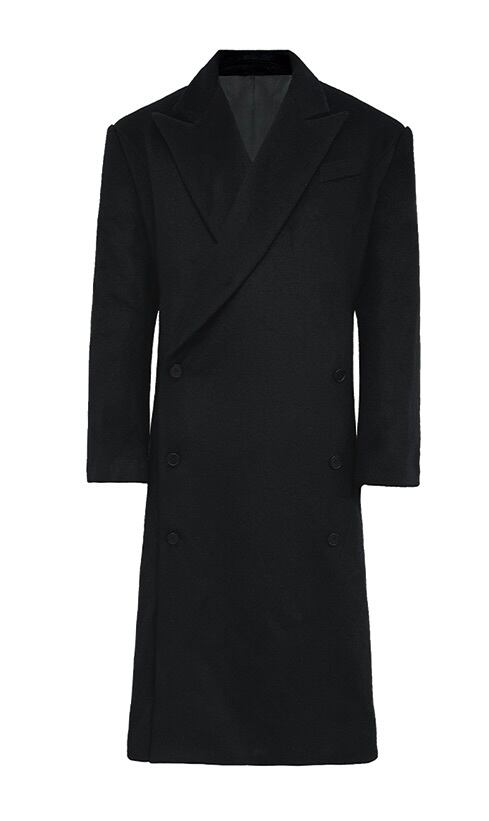 クラシックなピークドラペルとダブルブレスト仕様が特徴で、洗練されたエレガンスを演出。