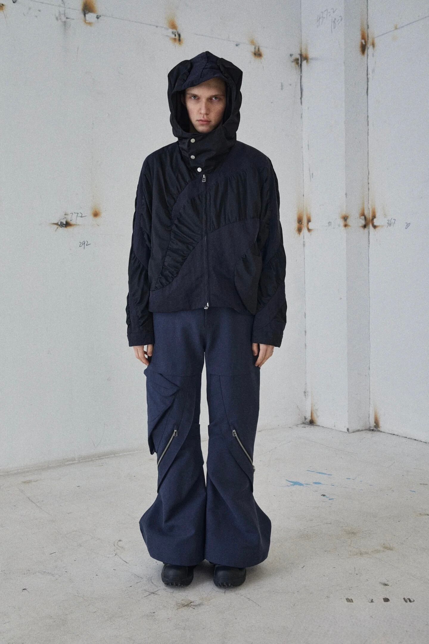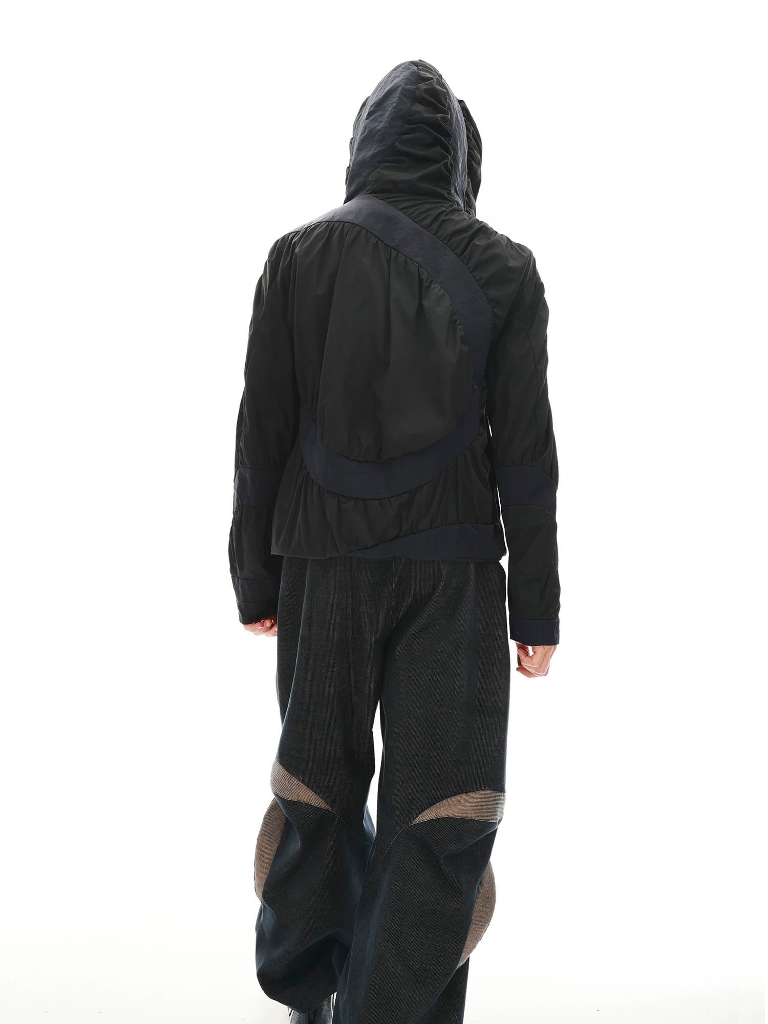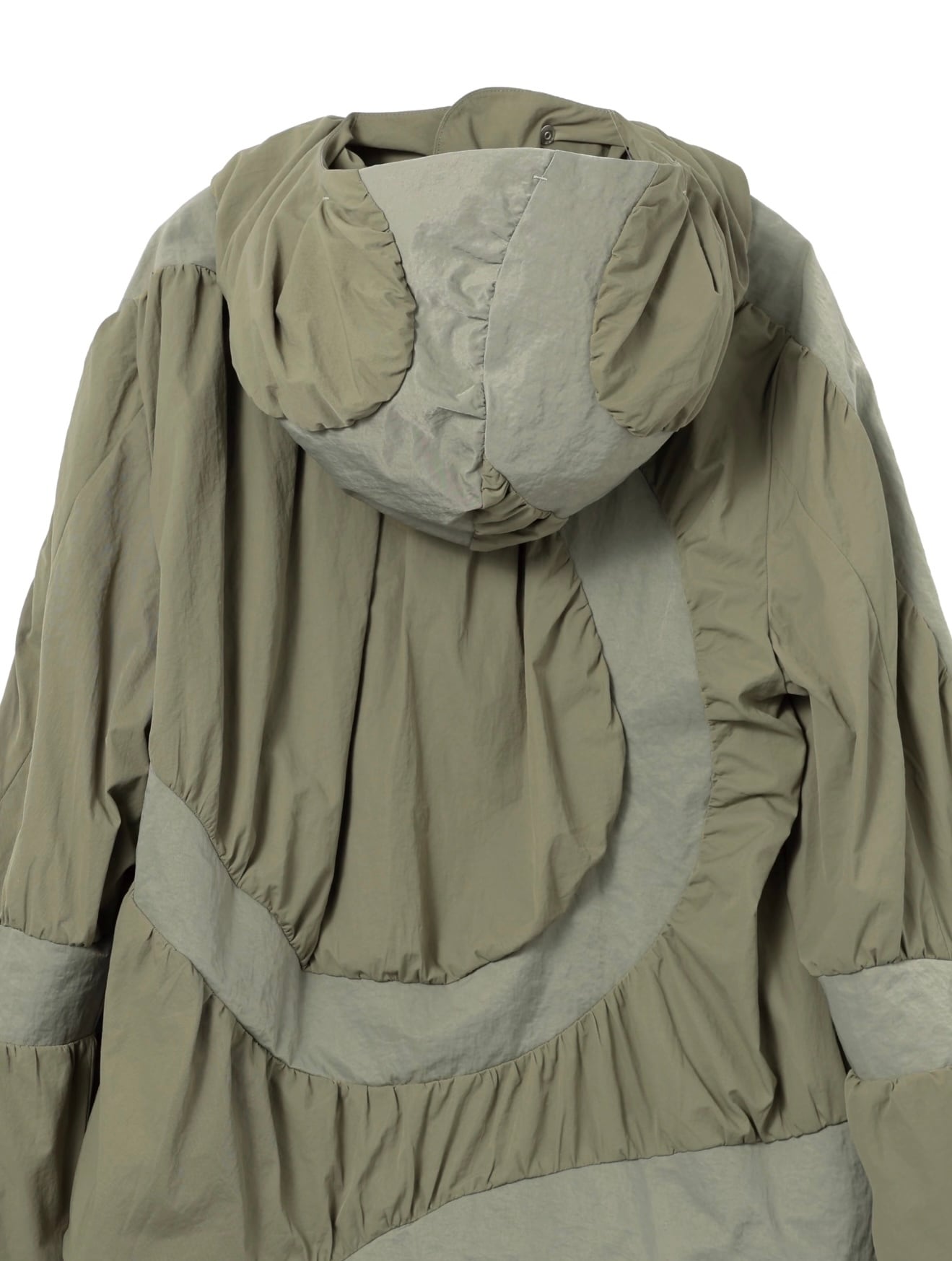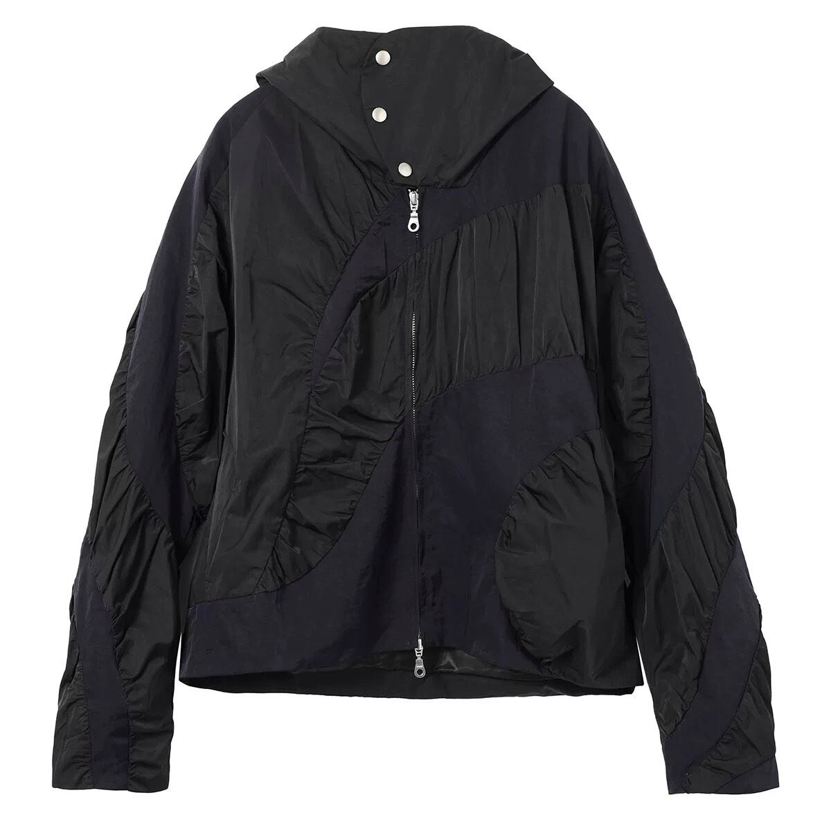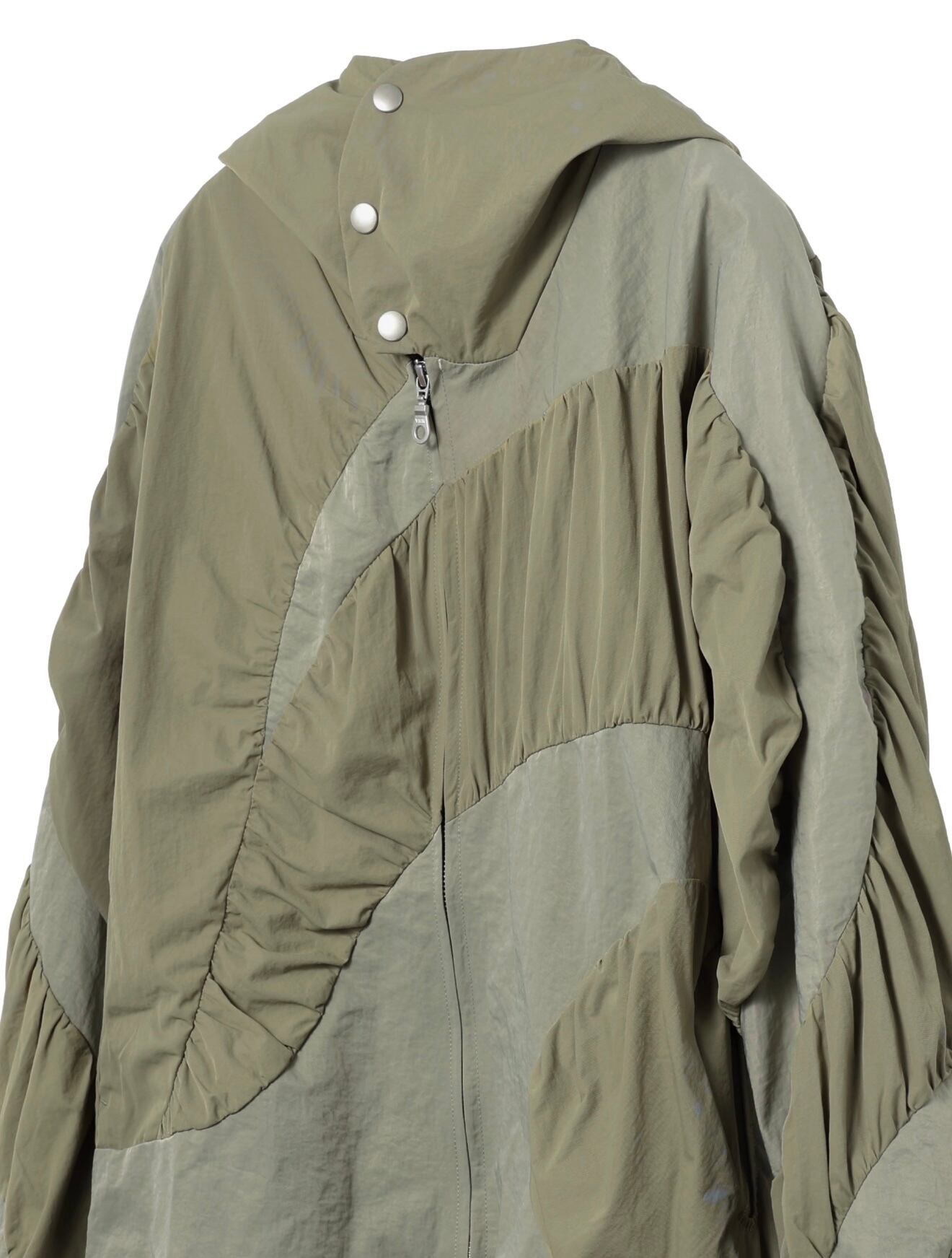 複数のパーツを組み合わせたレイヤード感のあるカッティングとギャザー加工、そして流体のような美しい曲線のパネル切り替えが、錯綜したボリューム感と扇形のユニークなシルエットを構築。同系色の配色切り替えデザインが、アイテム全体のボリュームを視覚的に分解し、ストリートアートのような斬新で個性的なスタイルを完成させます。